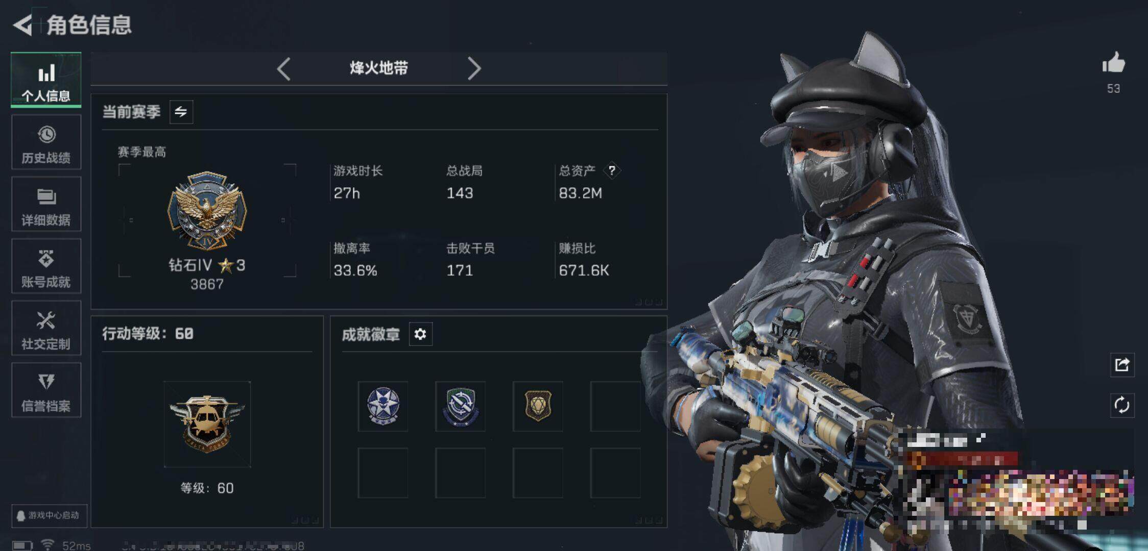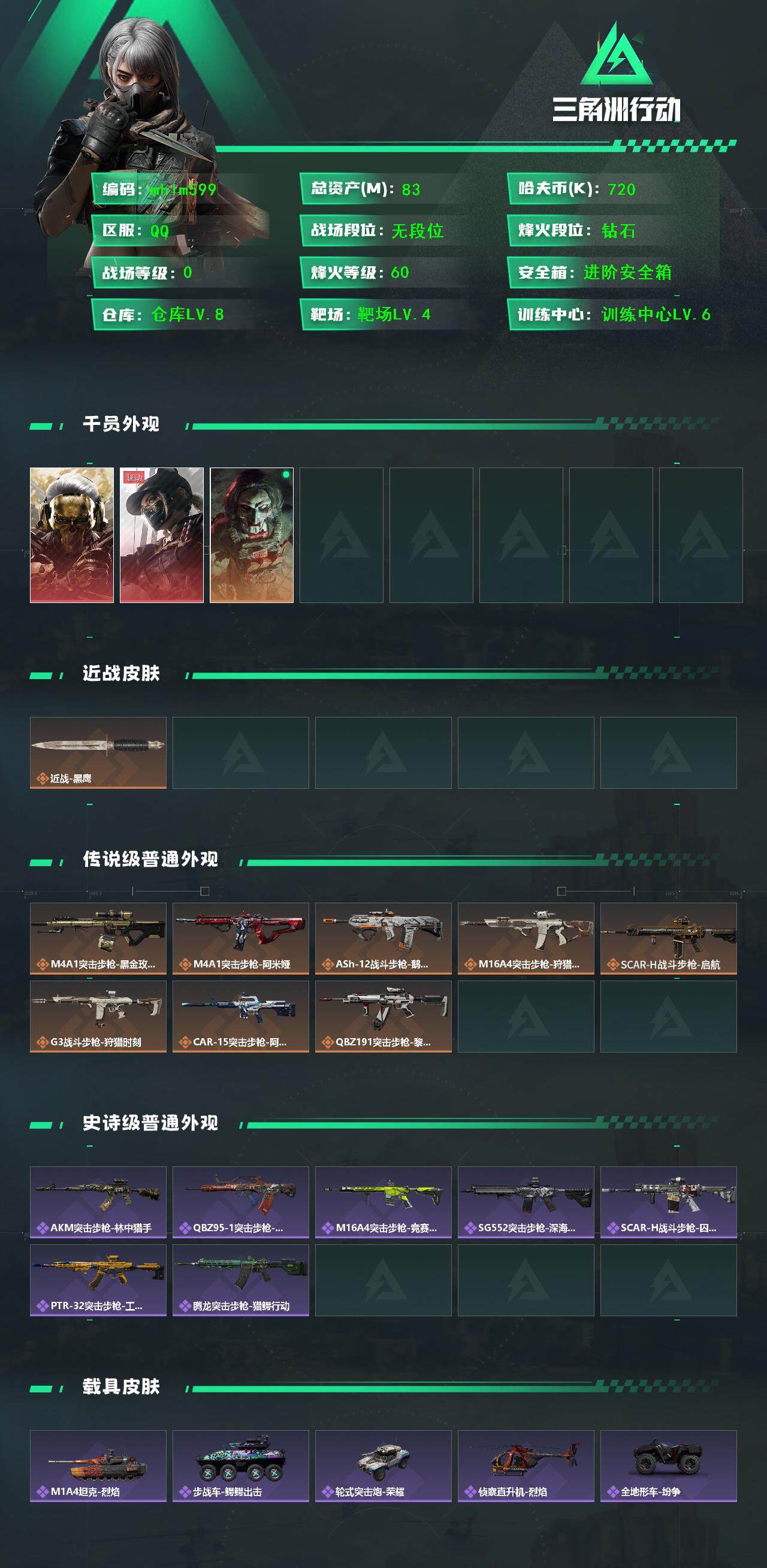 【mhlm599】总资产:83.2M,哈夫币:72W,武器皮肤169,烽火60级:钻石,通行证53级:通行证免费版 【安全箱】进阶安全箱;【特勤处等级】仓库LV.8,指挥中心LV.4,训练中心LV.6,靶场LV.4,潜水中心LV.1,收藏室LV.0;【干员皮肤3】:红狼蚀金玫瑰,露娜黑天际线,红狼电锯惊魂;【已有捆绑包6】:蚀金玫瑰捆绑包,狩猎时刻捆绑包,黑天际线捆绑包,鹅鸭杀捆绑包,电锯惊魂干