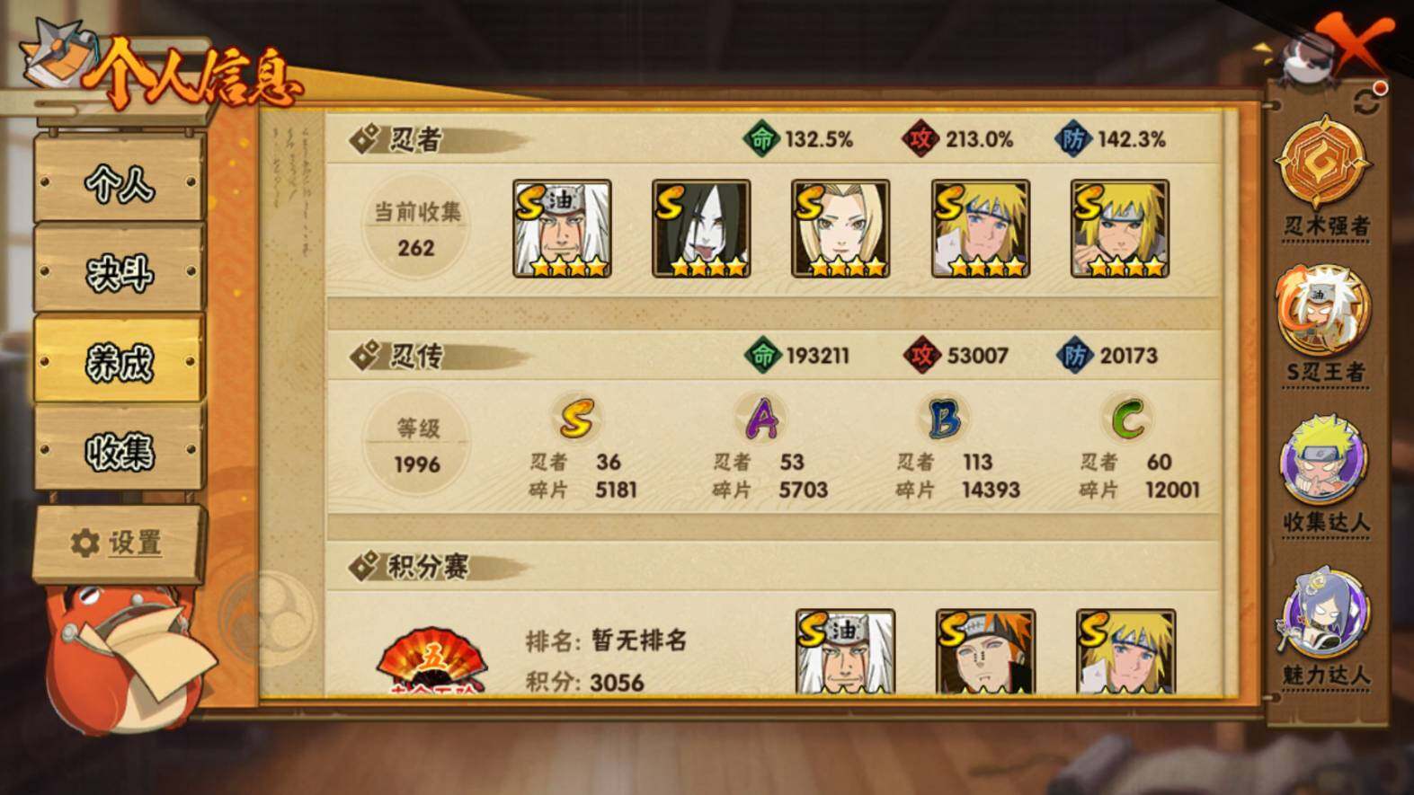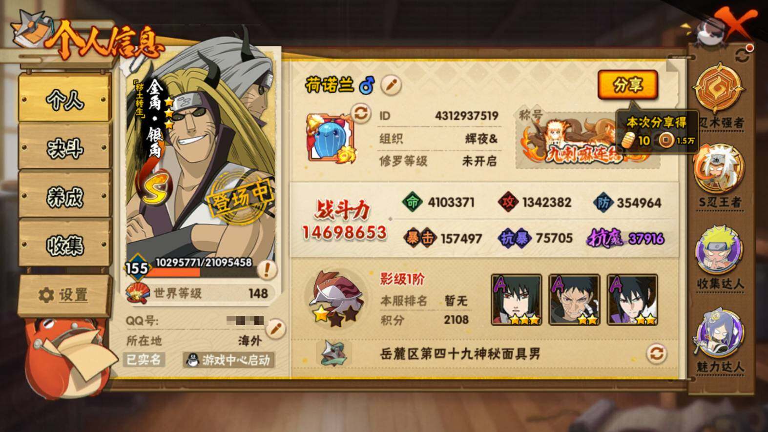 v11 1469w战力 36S级忍者数-53A级忍者数 须佐能乎宇智波止水65片 四代目风影罗砂70片 三代目雷影艾75片 秽土转生半藏80片 天道超81片 YH7031