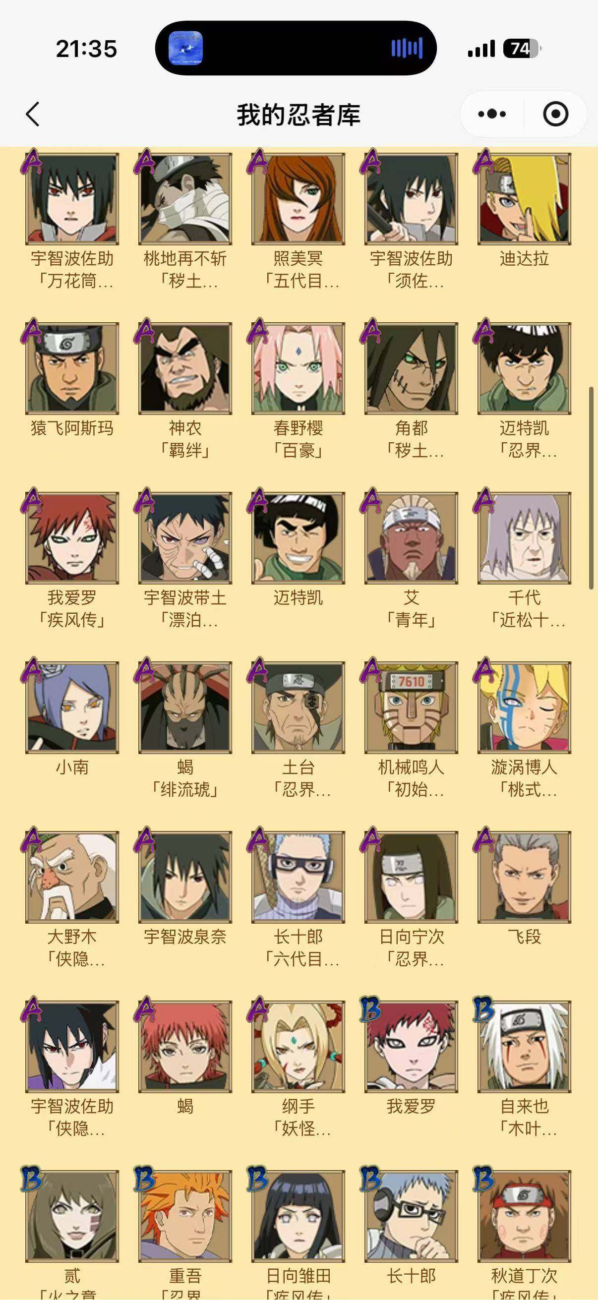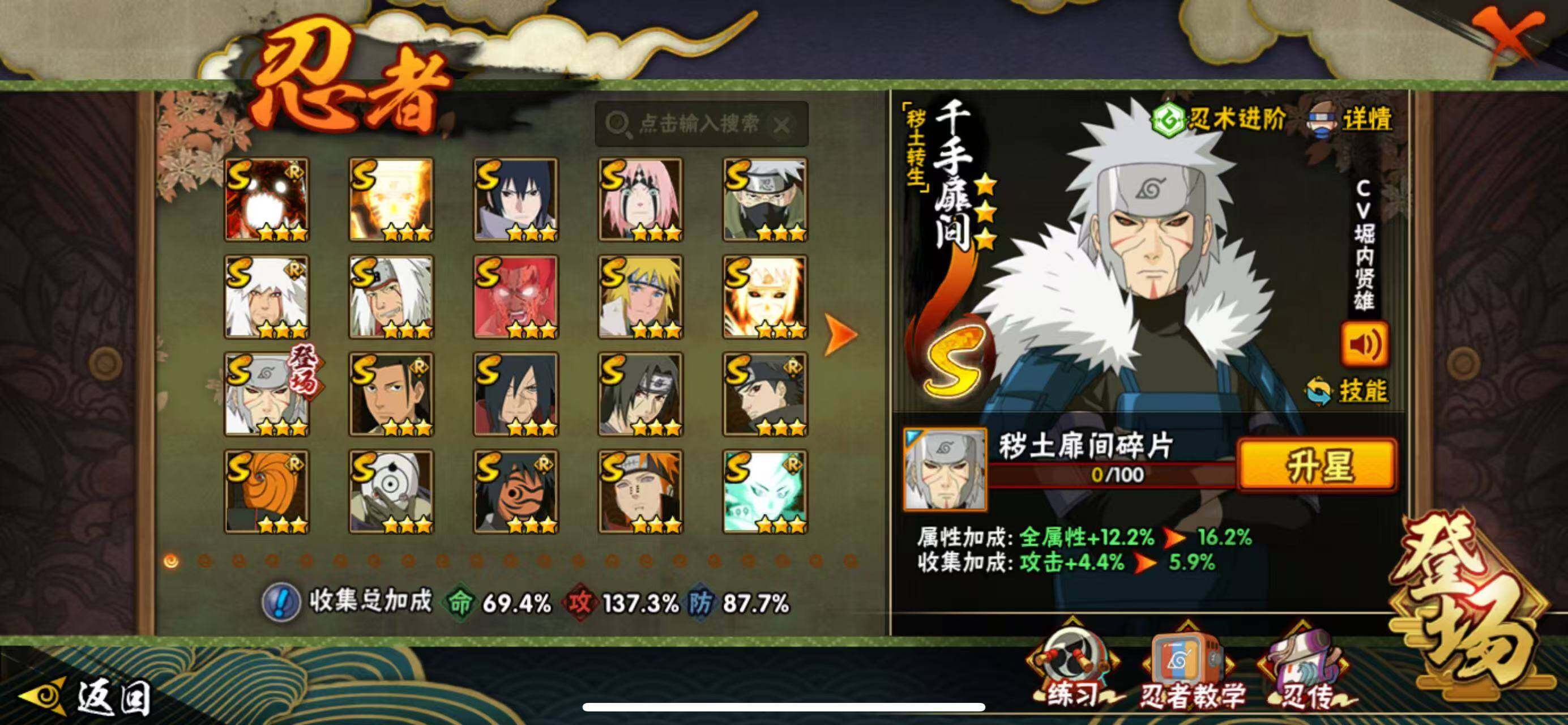 【S级忍者】:千手扉间「秽土转生」(3星),宇智波斑「秽土转生·解」(3星),春野樱「忍界大战」(3星),宇智波鼬「须佐能乎」(3星),宇智波止水「须佐能乎」(3星),旗木卡卡西「须佐能乎」(3星),千手柱间「木叶创立」(3星),自来也「舞之豪杰」(3星),自来也「传说中的三忍」(3星),波风水门(3星),神秘面具男「红夜之刃」(3星),漩涡鸣人「九喇嘛连
