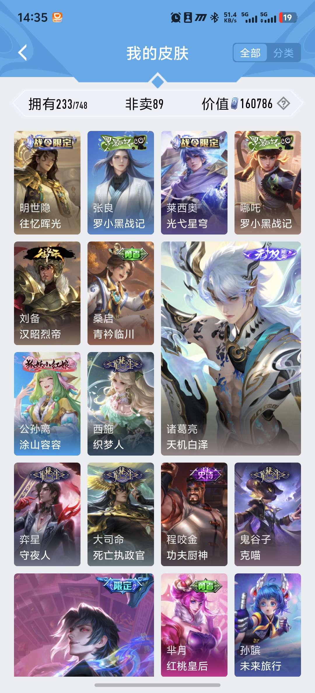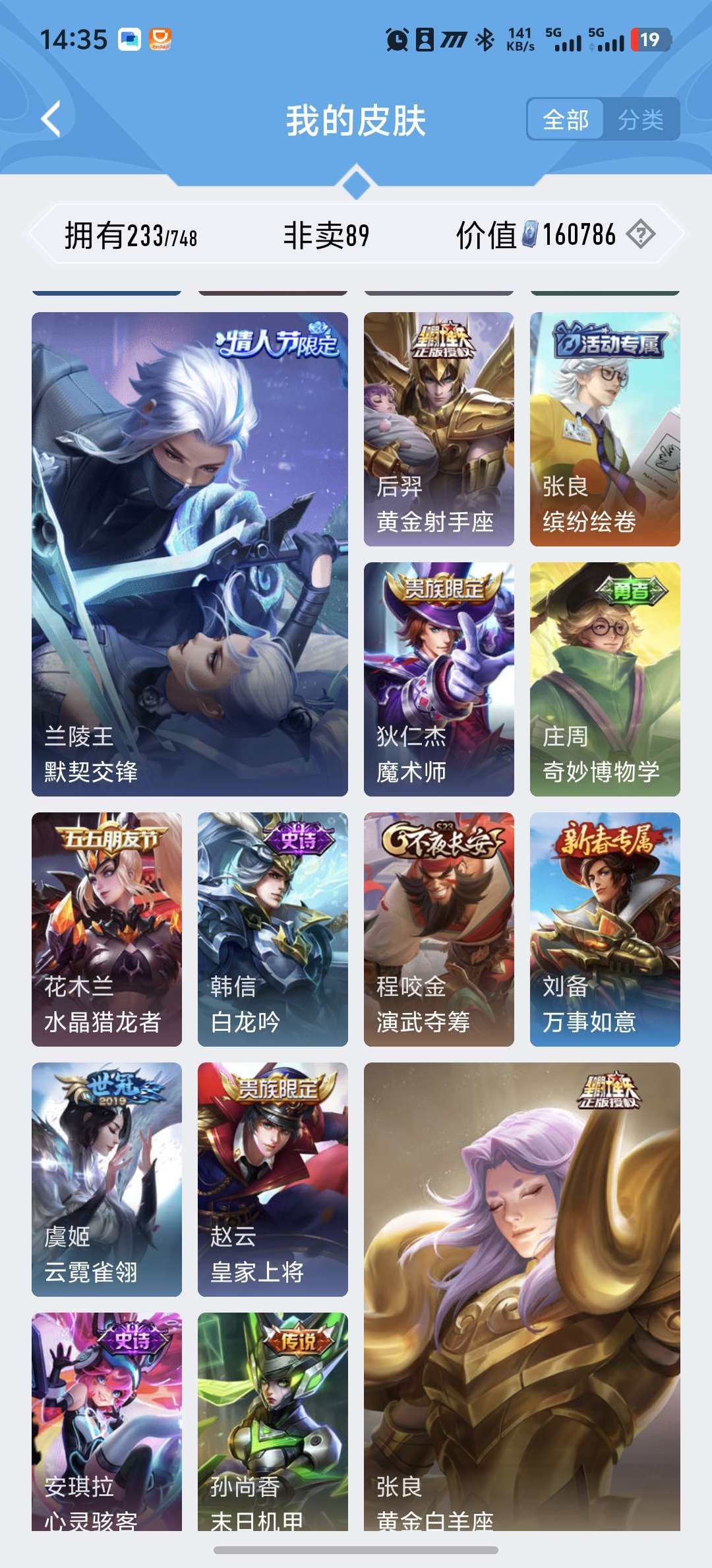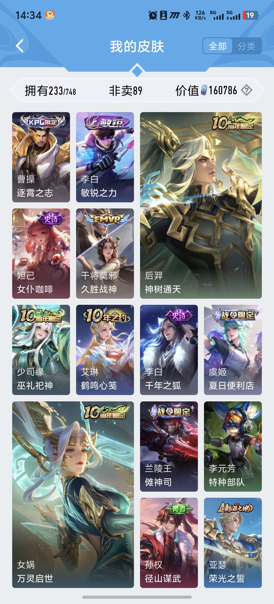 安卓QQ-16传说-1无双-233皮肤-127英雄-至尊星耀-全英雄就差一个武则天,233个皮肤1无双16传说以及很多限定