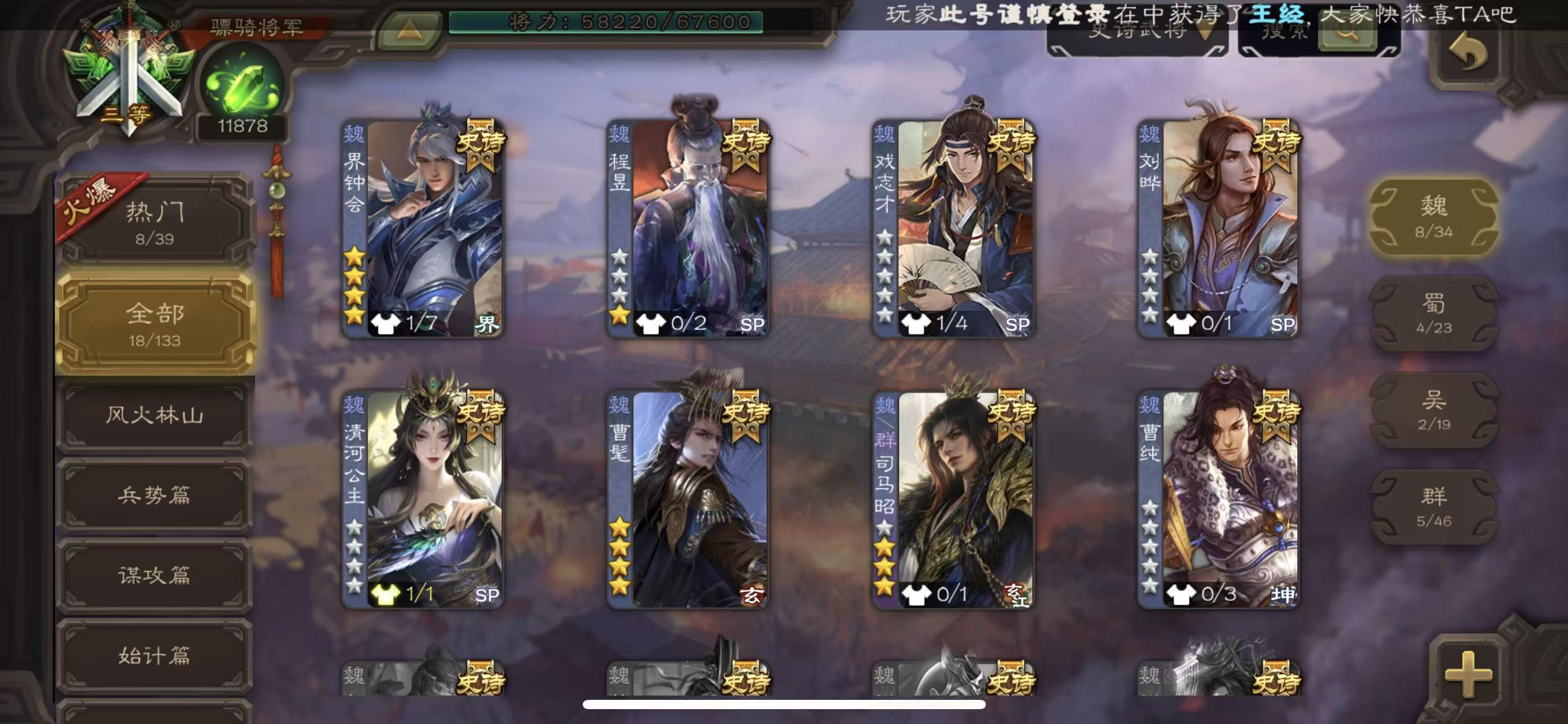 骠骑18史诗曹髦司马昭动态陆郁生动态清河公主11万羽毛万将魂乌鸦界钟会动态戏子大宝星黄忠许攸