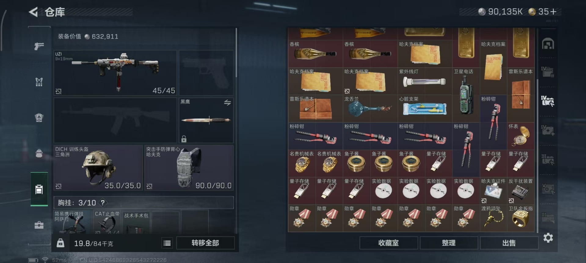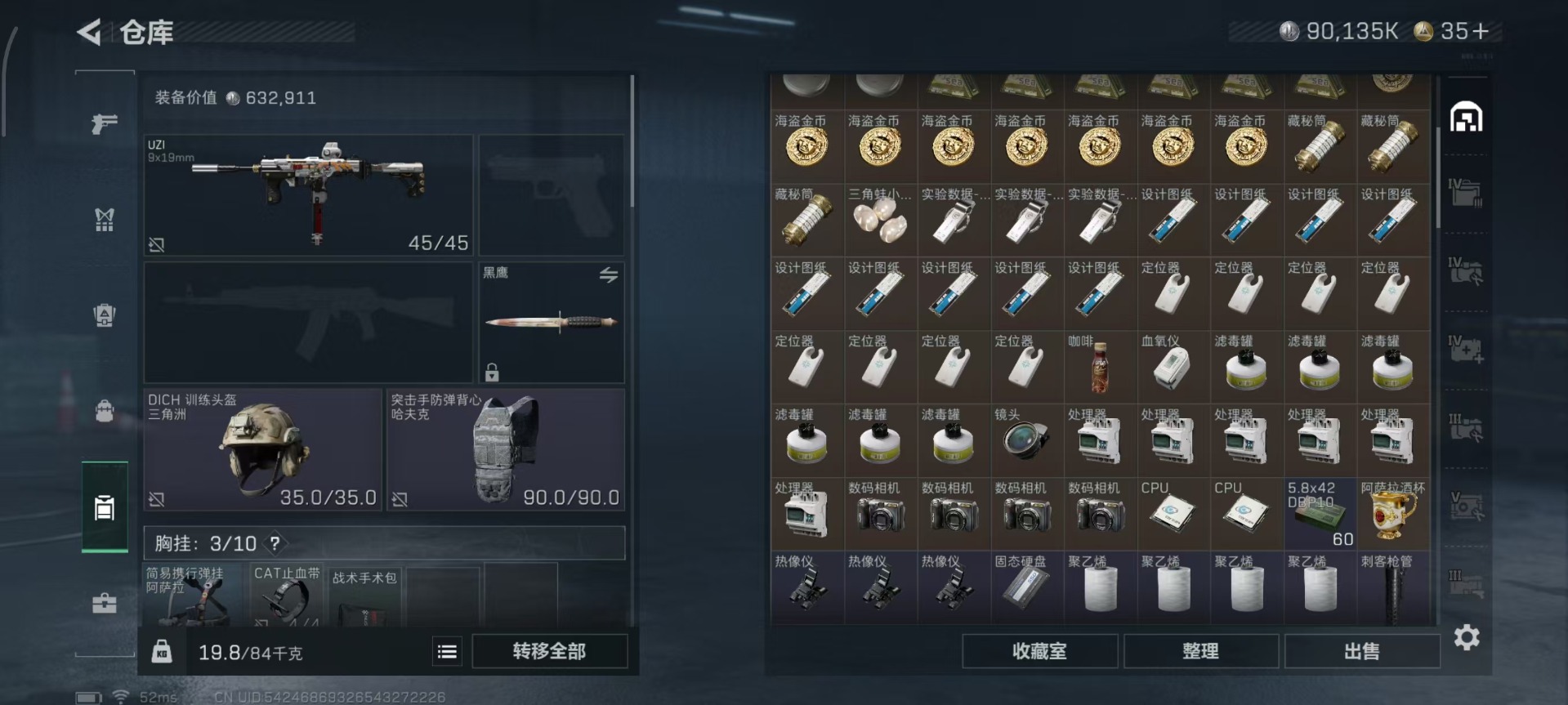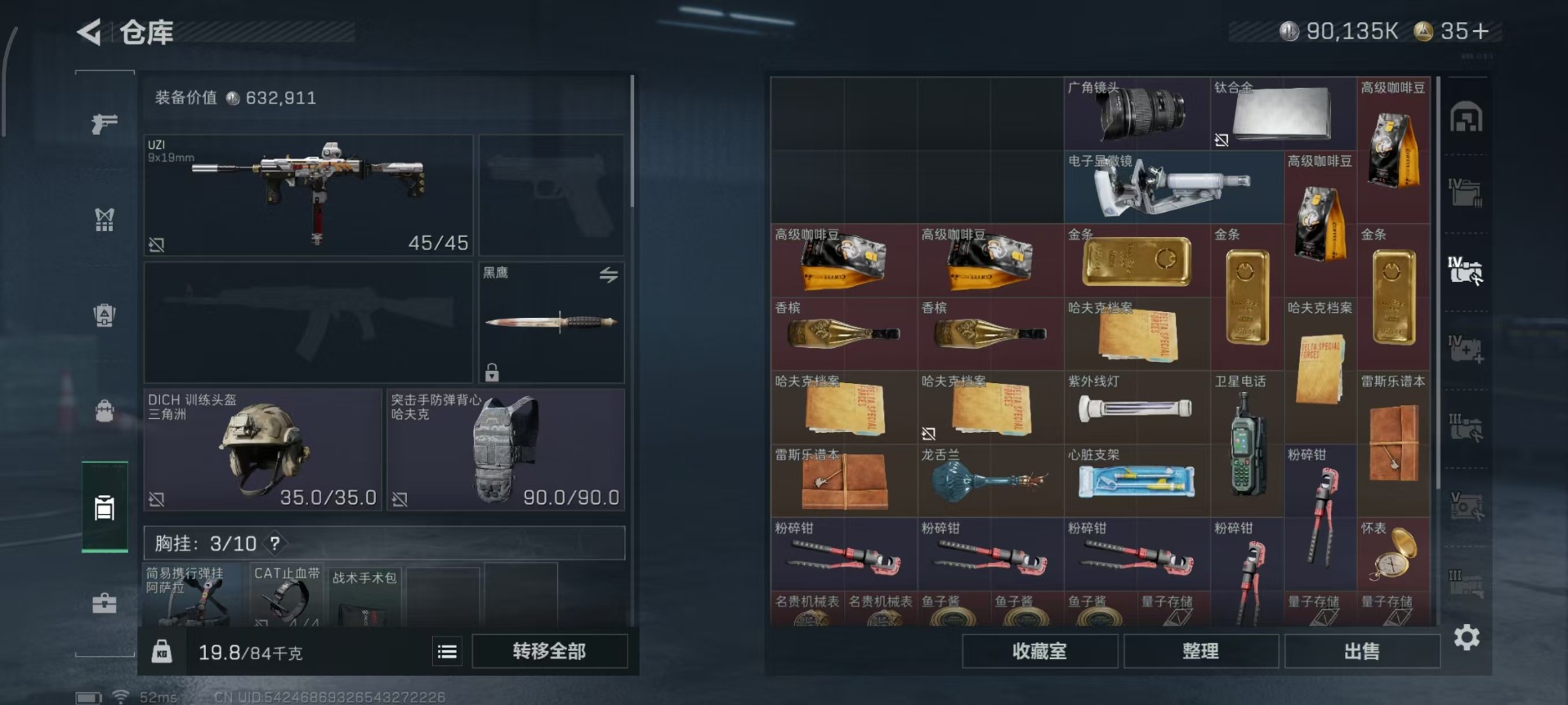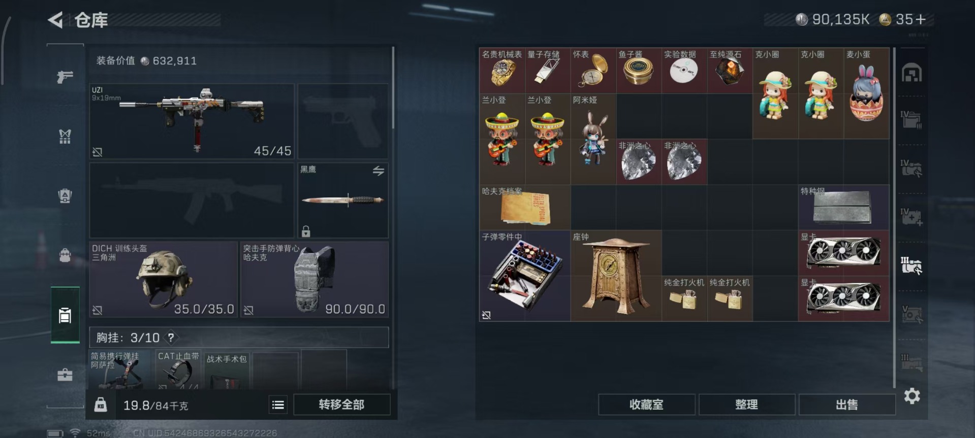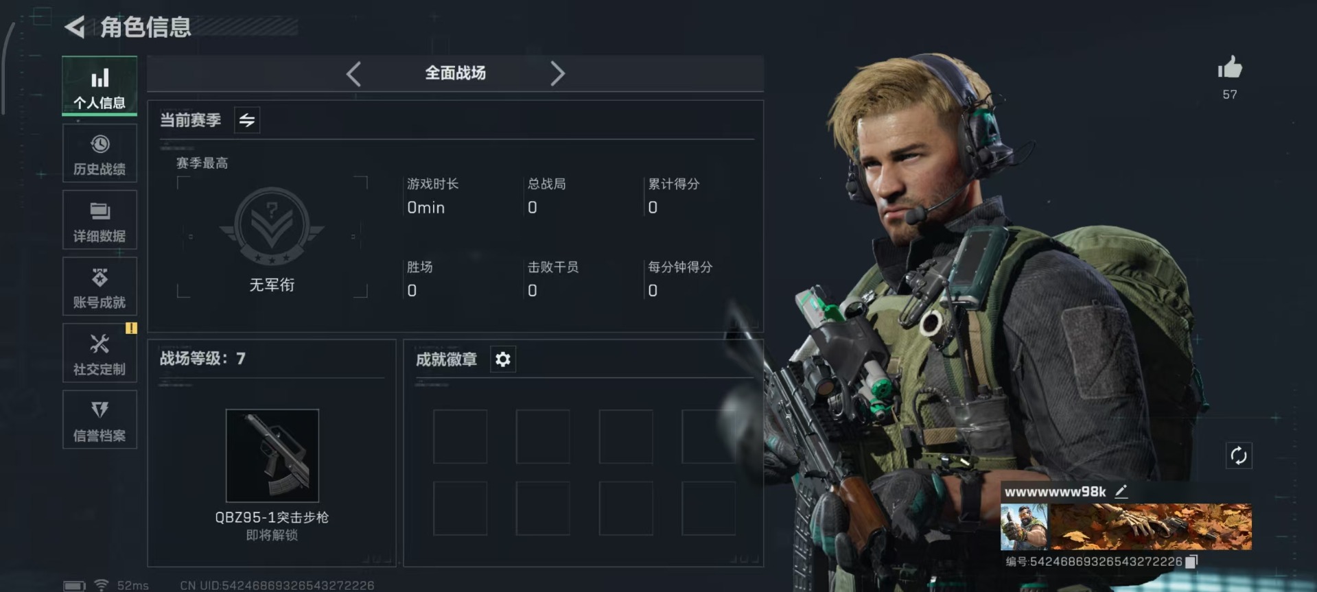 总资产:328.6M 1干员外观 12传说枪械 哈夫币:90.135K 可二次 可修改实名