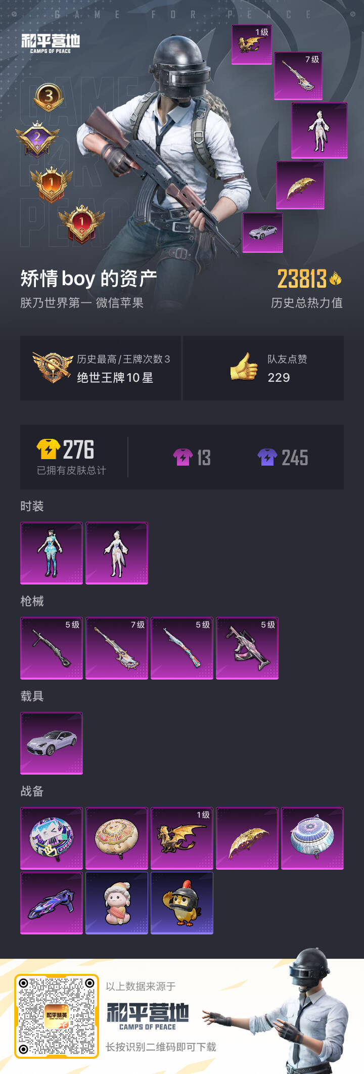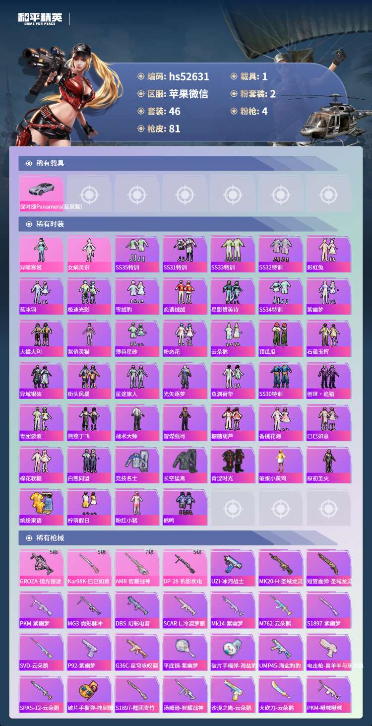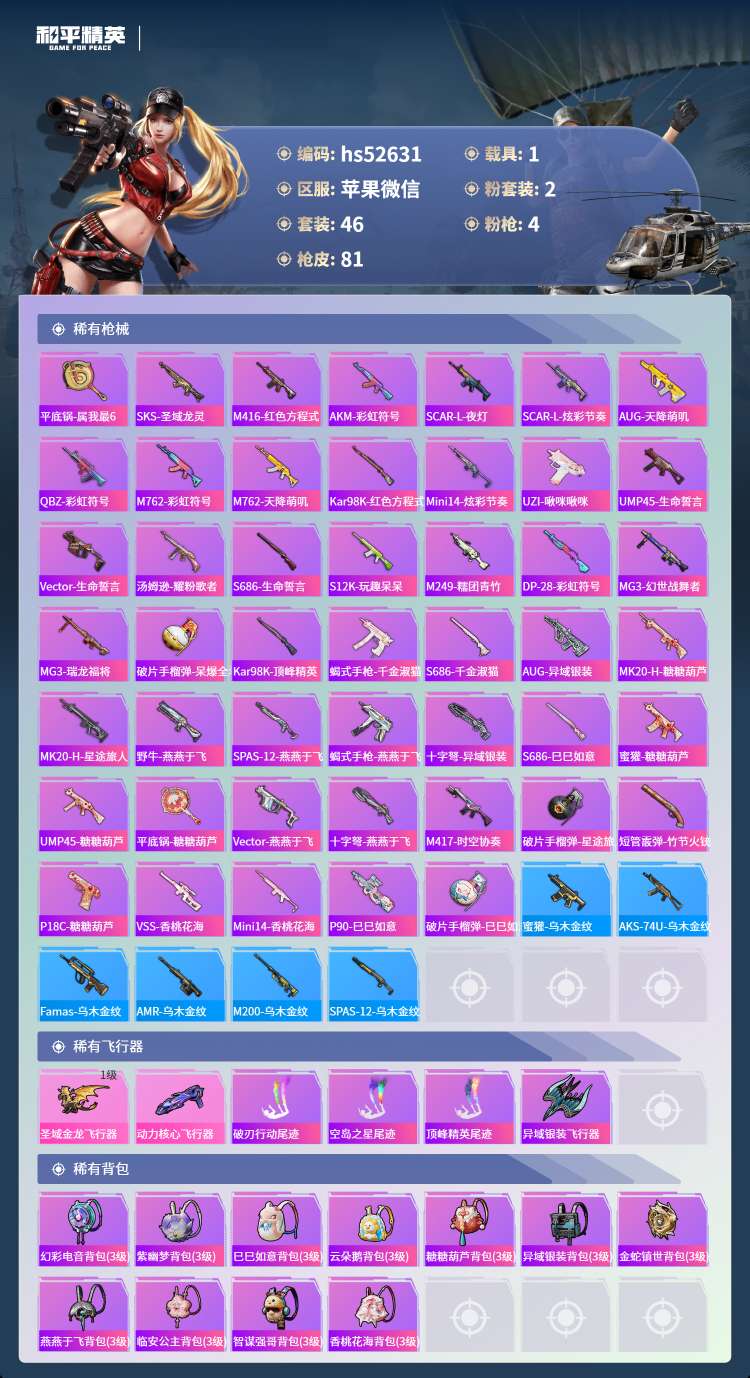 hs52631 苹果v-3王牌印记-2粉装-4特效枪-1载具-23813热力值-46套装-81枪皮