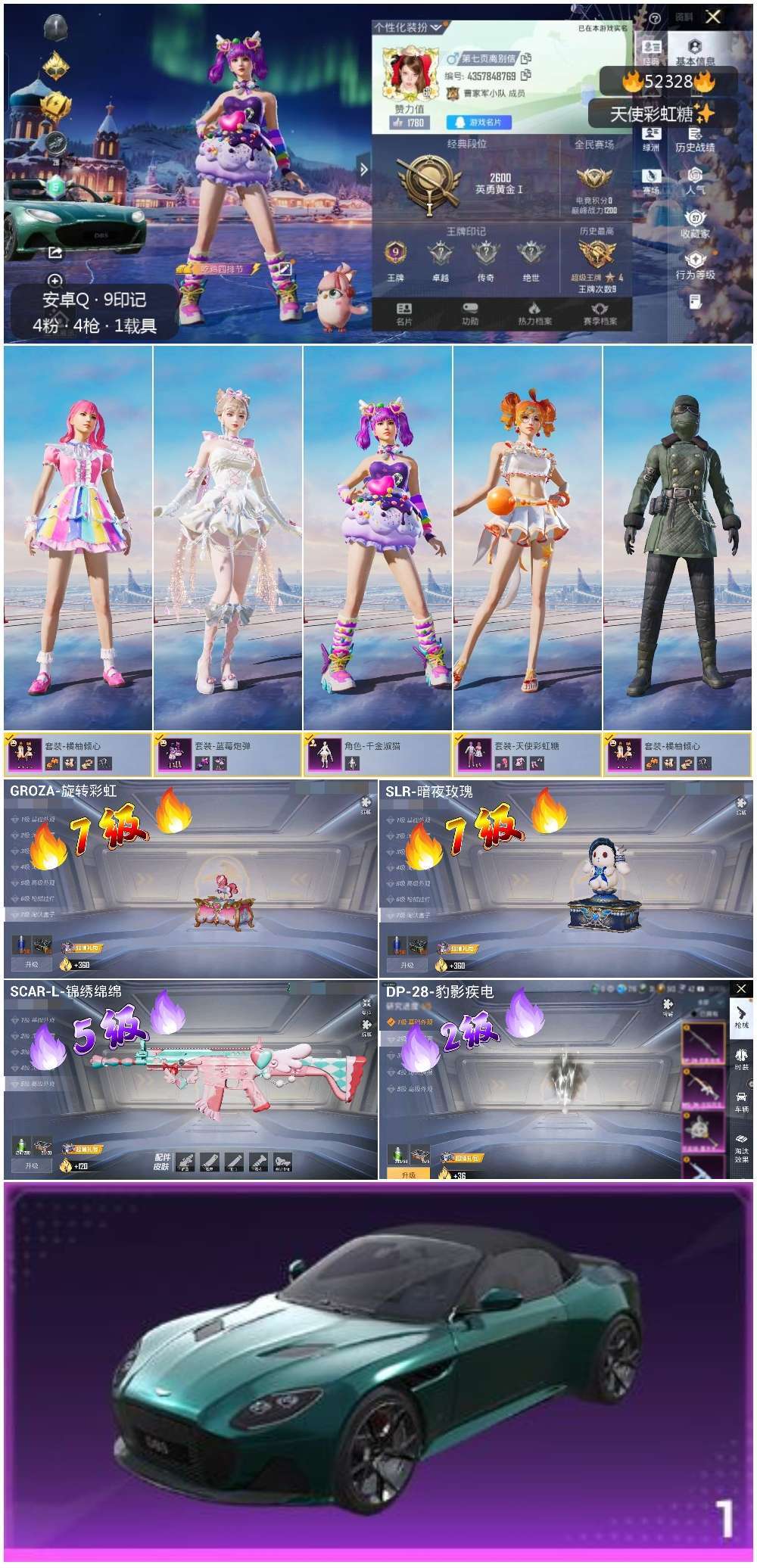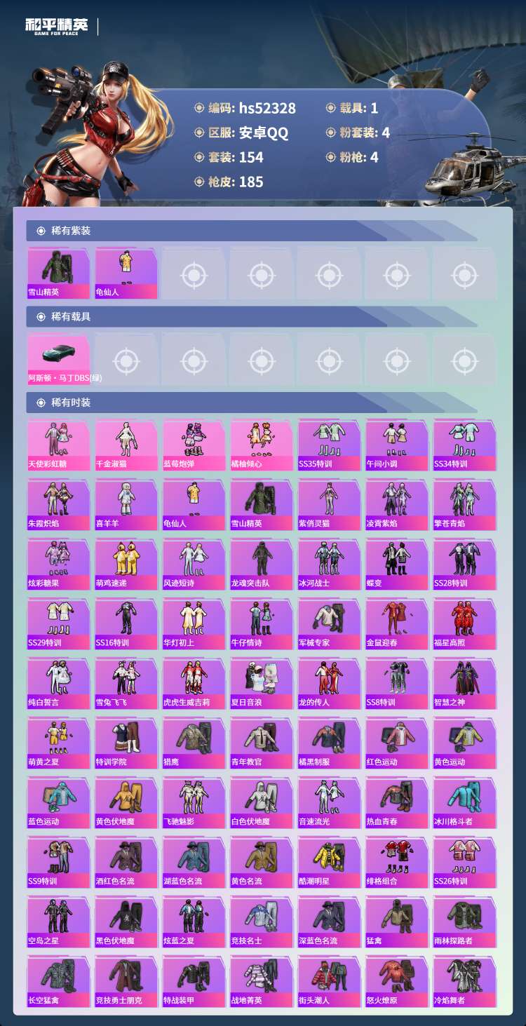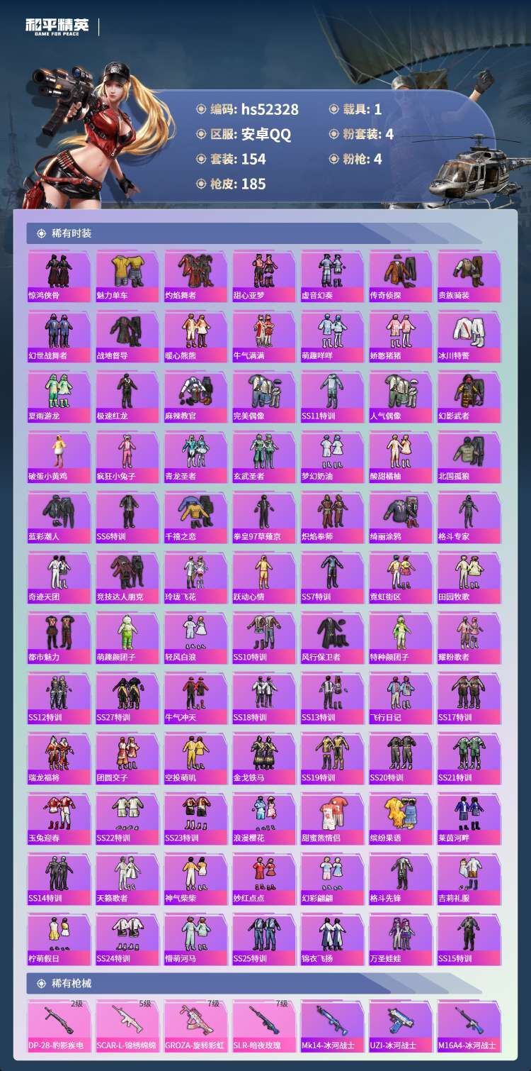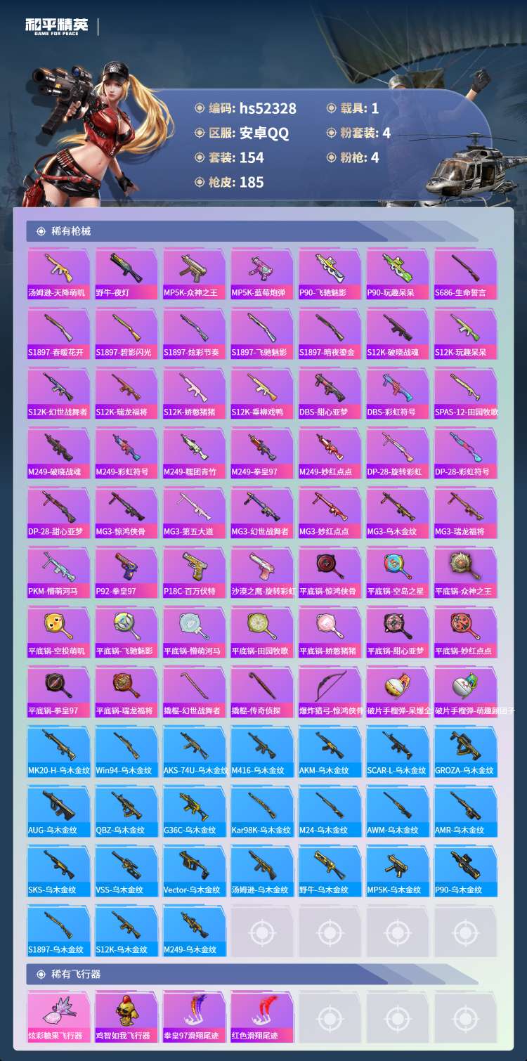 hs52328 安卓手Q-9王牌印记-4粉装-4特效枪-1载具-59627热力值-154套装-185