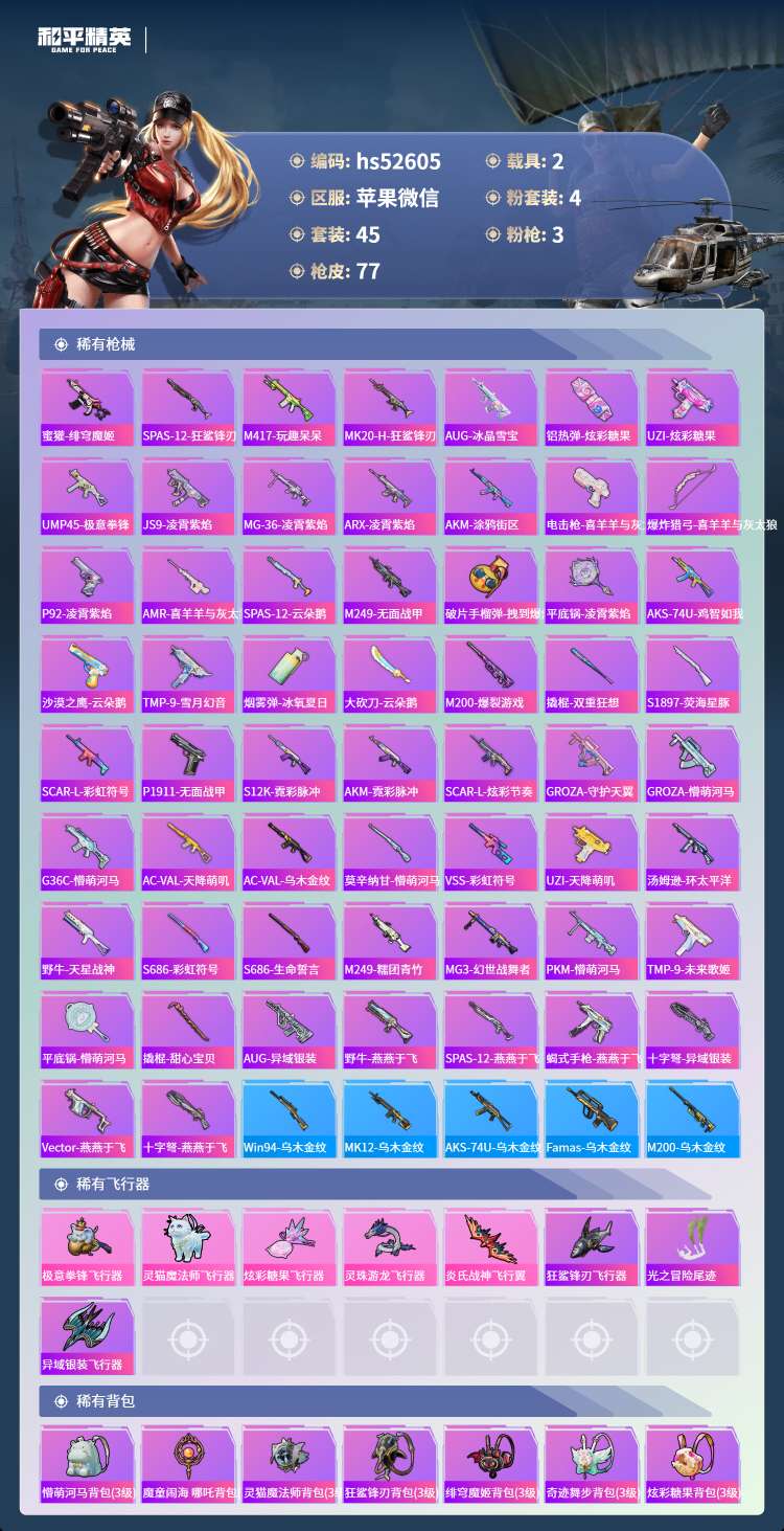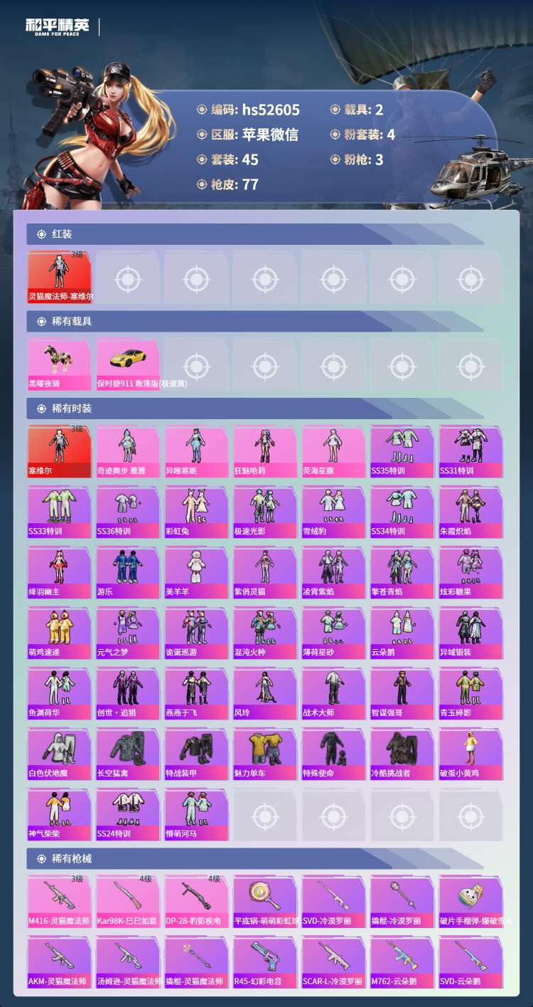 hs52605 苹果微-5王牌印记-1红装-4粉装-3特效枪-2载具-27525热力值-45套装-
