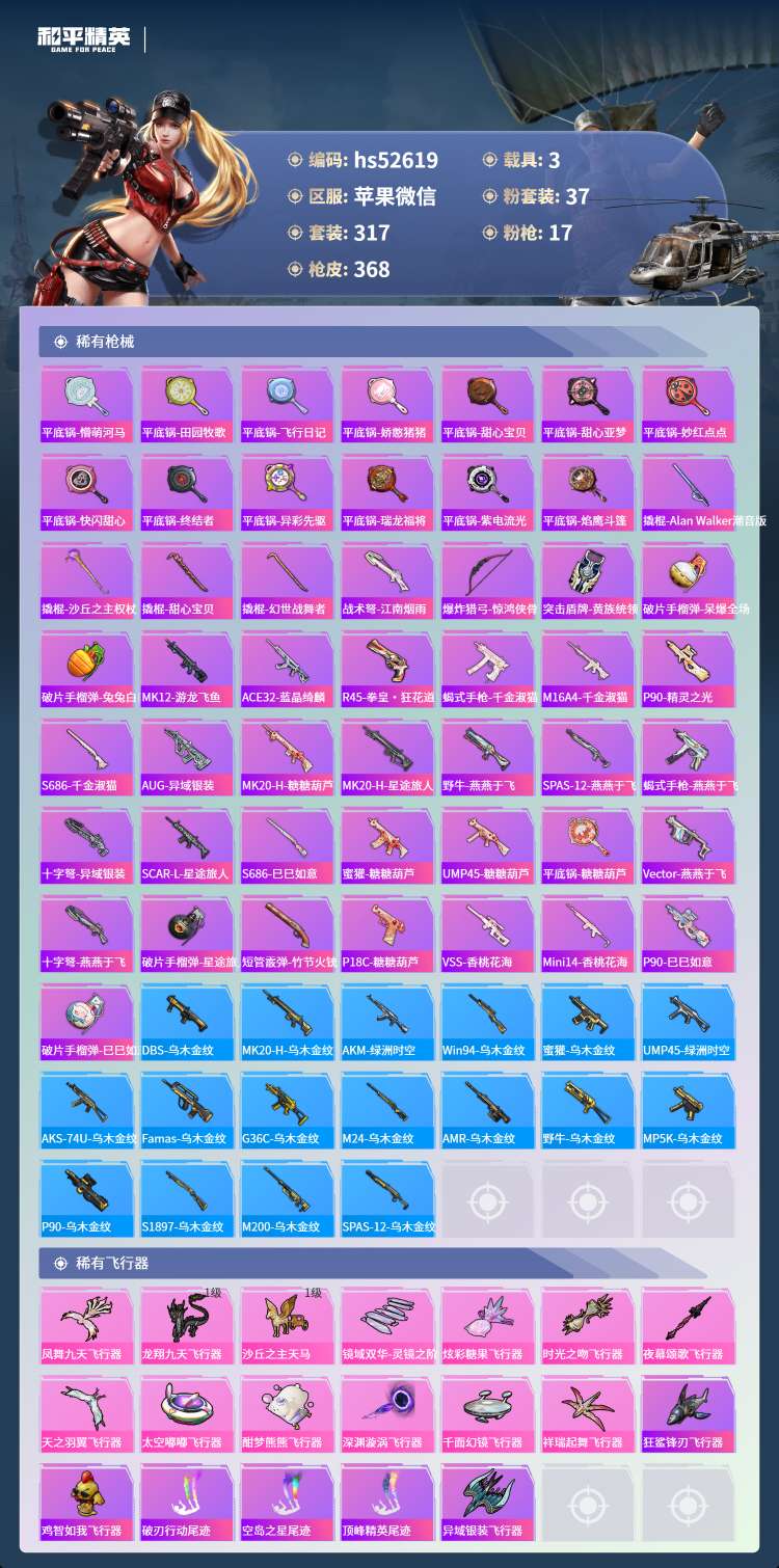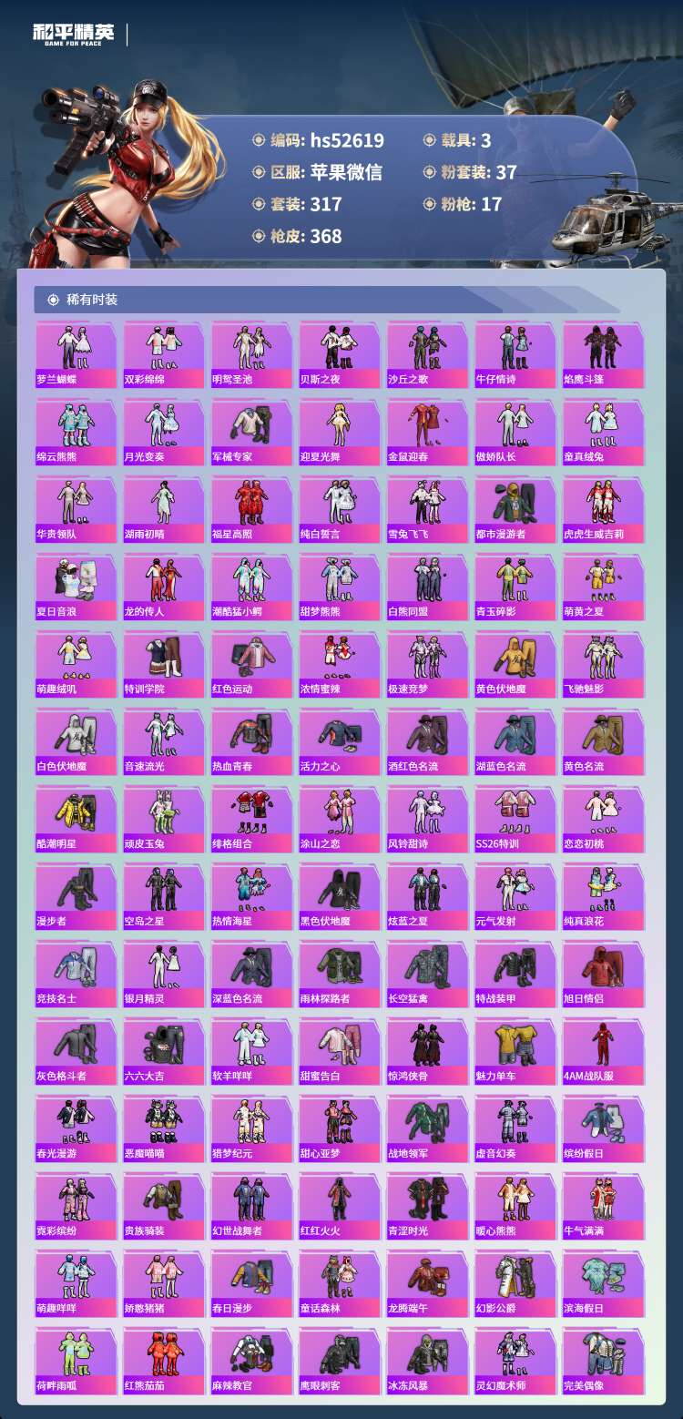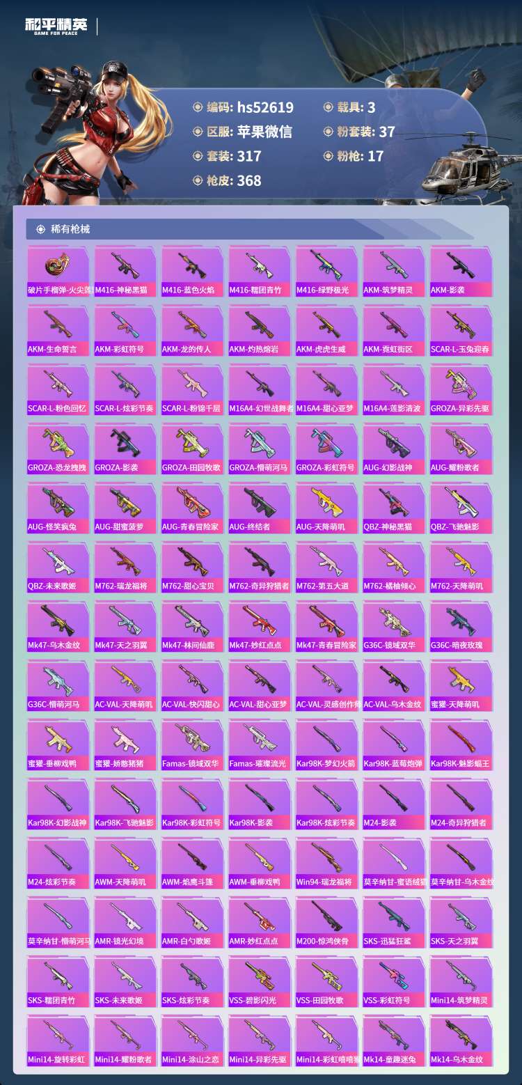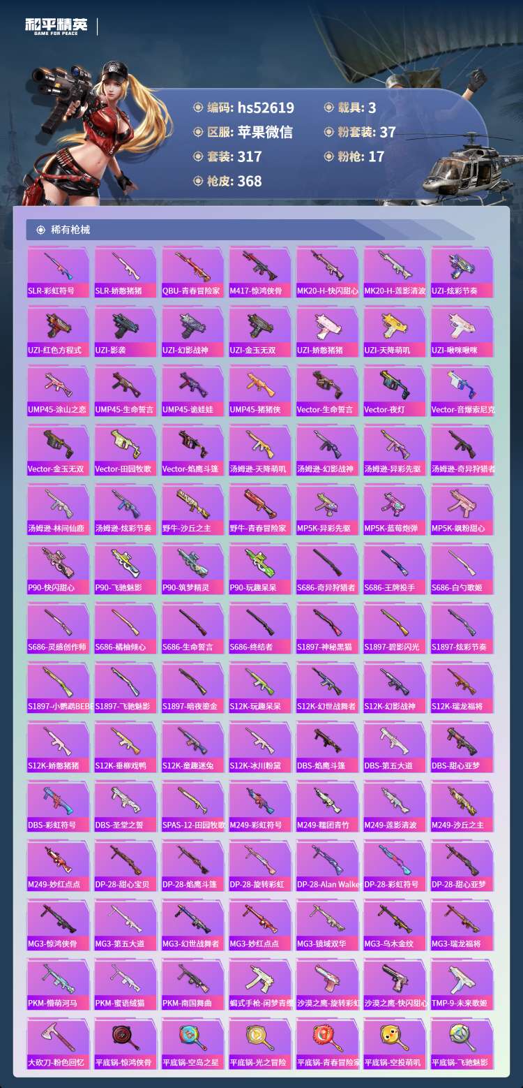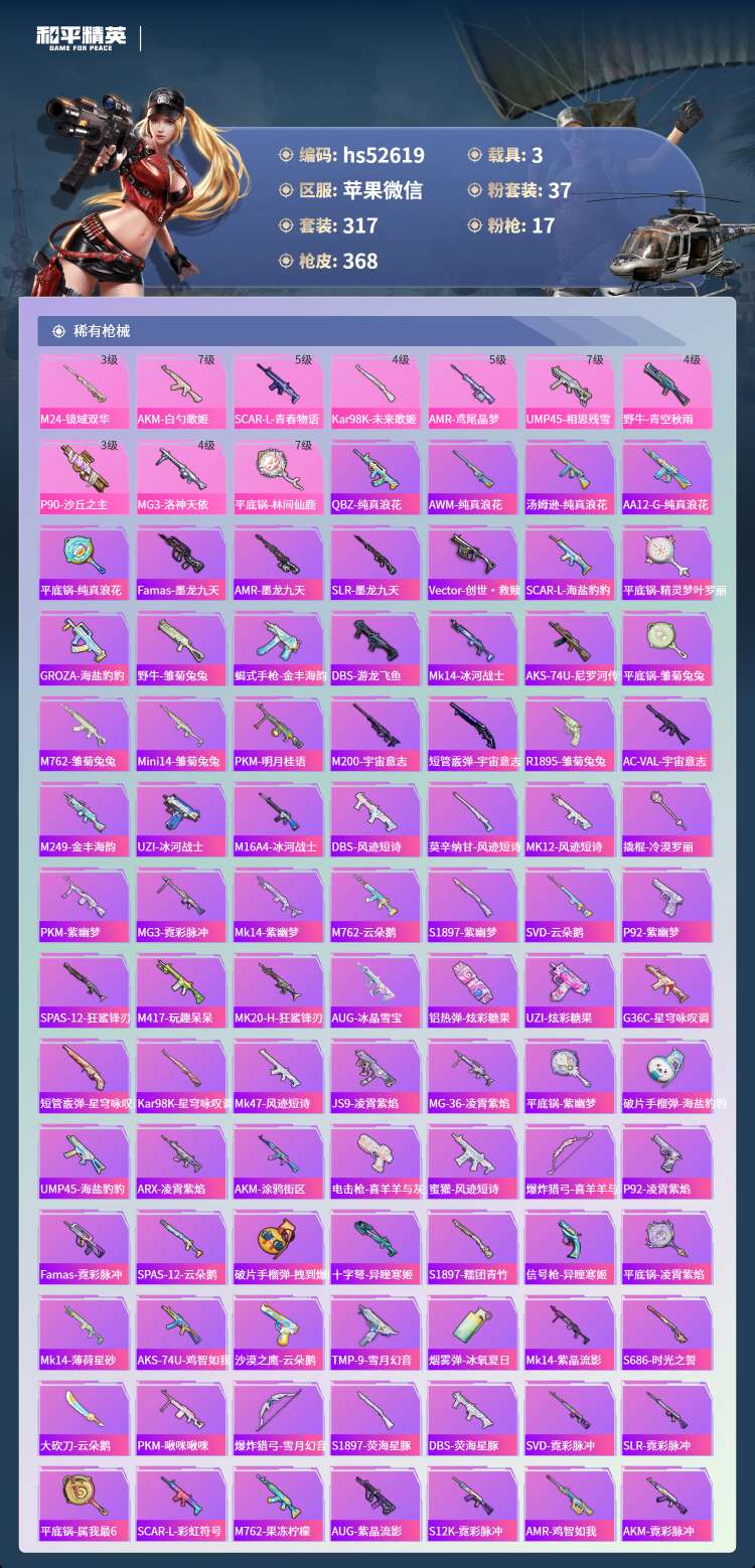 hs52619 苹果微-19王牌印记-1红装-37粉装-17特效枪-3载具-149817热力值-3
