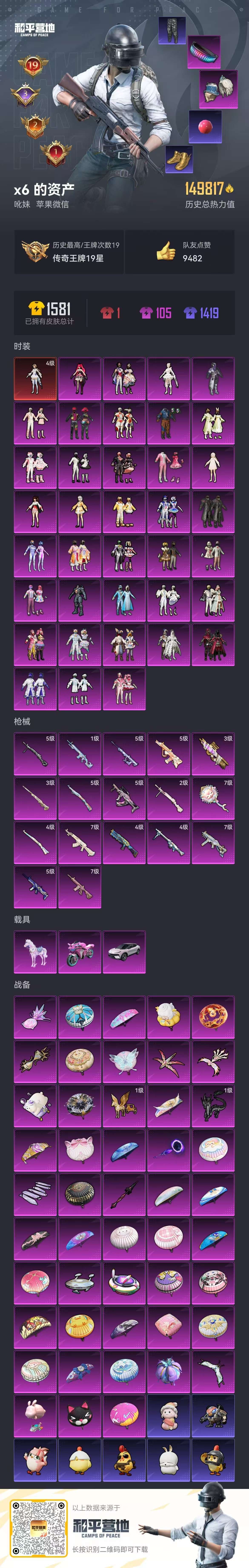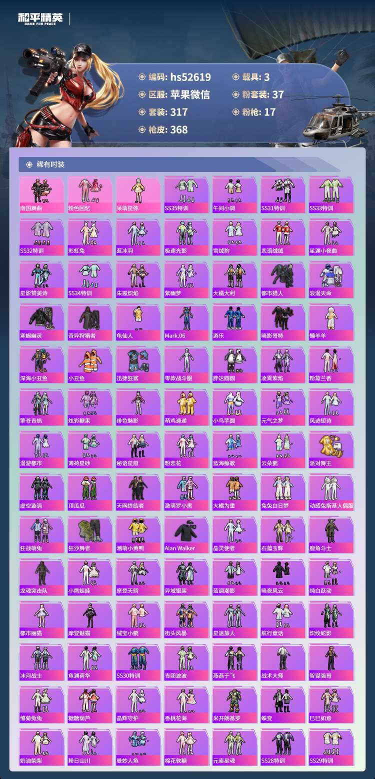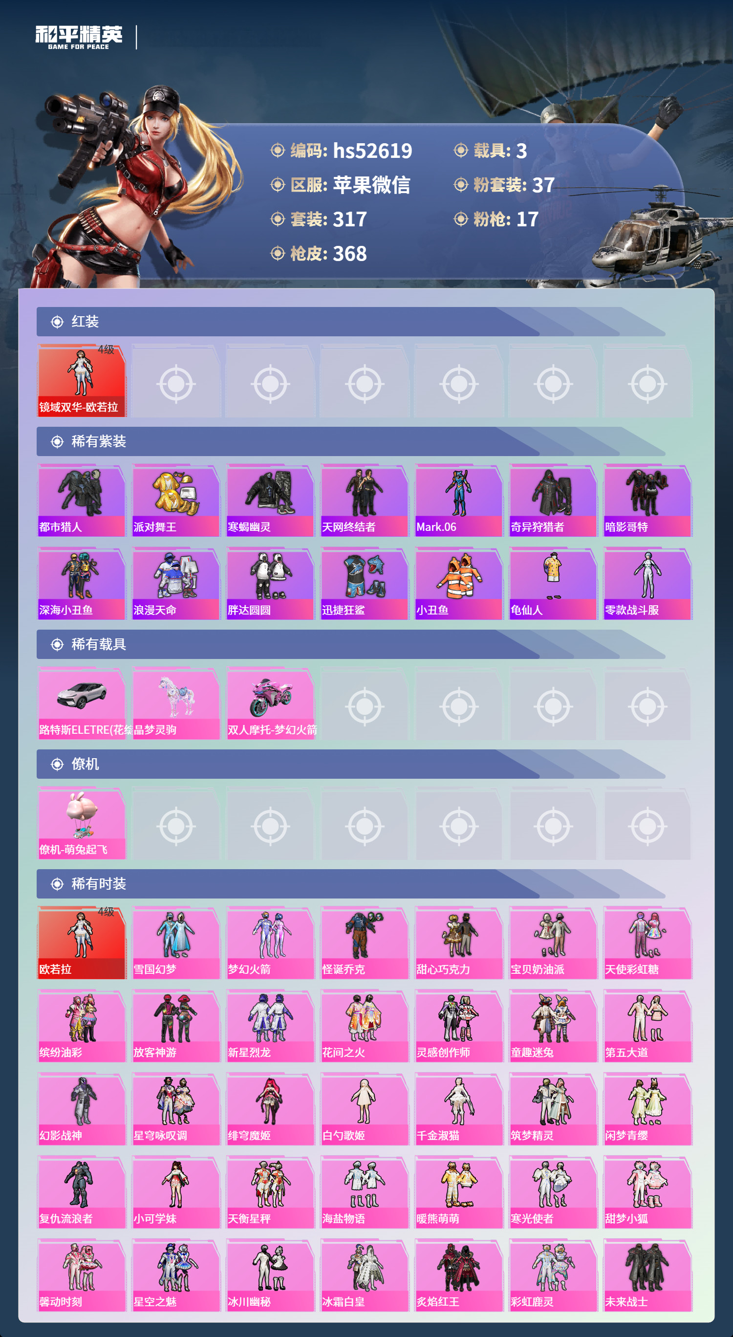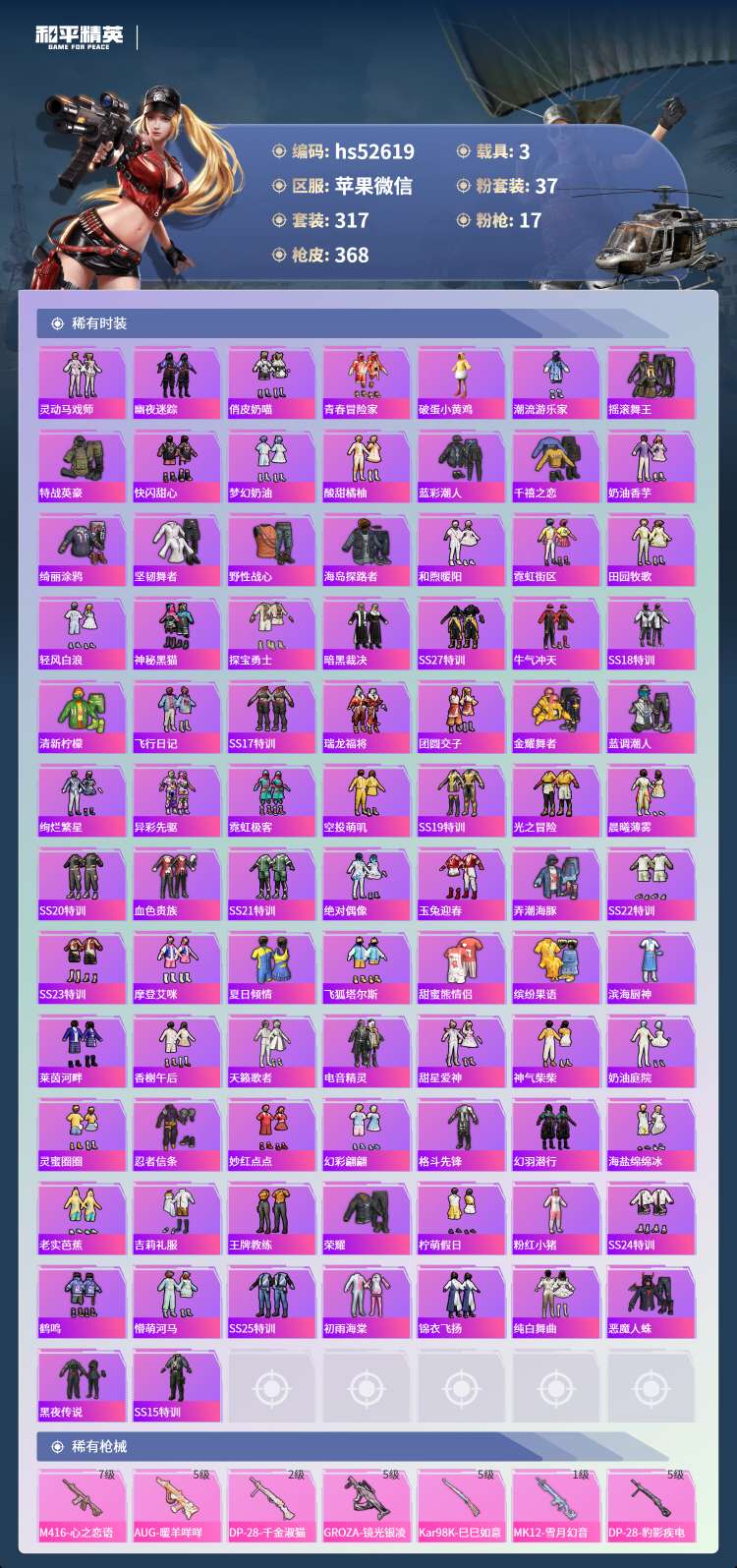 hs52619 苹果微-19王牌印记-1红装-37粉装-17特效枪-3载具-149817热力值-3