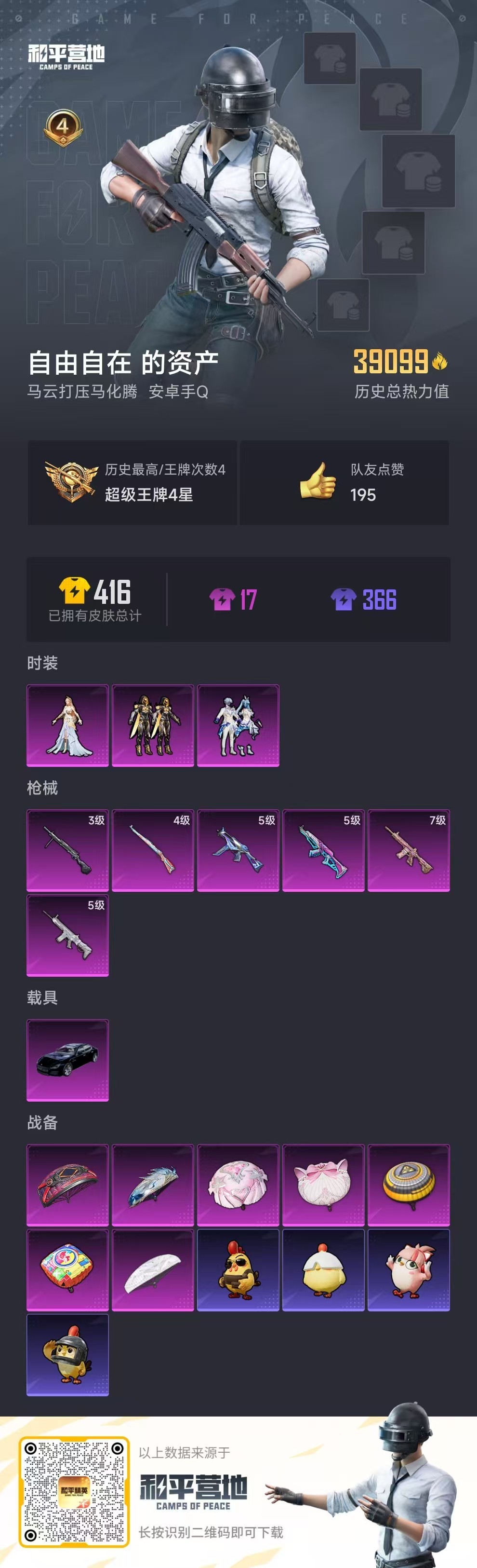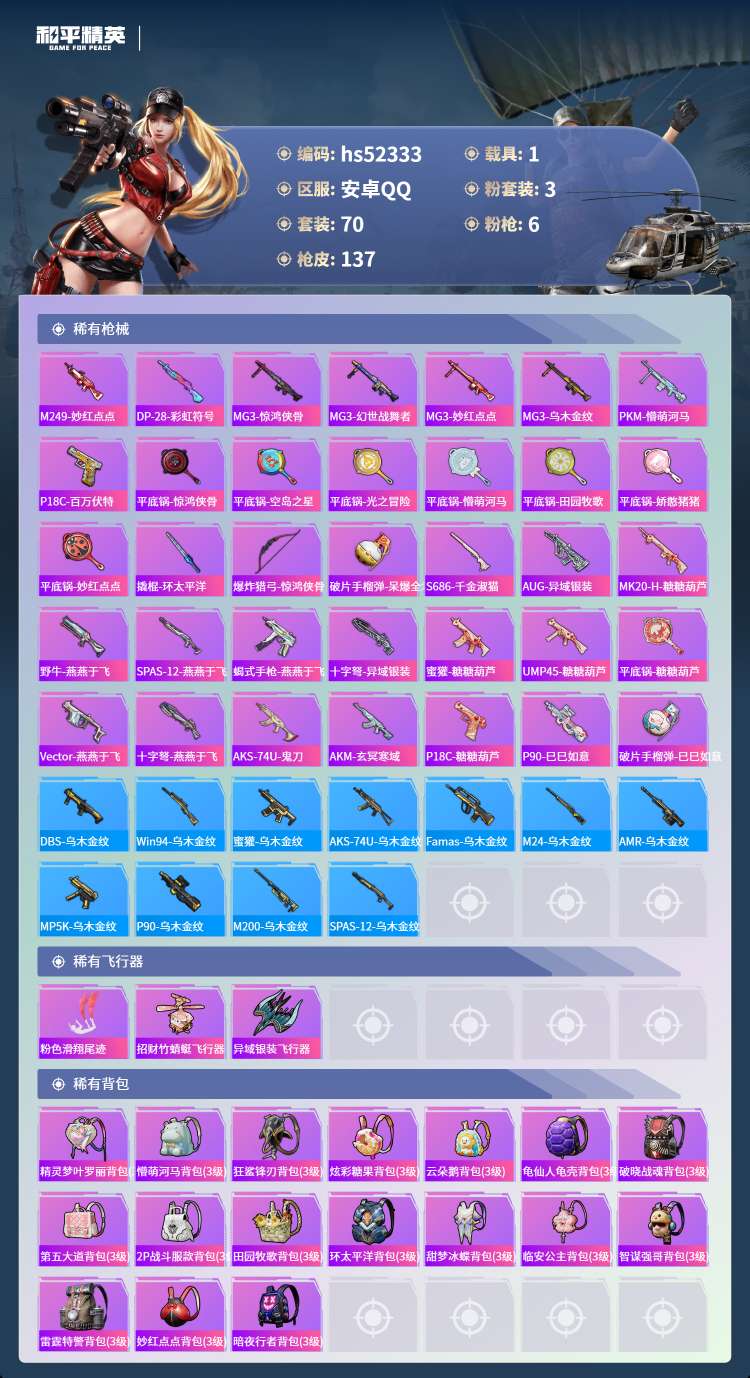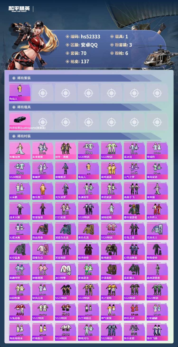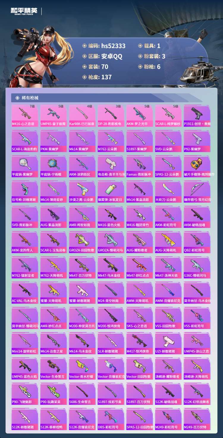 hs52333 安卓手Q-4王牌印记-3粉装-6特效枪-1载具-39099热力值-70套装-137枪