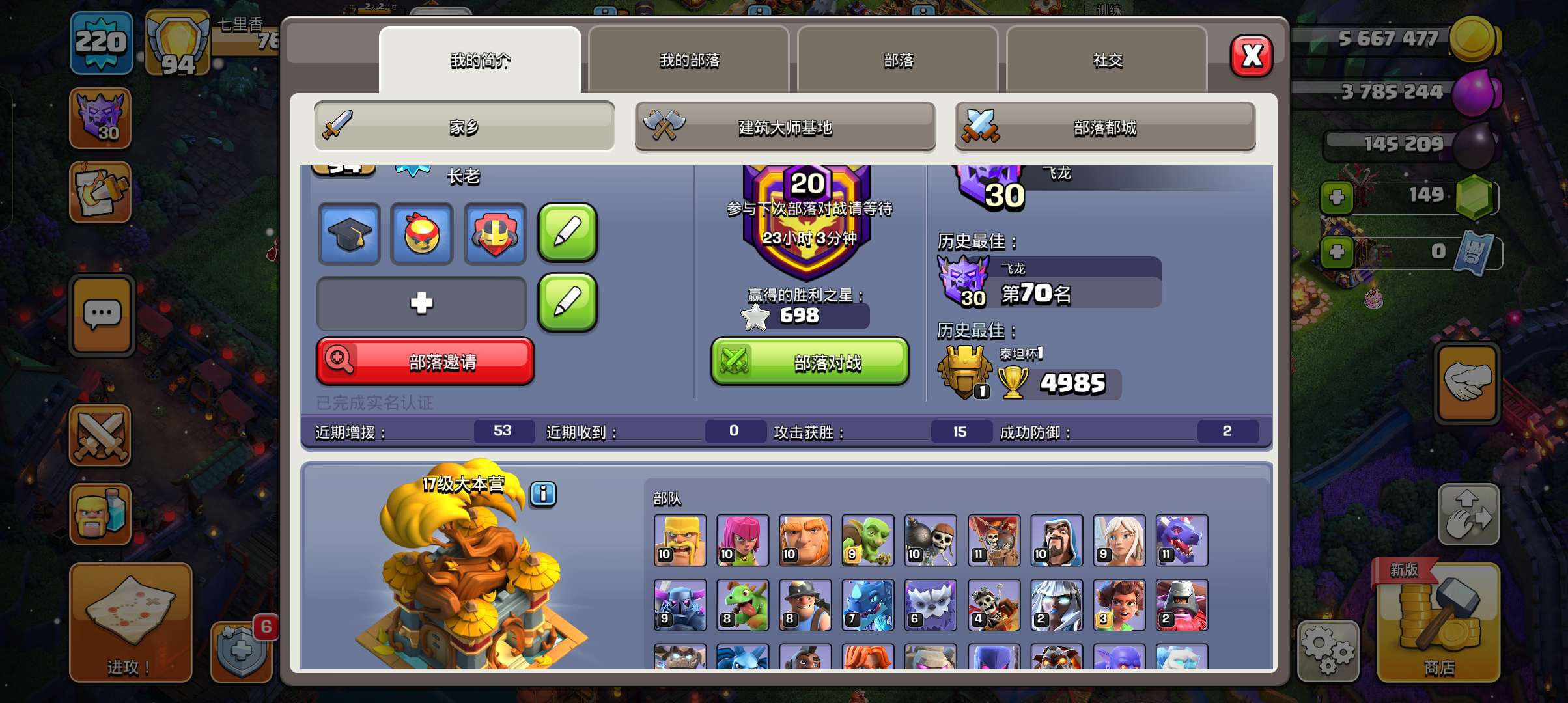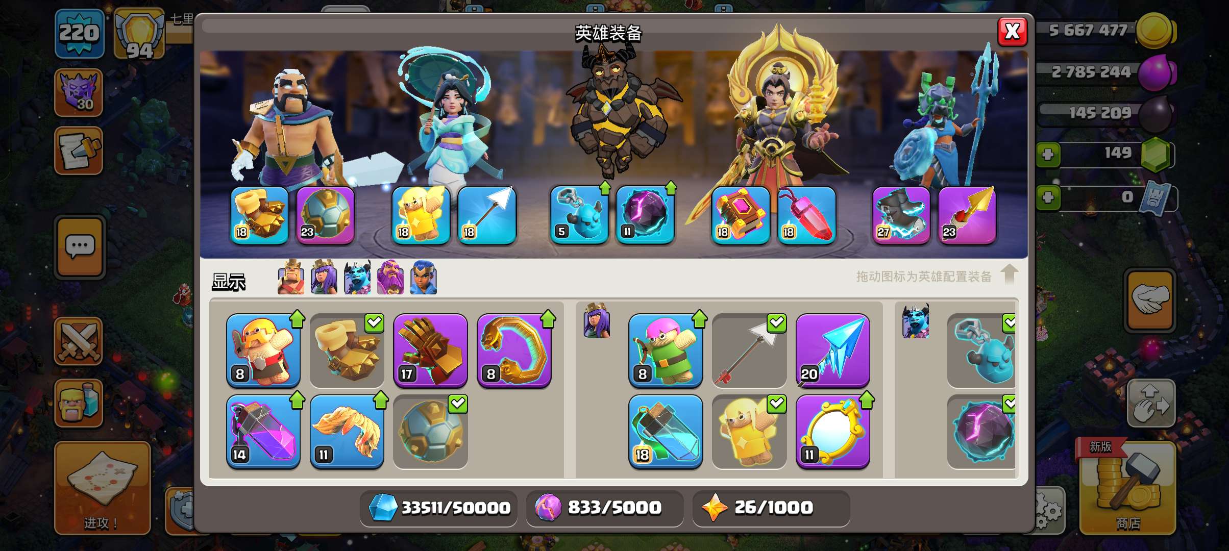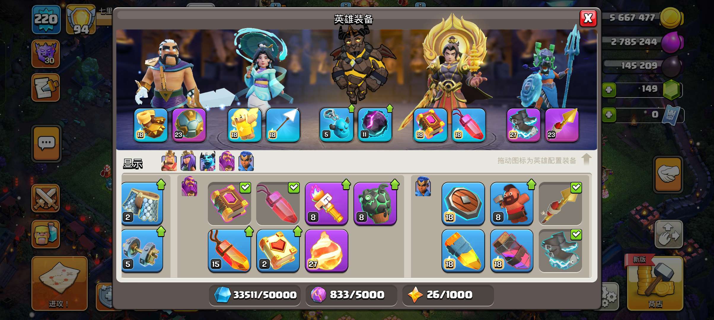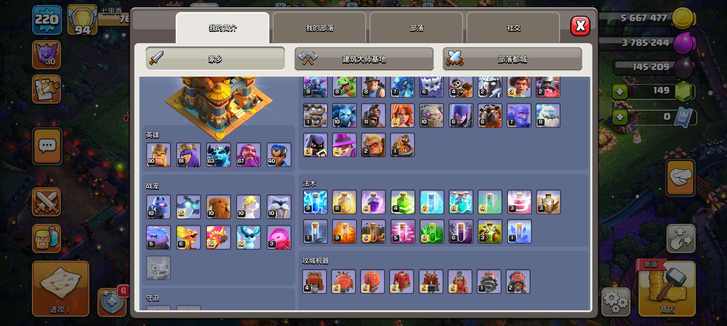 部落冲突安卓QQ区成品号,94级繁荣值,资源多,英雄装备齐全,技能等级高,英雄皮肤多,夜世界满本