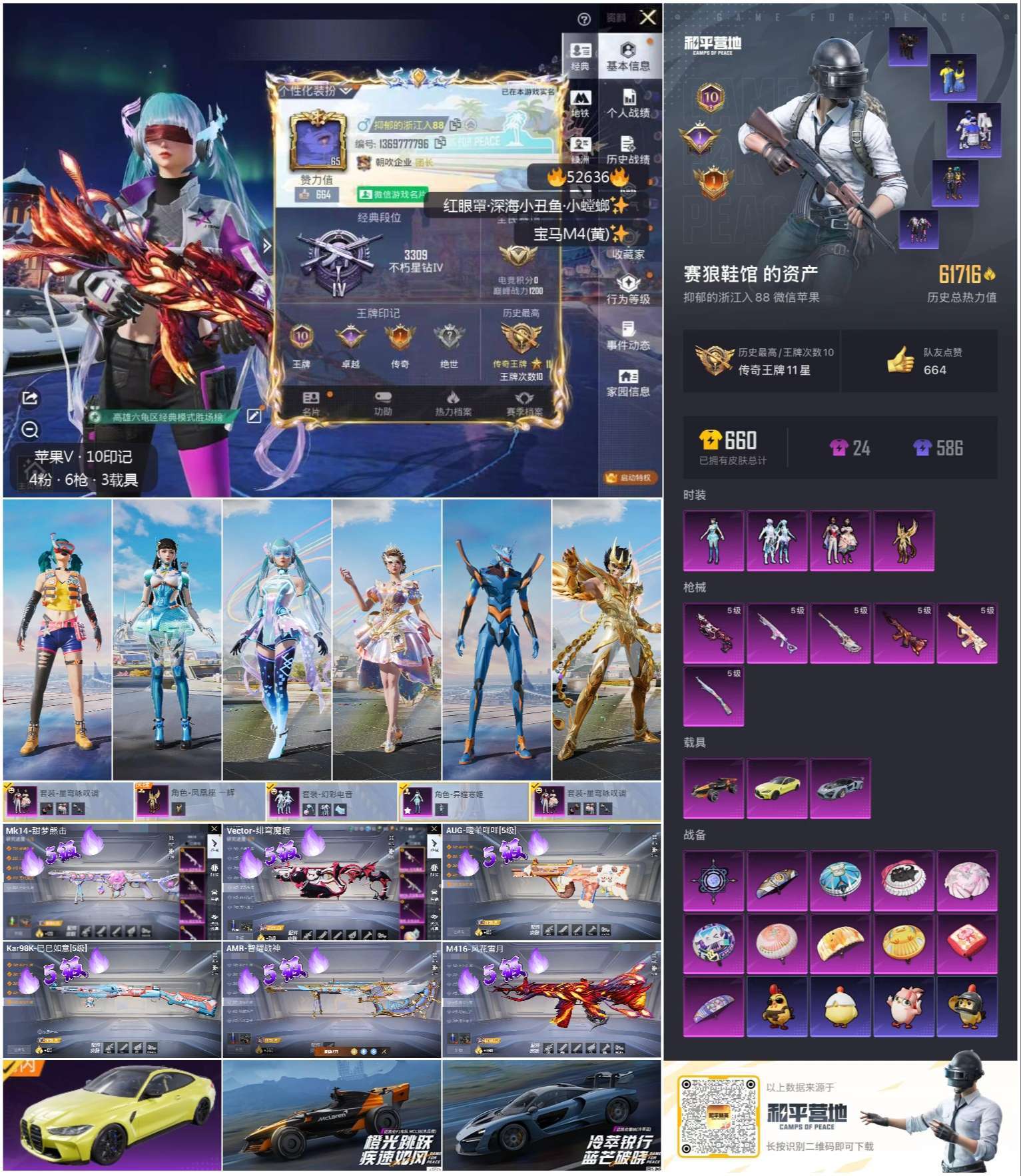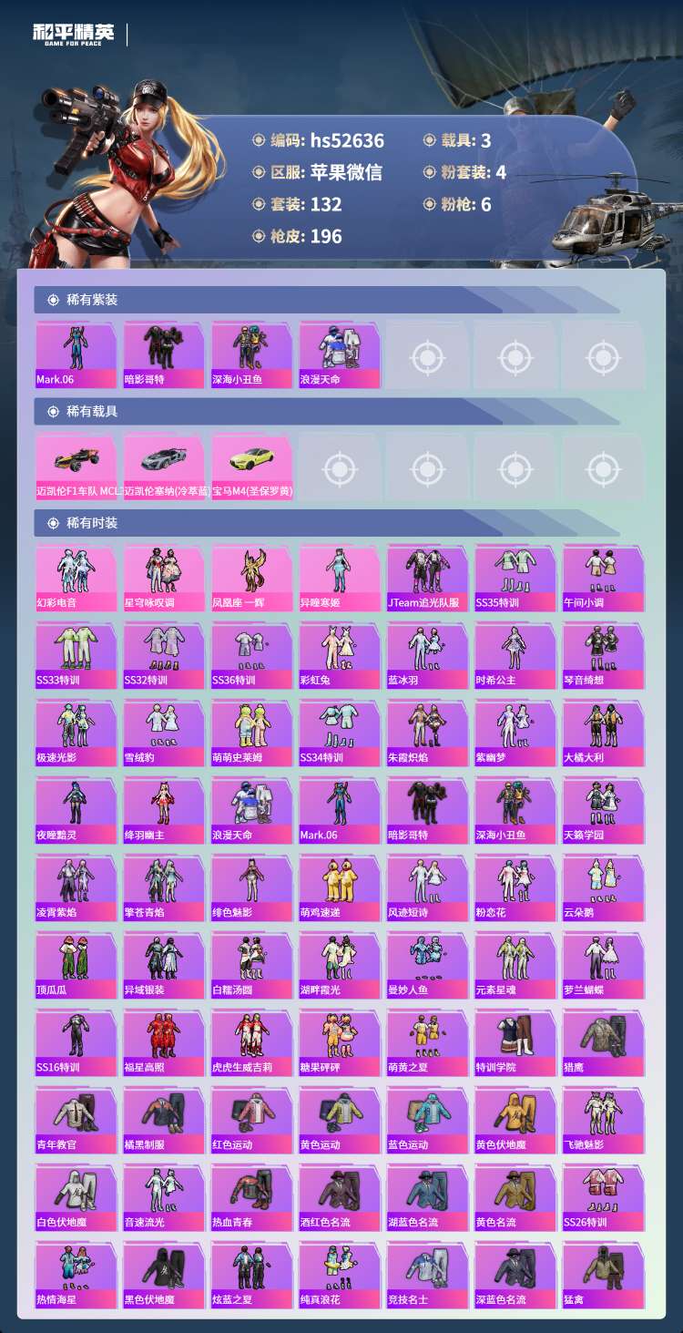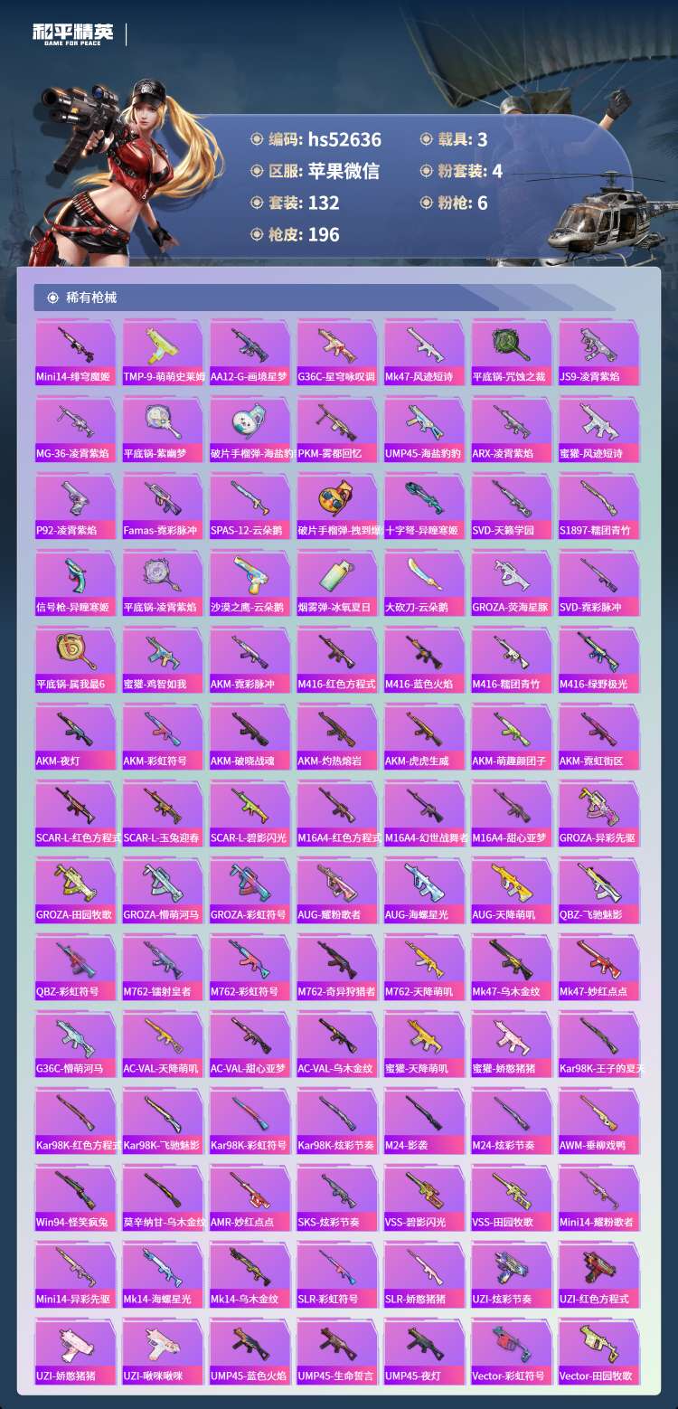 hs52636 苹果微-10王牌印记-4粉装-6特效枪-3载具-62171热力值-132套装-19