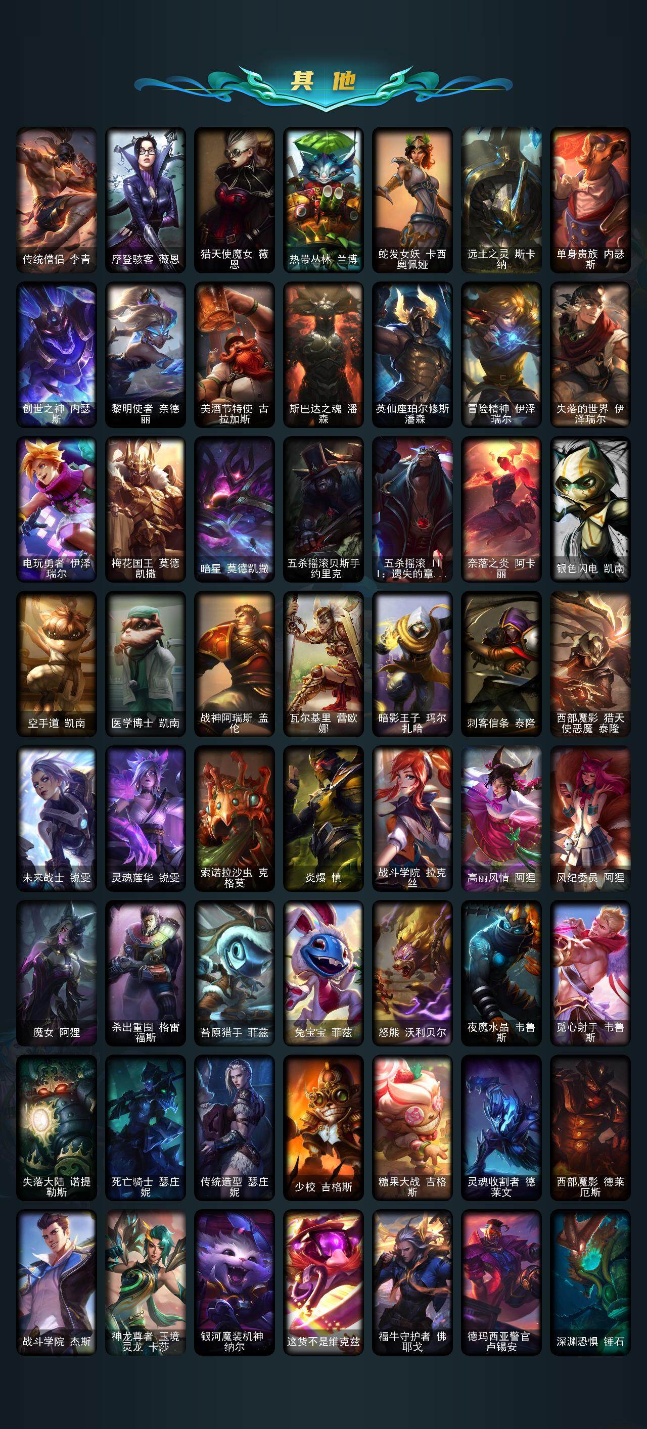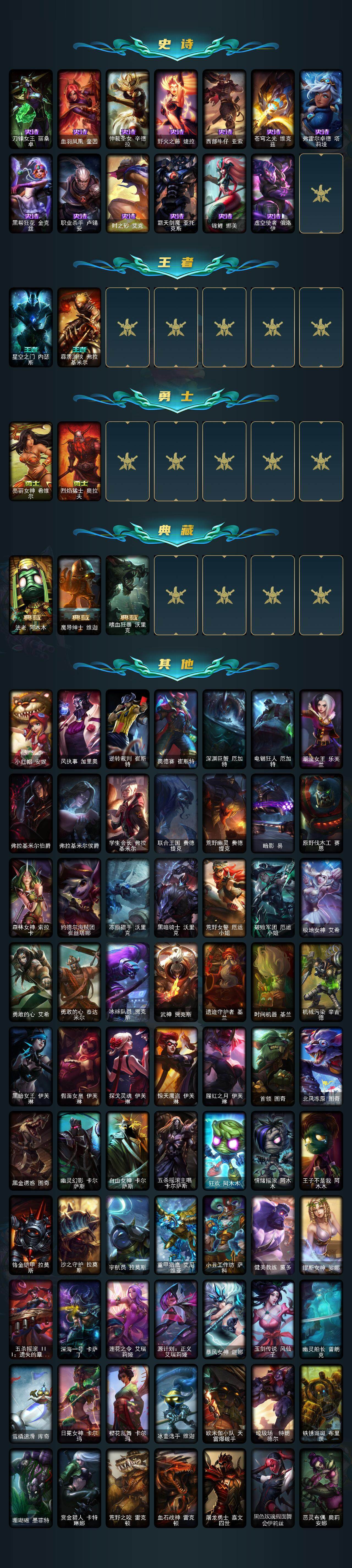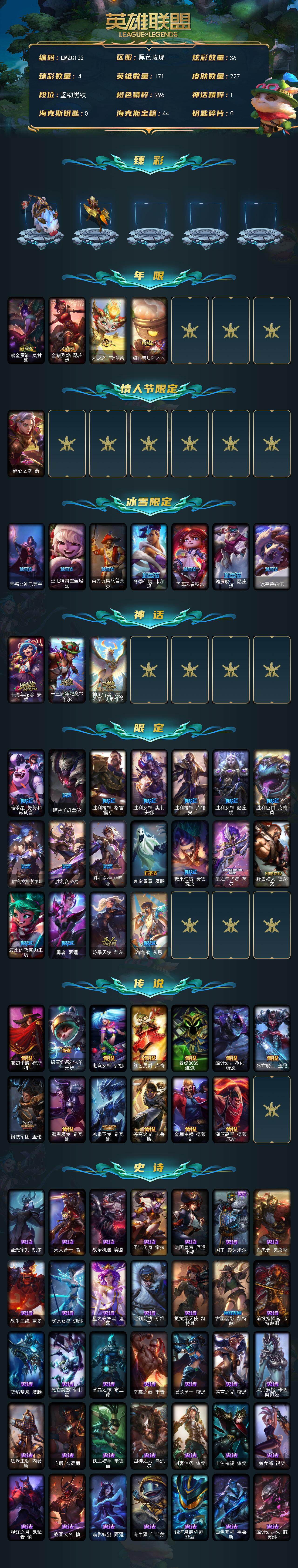 171英雄/227皮肤/3神话/30限定/4臻彩/36炫彩