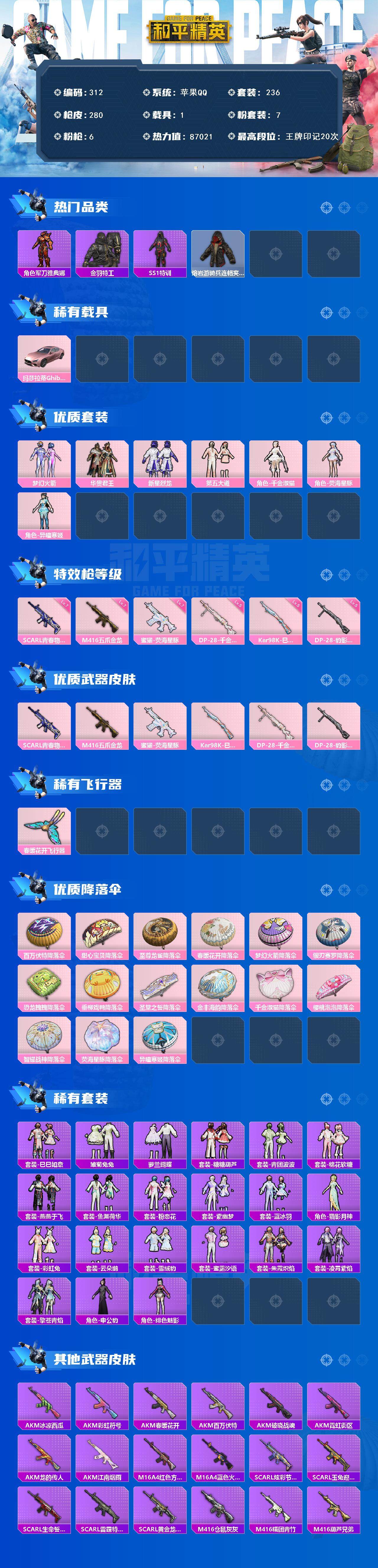 苹果 手Q-7粉装-6特效枪-1载具-1粉色飞行器-87021热力值-20王牌印记-236套装-280枪皮