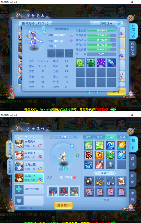 4套属性-1件14段3件13段2件12段,10个6技能多特殊5(6满魂兽),8红10黄血脉,3专属血脉,12个宝宝皮肤,高级坐骑+海景房,520万银子