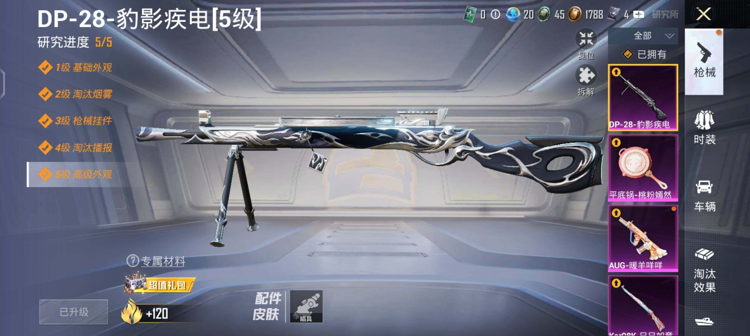 【粉色枪皮等级】:AUG-暖羊咩咩(四级),Kar98K-巳巳如意(五级),DP-28-豹影疾电(五级),平底锅-桃粉嫣然(三级)