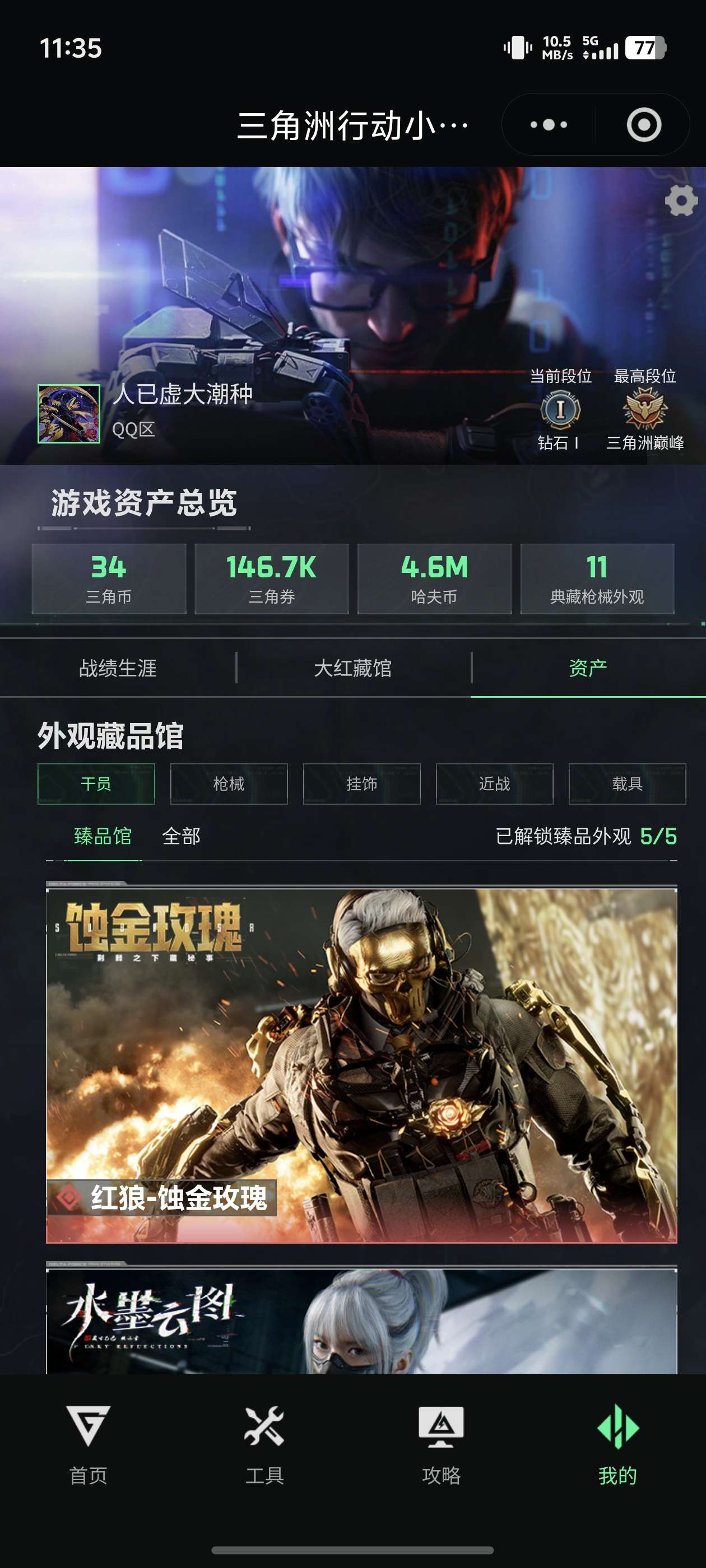 总资产:160M,哈夫币:455W,武器皮肤335;全角色红皮,刀皮差赤枭,号上还有十四万三角卷