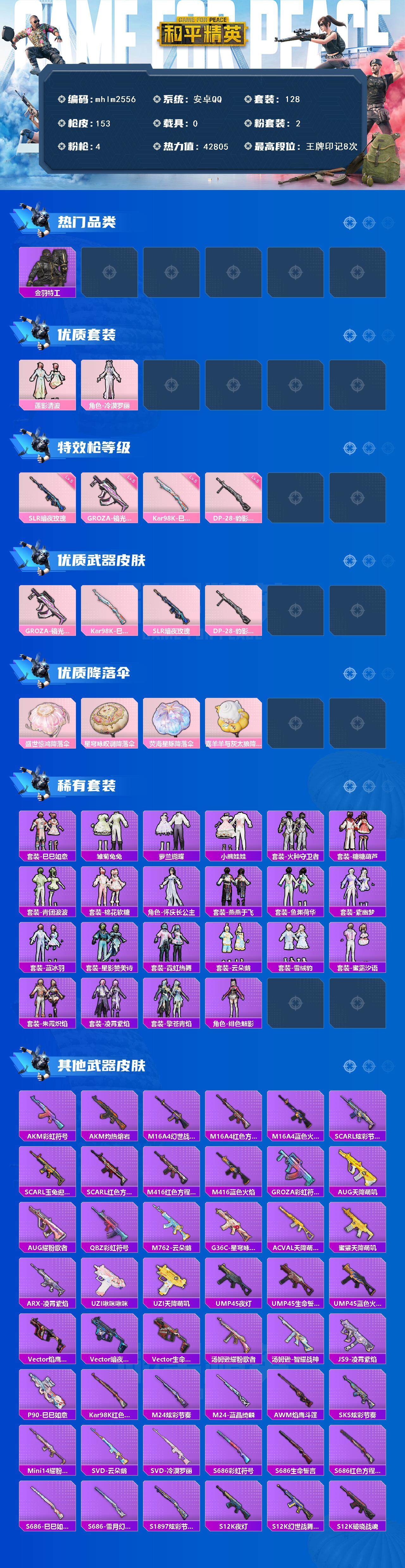 【mhlm2556】安卓 手Q-2粉装-4特效枪-0载具-2粉色飞行器-42805热力值-8王牌印记-128套装-153枪皮