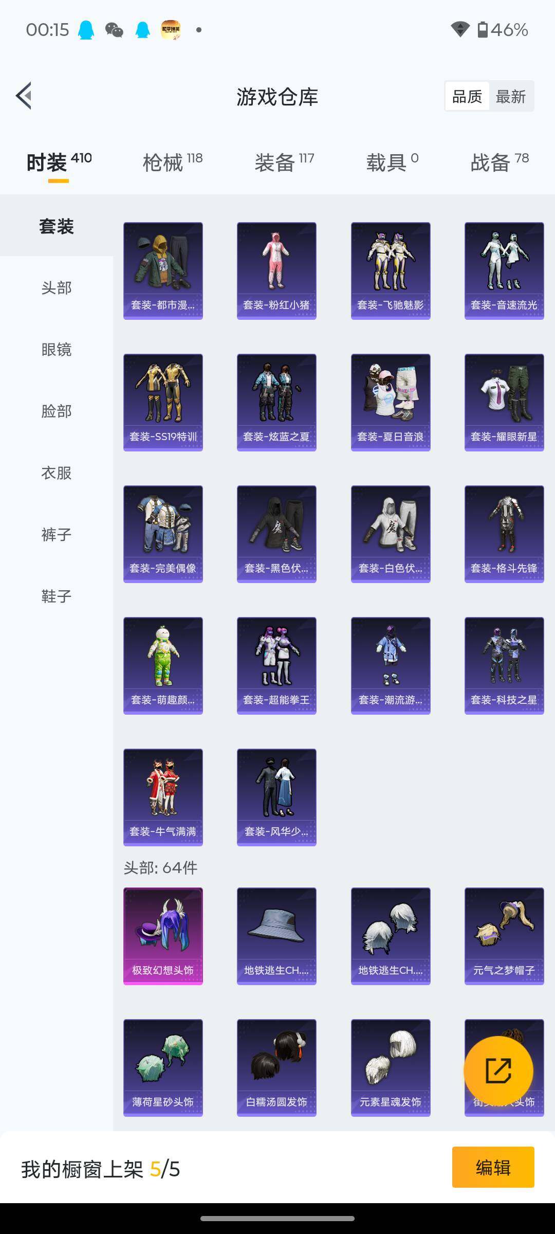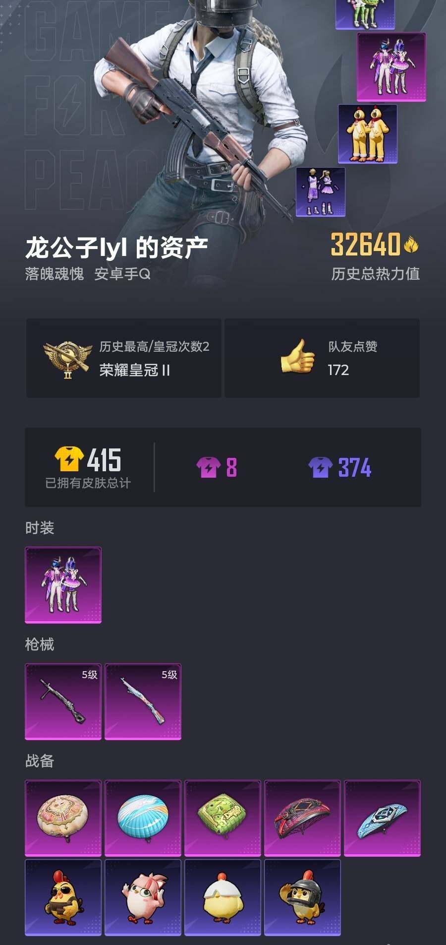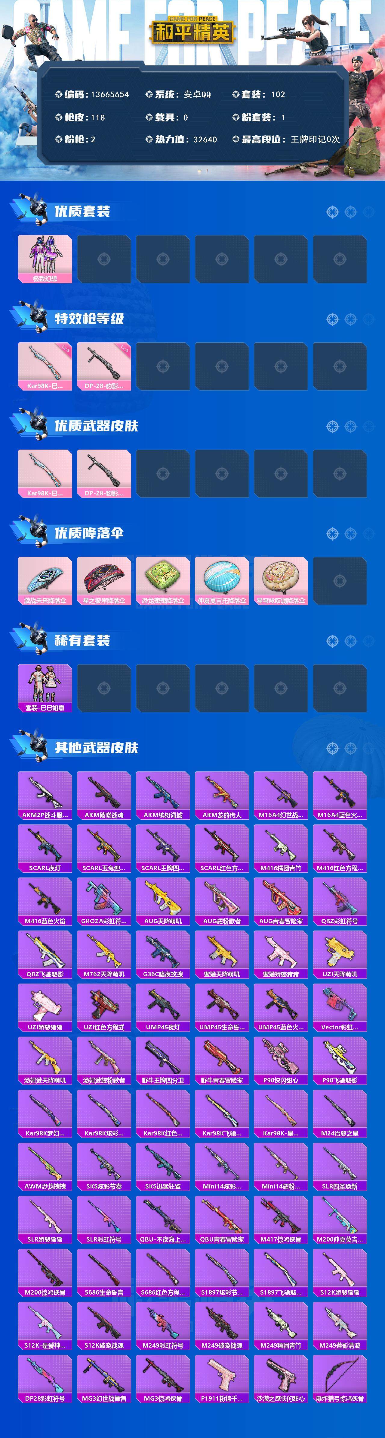 安卓 手Q-1粉装-2特效枪-0载具-0粉色飞行器-32640热力值-1王牌印记-102套装-118枪皮