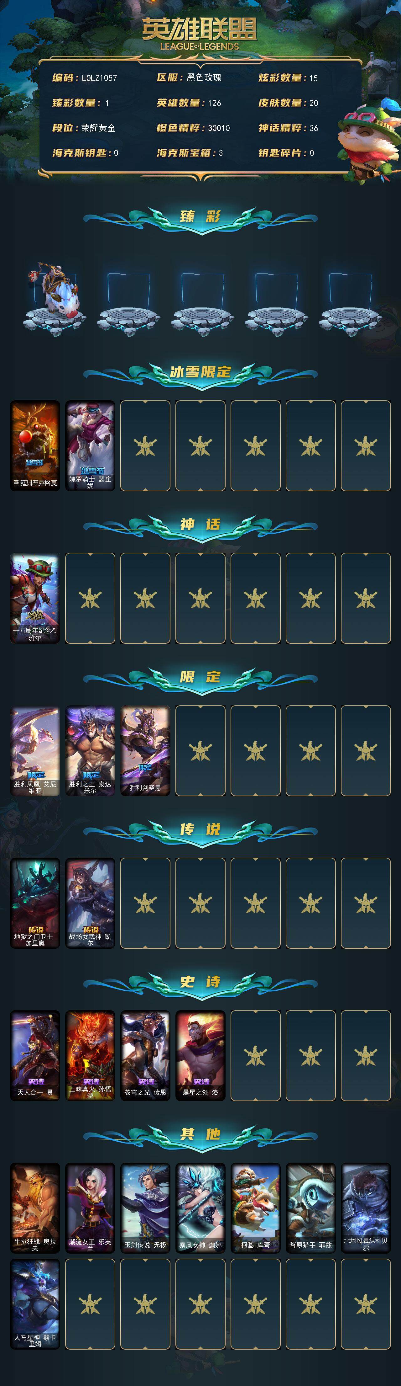 【LOLZ1057】126英雄/20皮肤/1神话/5限定/1臻彩/15炫彩/2传说/4史诗/黄金账号等级:135/无畏骑士瑟庄妮赤子初心/圣诞驯鹿克格莫/魄罗骑士瑟庄妮/十五周年纪念希维尔/胜利凤凰艾尼维亚/胜利之王泰达米尔/胜利剑圣易/地狱之门卫士加里奥/战场女武神凯尔/天人合一易/三昧真火孙悟空/苍穹之光薇恩/晨星之翎洛/牛扒狂战奥拉夫/潮流女王乐芙兰/玉剑传说无极/暴风女神迦娜/柯基库奇/苔原猎手菲兹/北地风暴沃利贝尔/人马星神赫卡里姆