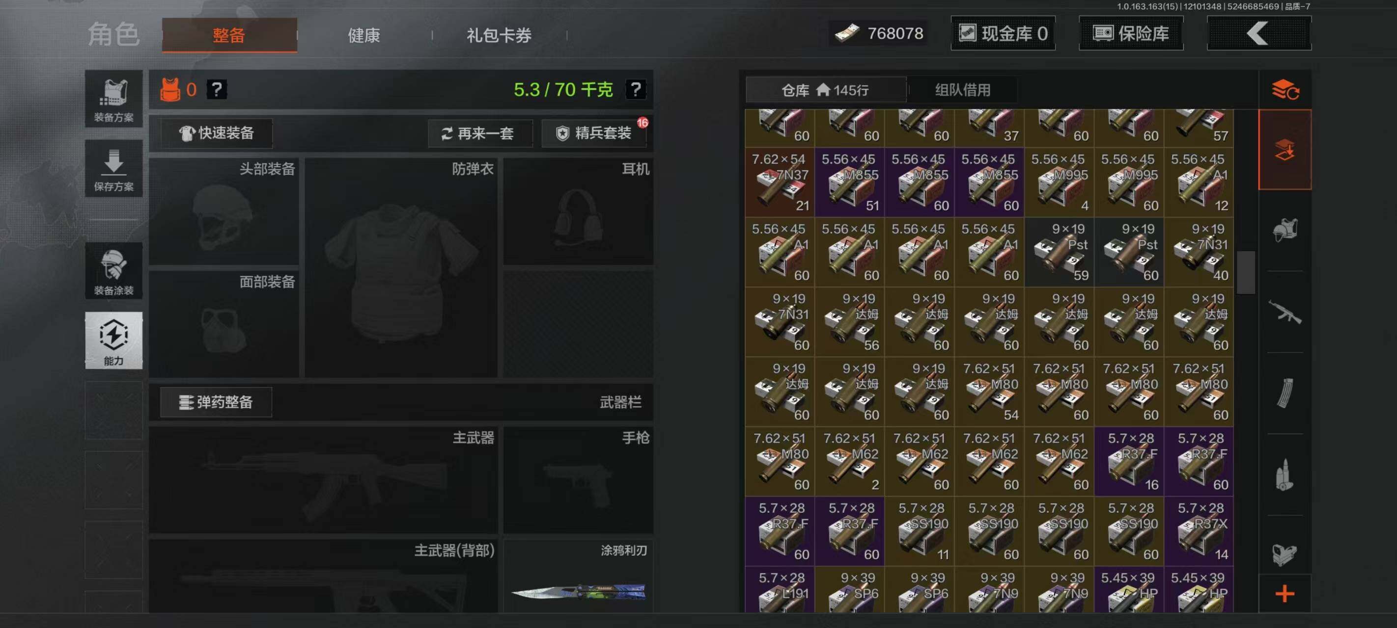可二次极品号,仓库价值:4M,纯币:768078,仓库还有和多子弹,涂鸦利刃,贝利亚黄昏,开山刀,工兵铲,堕落者·H416,瓷蒺藜·T13手榴弹