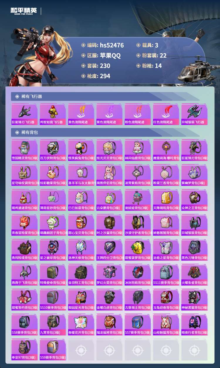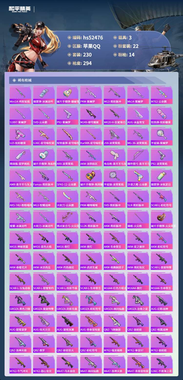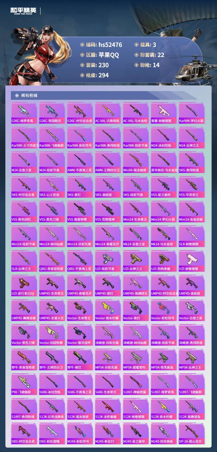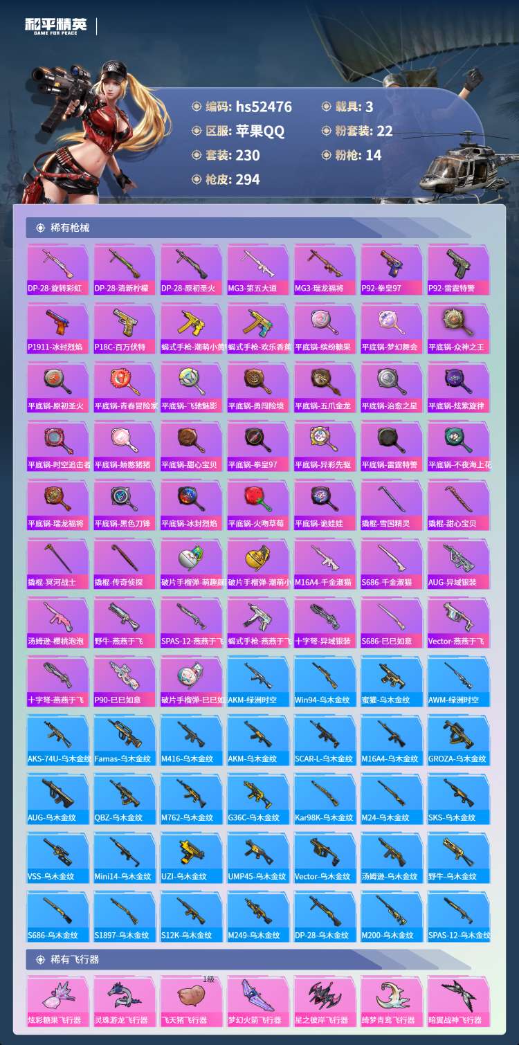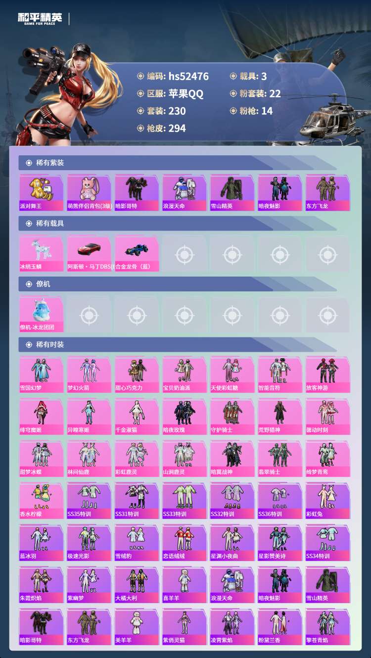 hs52476 苹果手Q-11王牌印记-22粉装-14特效枪-3载具-110379热力值-230套装