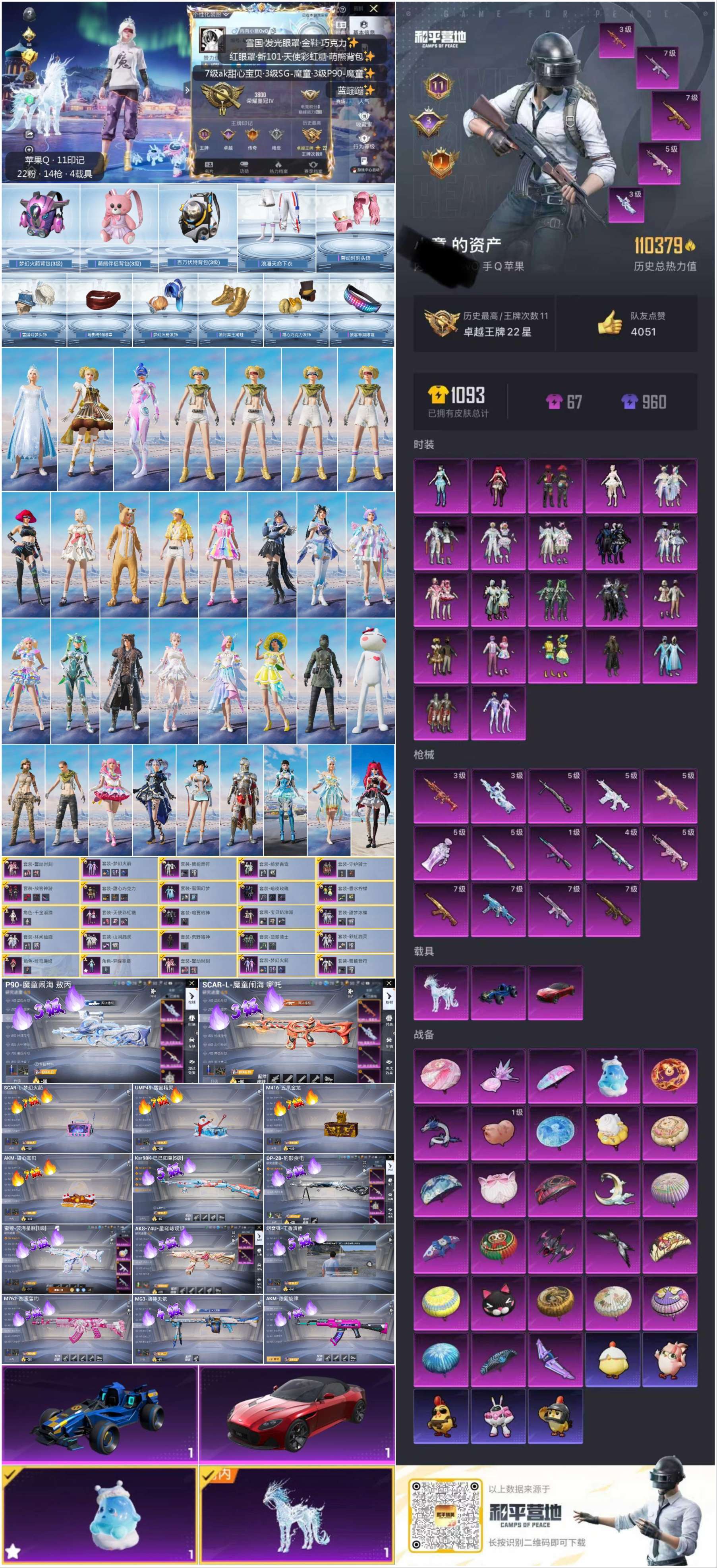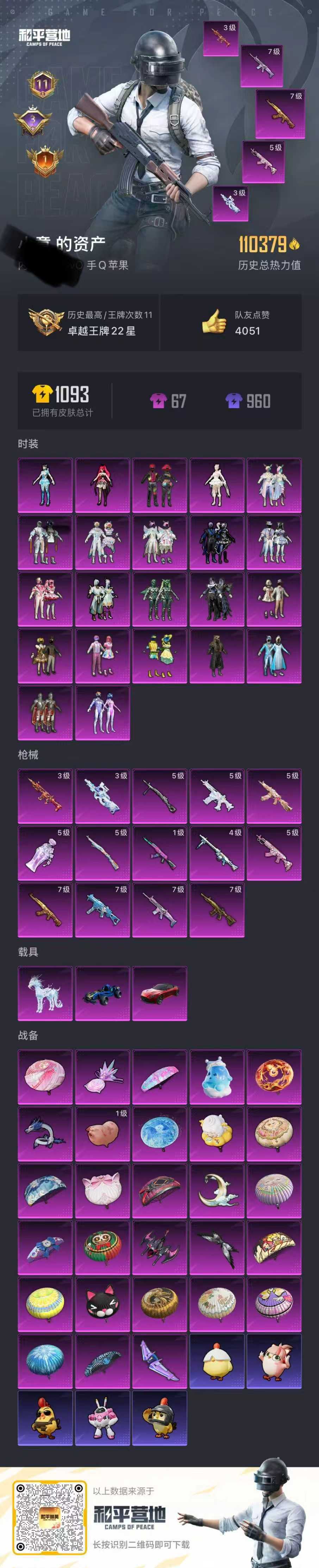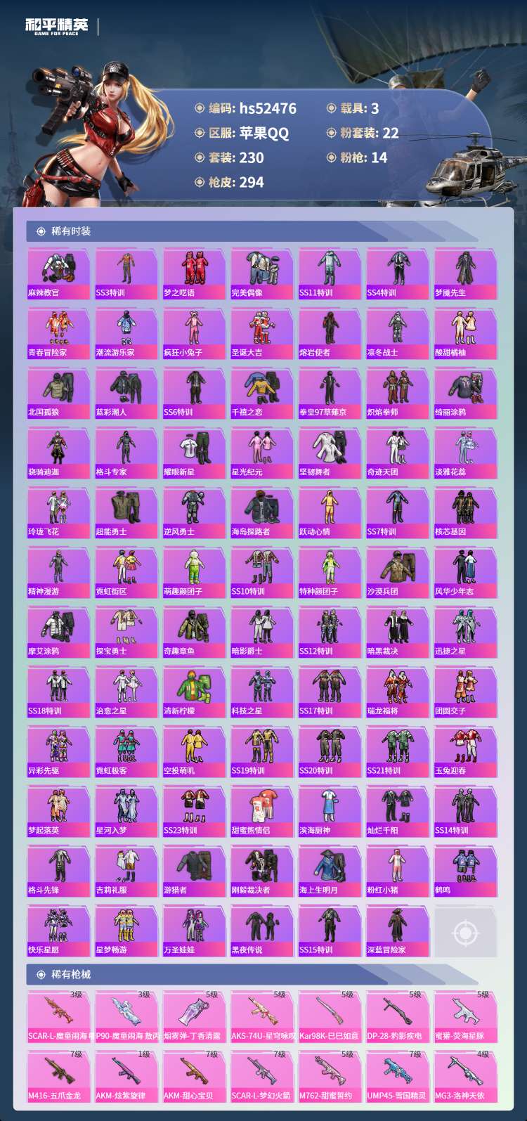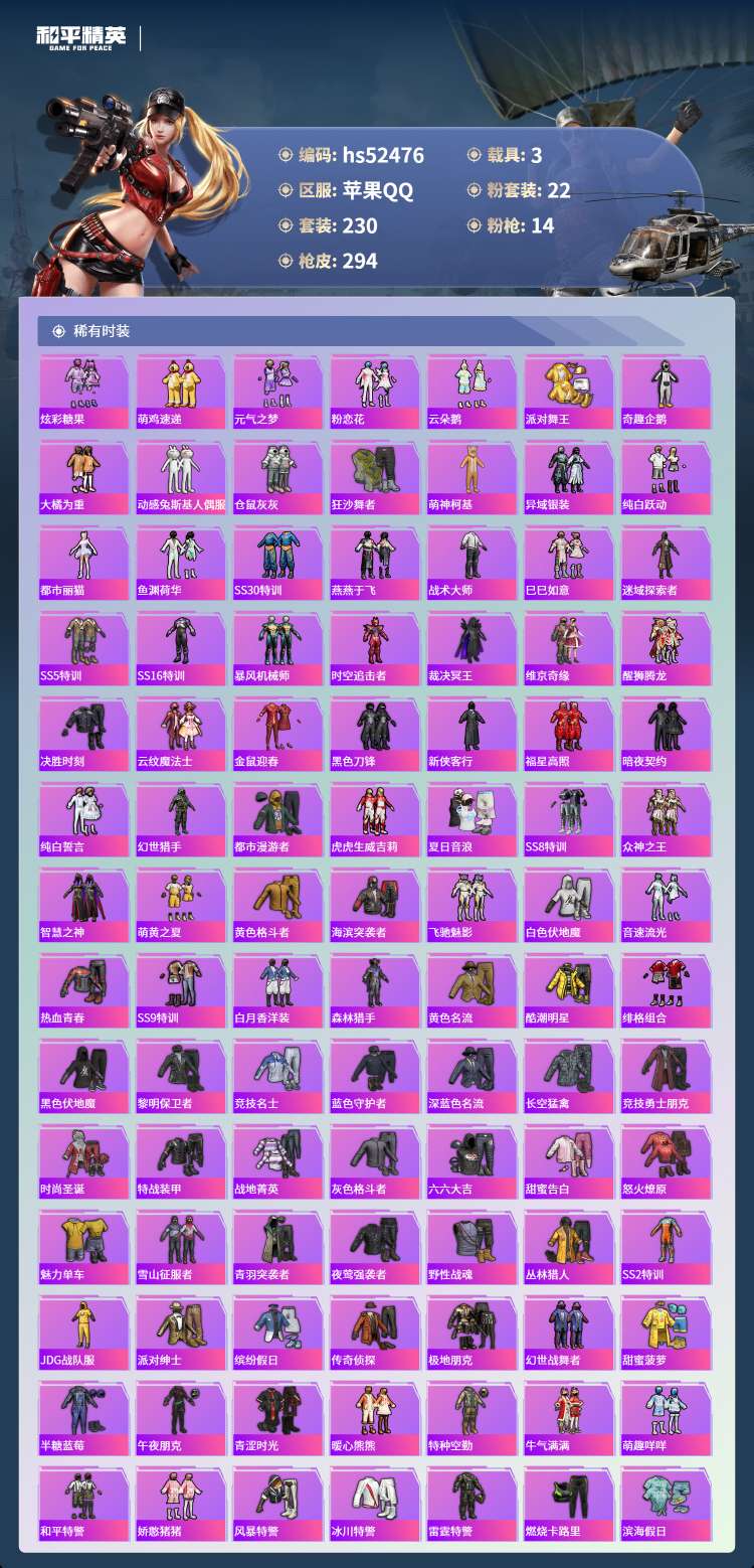 hs52476 苹果手Q-11王牌印记-22粉装-14特效枪-3载具-110379热力值-230套装
