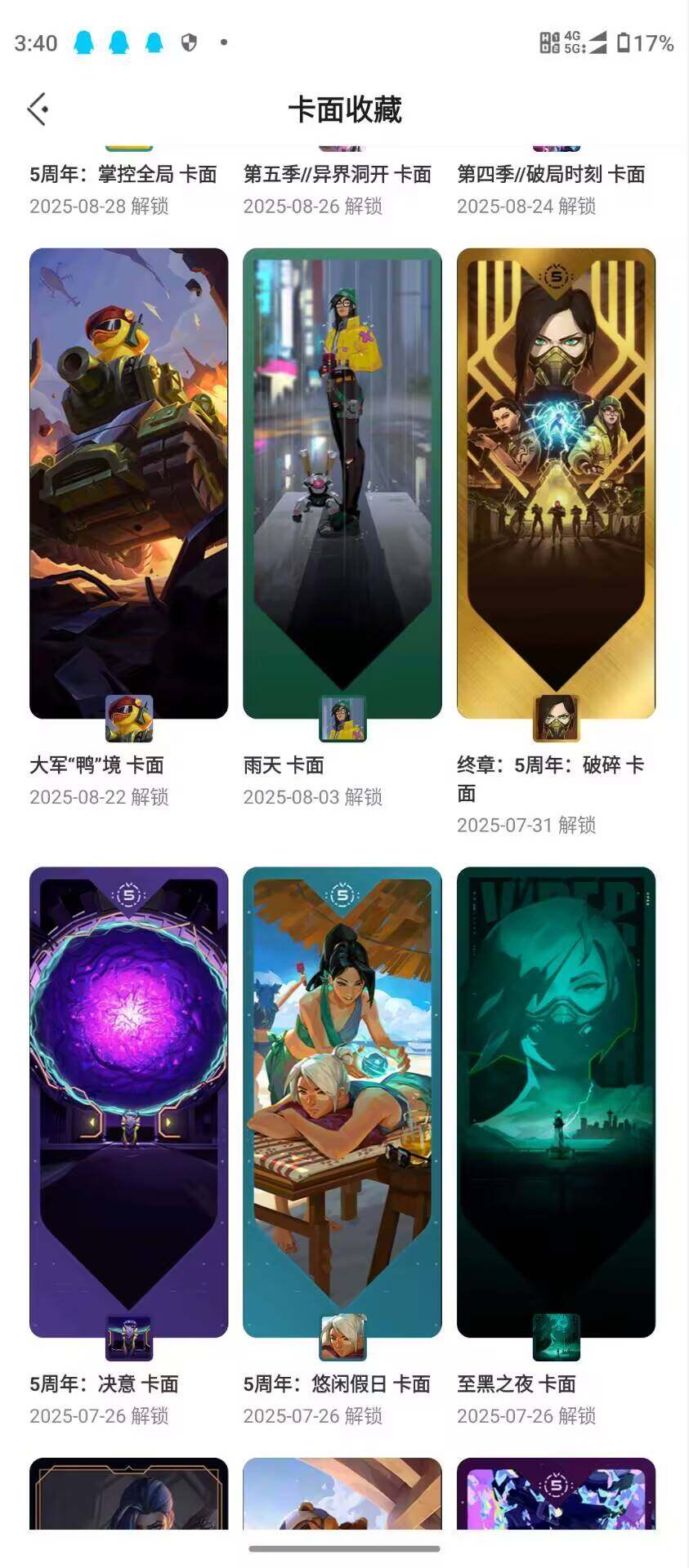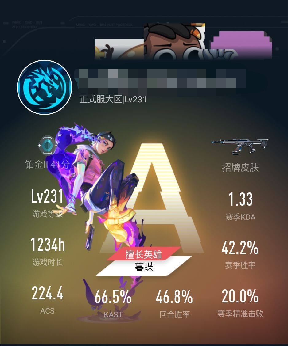 段位: 铂金 近战武器皮肤: 澄湖潋滟,威龙之刃,超能偶像 应援棒,匕首-超限闪存 步枪皮肤: 狂徒-盖亚的复仇,戍卫-天界神兵,狂徒-塑水宗,狂徒-艾沃莉的梦之翼,狂徒-混沌序曲,幻影-海洋之星2.0,幻影-电音光谱 佩枪皮肤: 鬼魅-耀鳞威龙,标配-VCTxLEV,正义-离子武器,正义-光明哨兵 冲锋枪皮肤: 骇灵-紫阙金琅