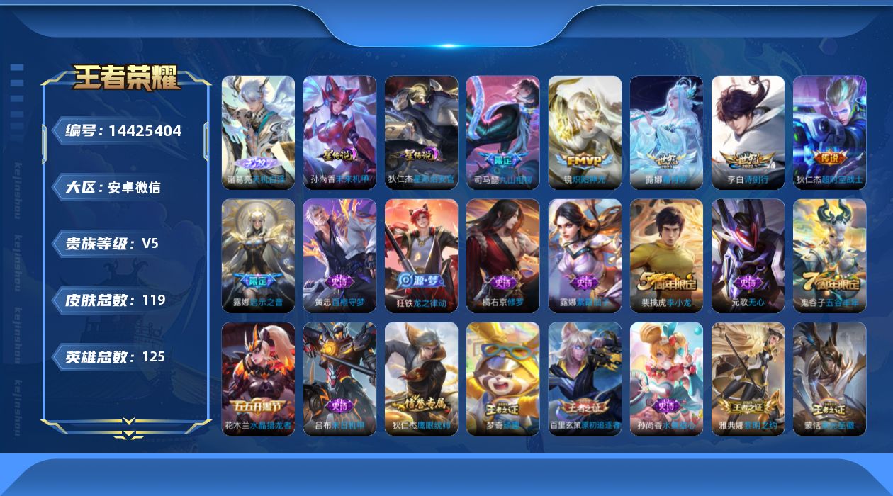 【14425404】[14425404]微信社交限制!实名: 不可修改 贵族等级: V5 英雄数: 125 皮肤数: 119 无双皮: 天机白泽 星传说: 未来机甲,星际治安官 传说皮: 炽阳神光,超时空战士-狄仁杰,霜月吟,九山相柳 限定皮: 李小龙,启示之音,五谷丰年,诗剑行 亮点: 【 精品号手慢无】微信社交限制!历史省级金标万战露娜万战李白万战韩信万战裴擒