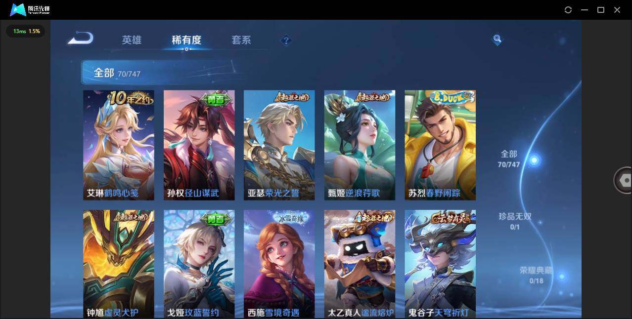 实名: 可修改 贵族等级: V5 英雄数: 96 皮肤数: 70 传说皮: 一