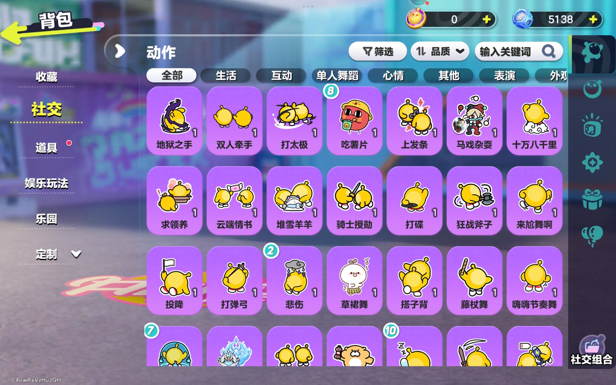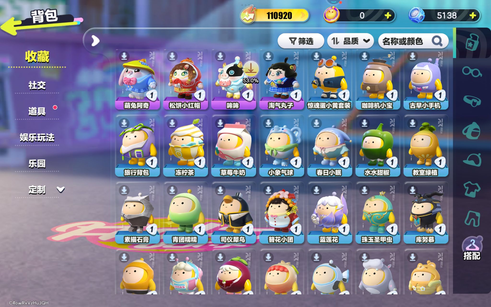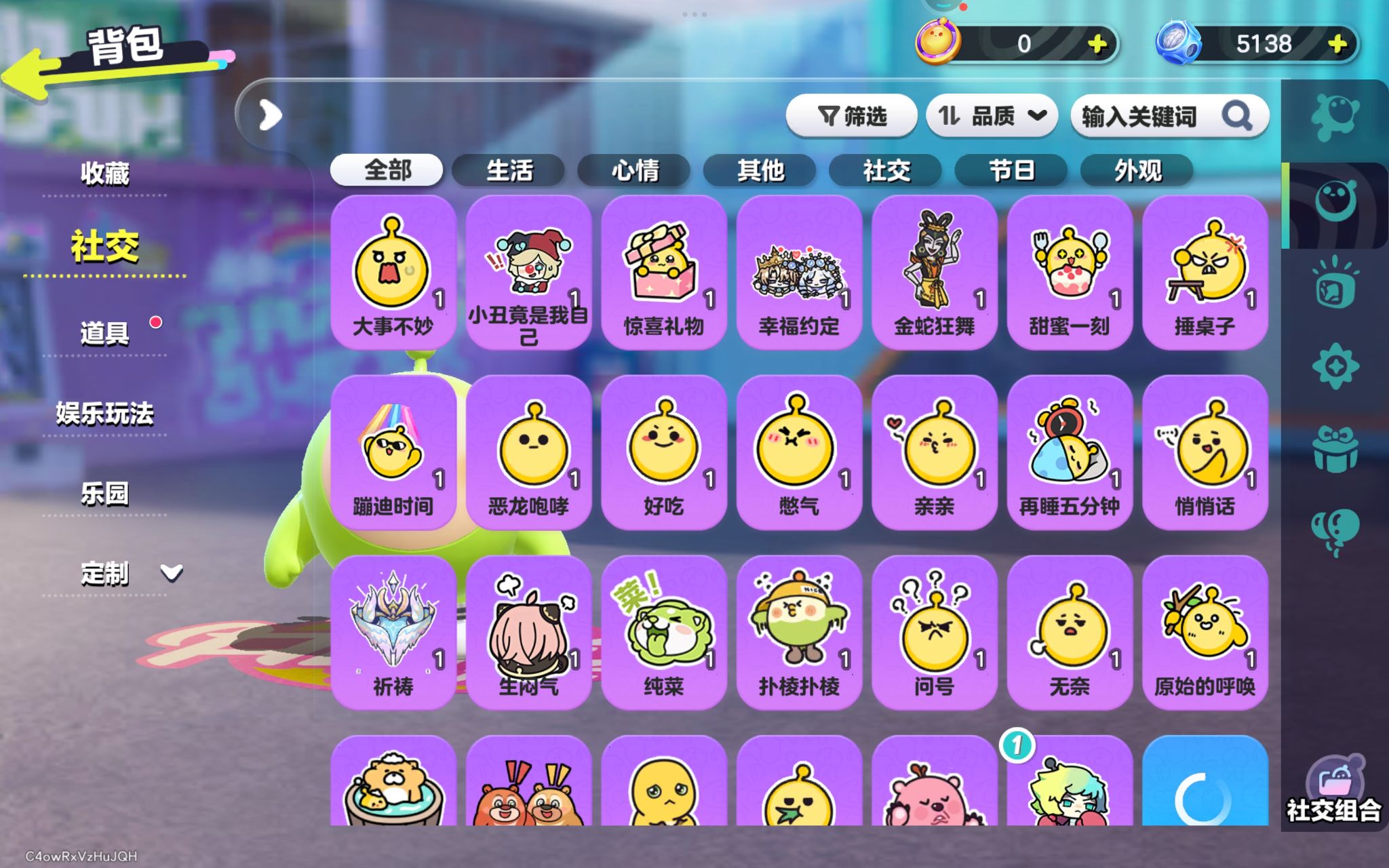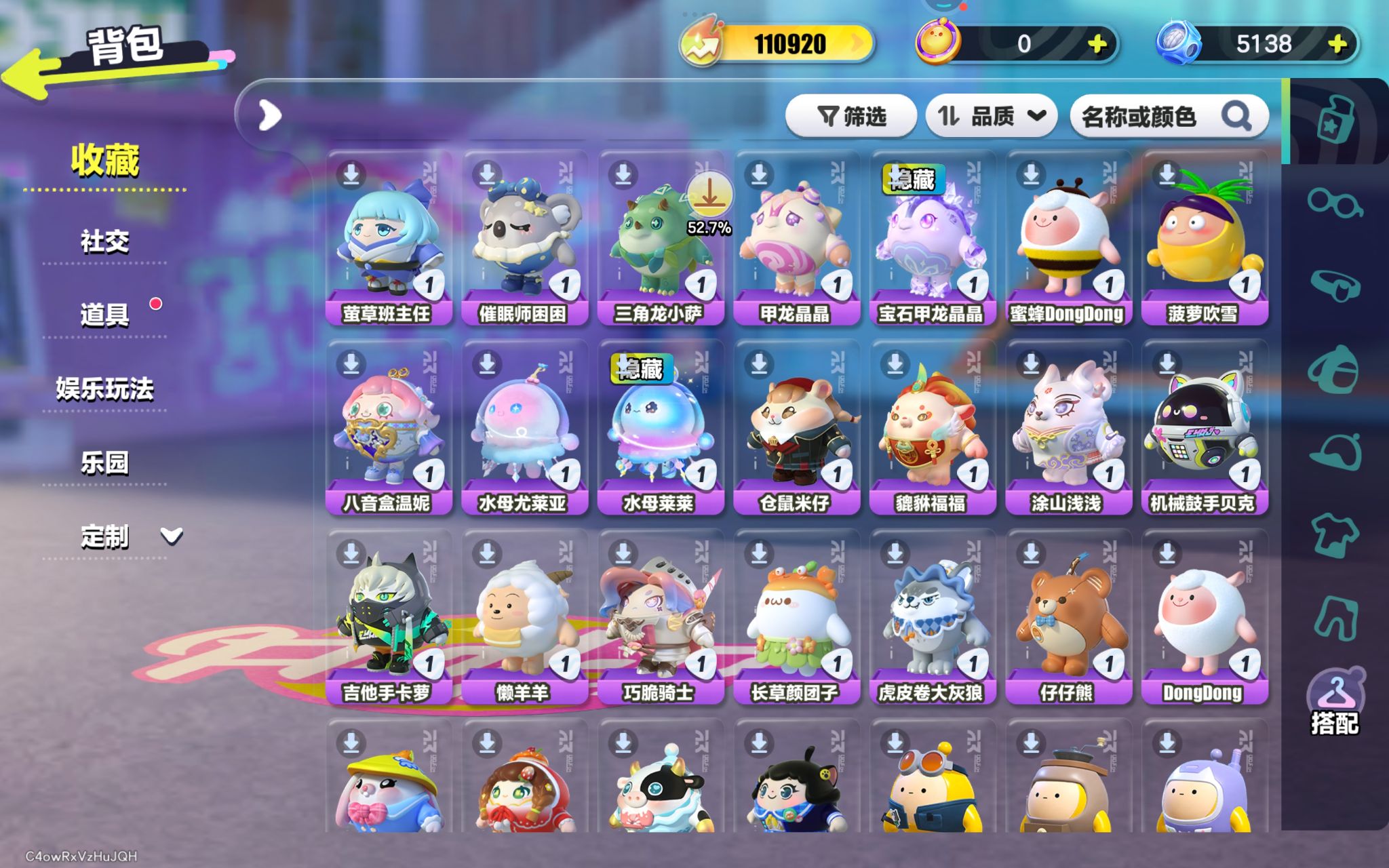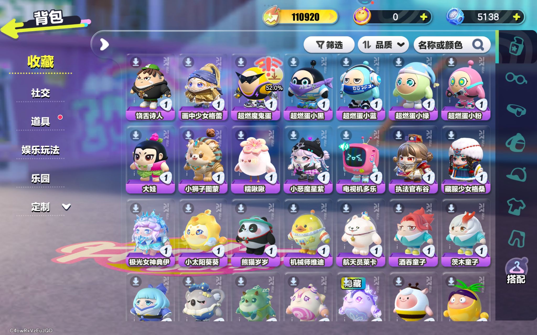 紫色套装:冷面千金竹月,柠檬汽水啵啵,劝学小子,饶舌小子,渡鸦阿舍尔,矮人工匠托尔,侦探麦嘎,莓莓甜心兔,炸弹彩彩,袋鼠嘟宝,嗷嗷,饶舌诗人,画中少女格蕾,超燃魔鬼蛋,超燃蛋小黑,超燃蛋小蓝,超燃蛋小绿,超燃