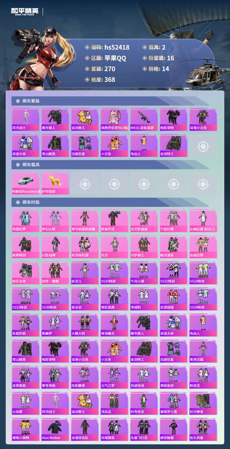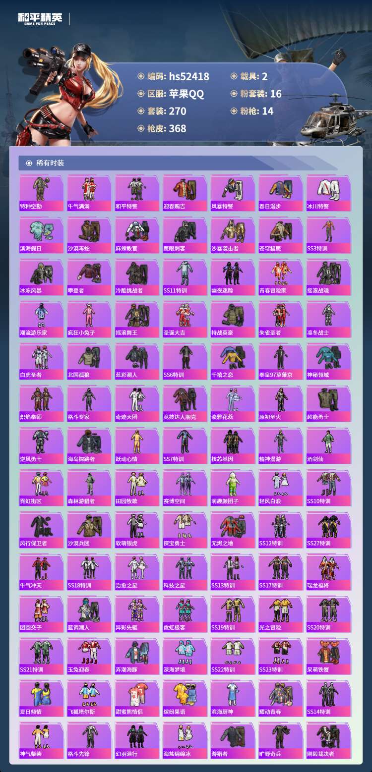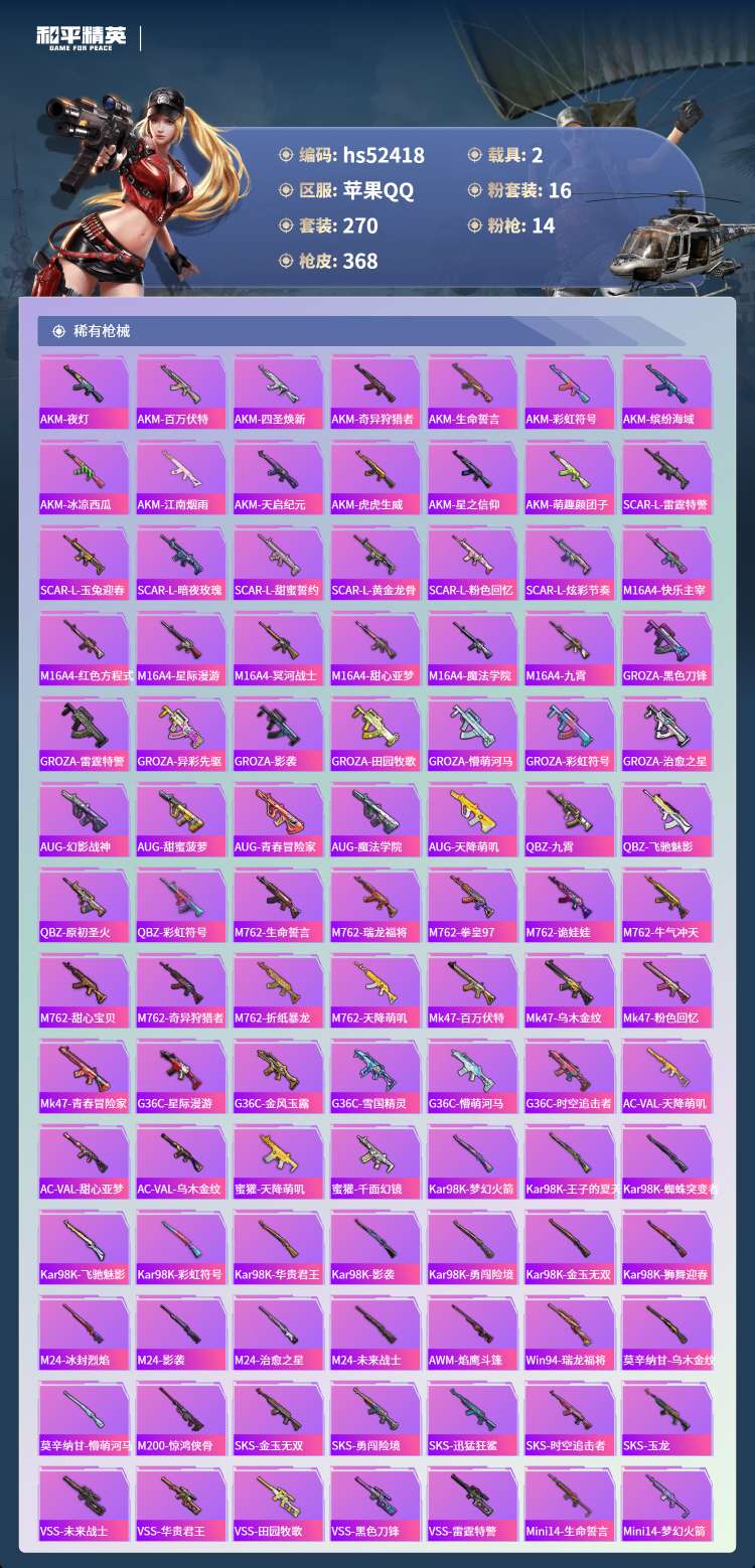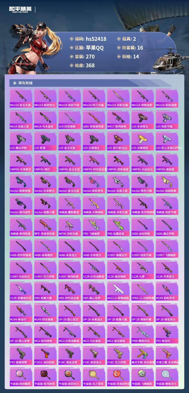 hs52418 苹果手Q-22王牌印记-有战神框-16粉装-14特效枪-2载具-121940热力值-