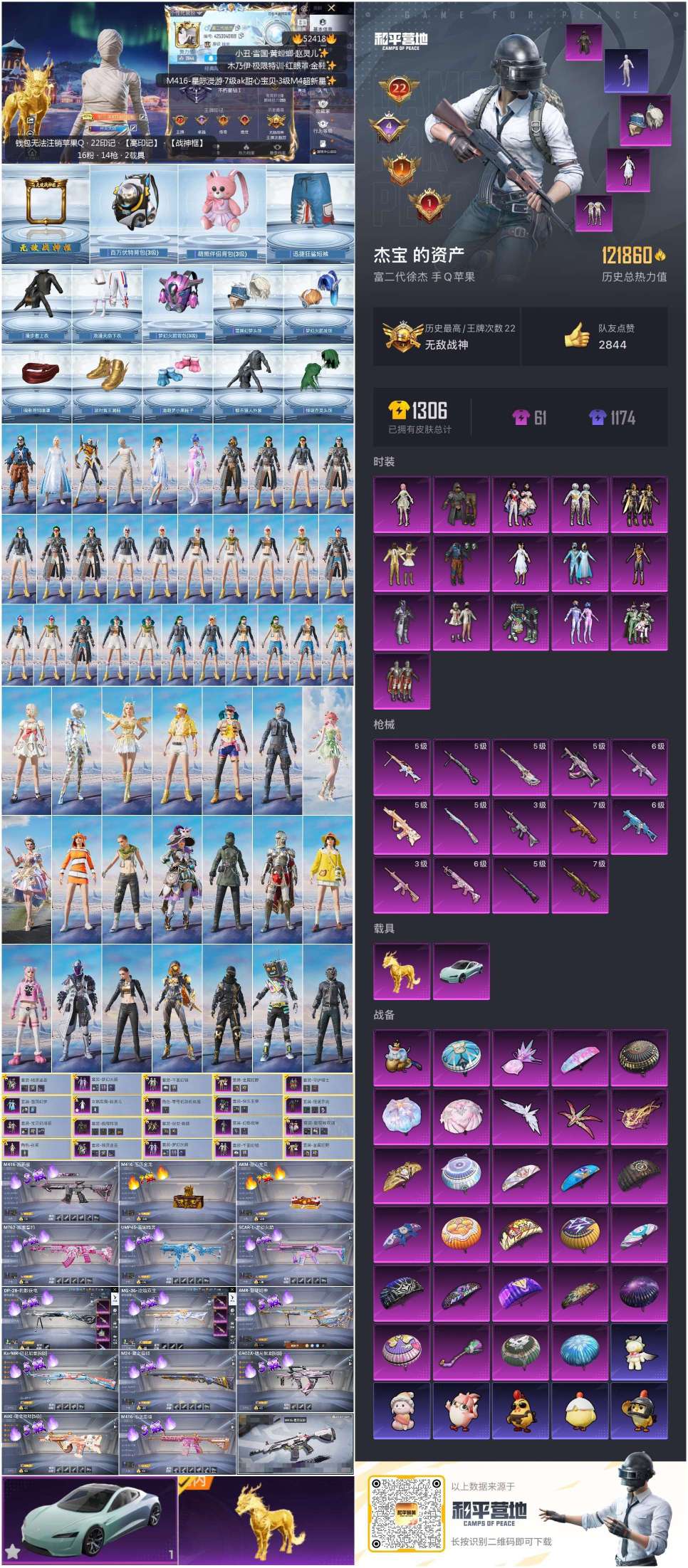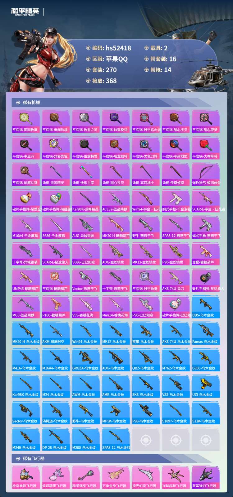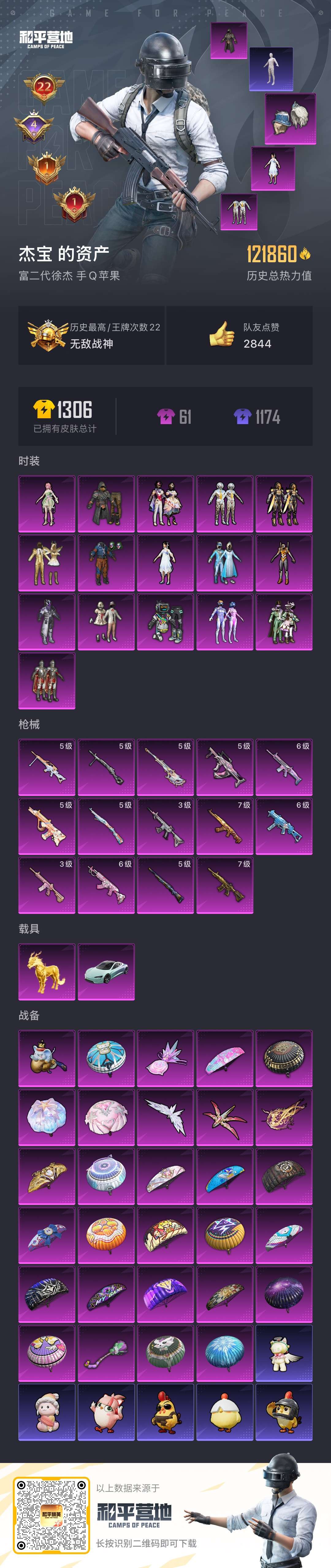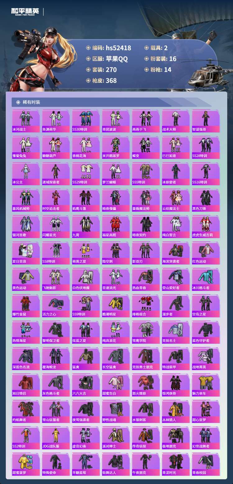 hs52418 苹果手Q-22王牌印记-有战神框-16粉装-14特效枪-2载具-121940热力值-