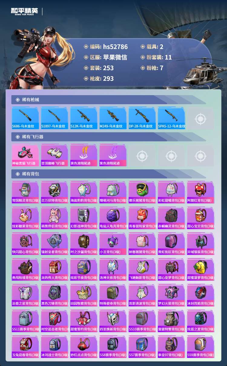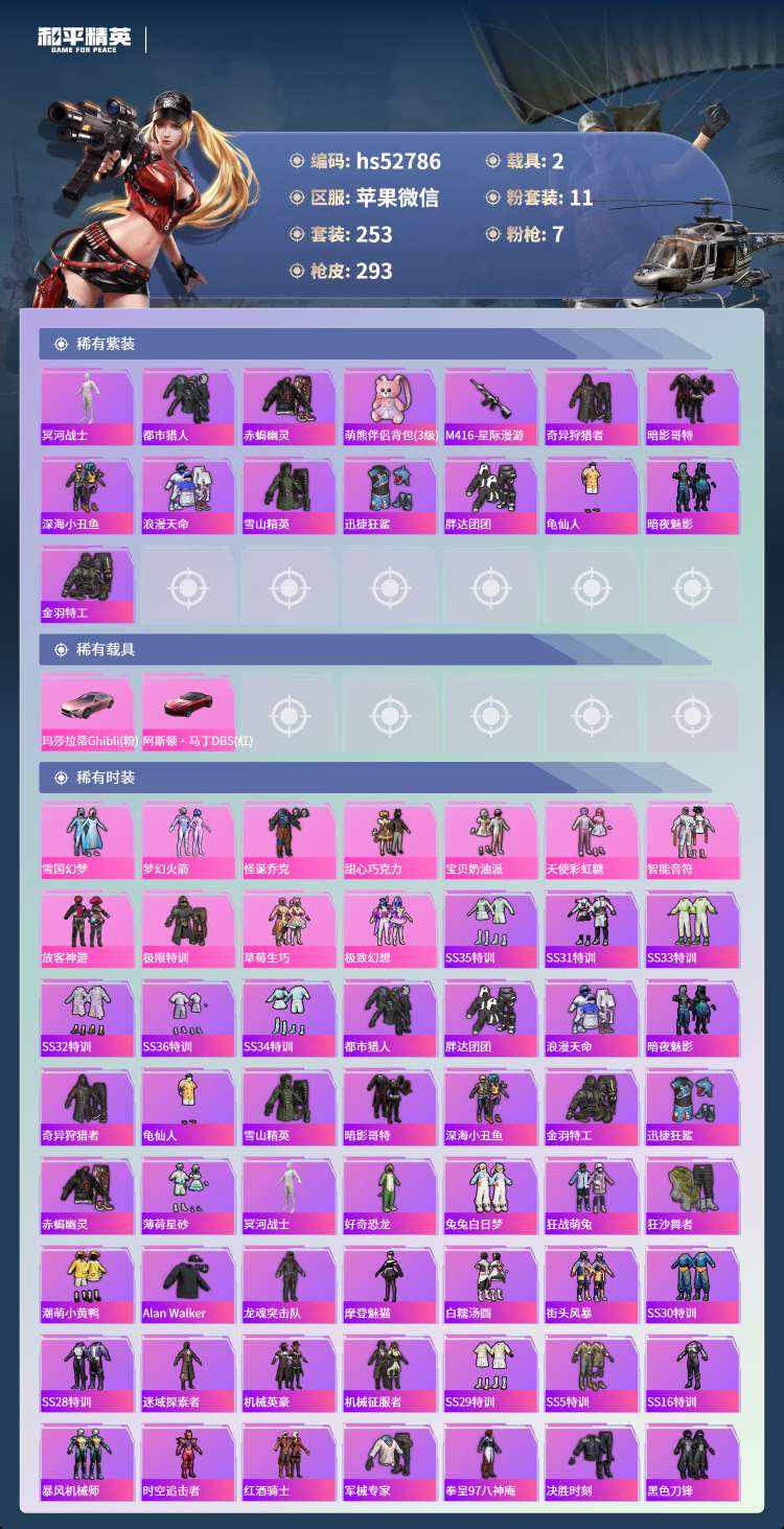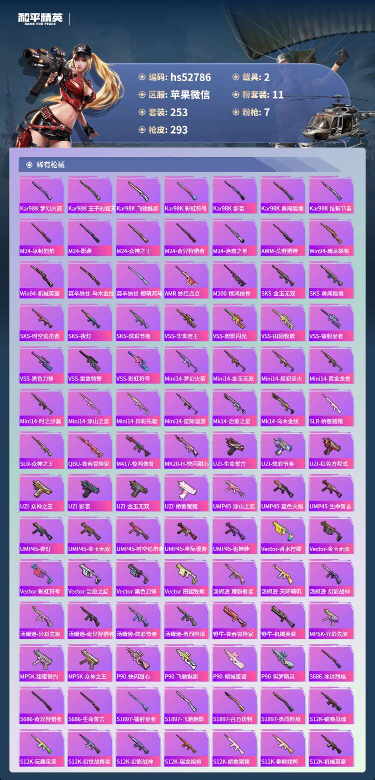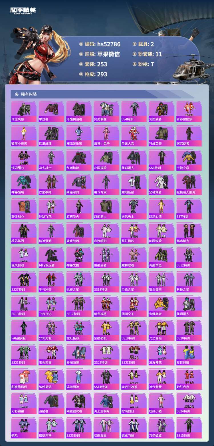 hs52786 苹果微-14王牌印记-11粉装-7特效枪-2载具-98223热力值-253套装-2