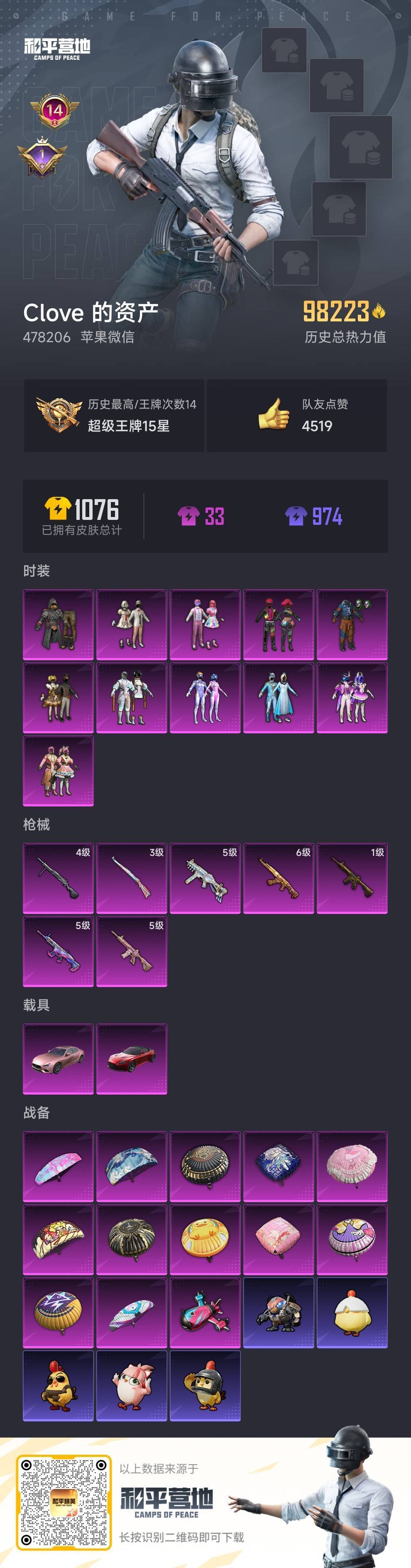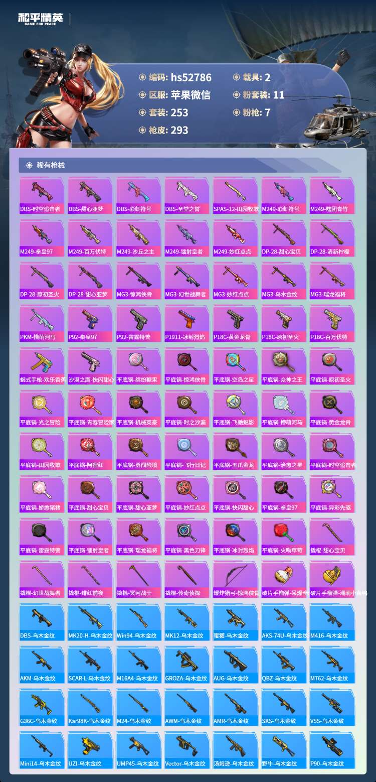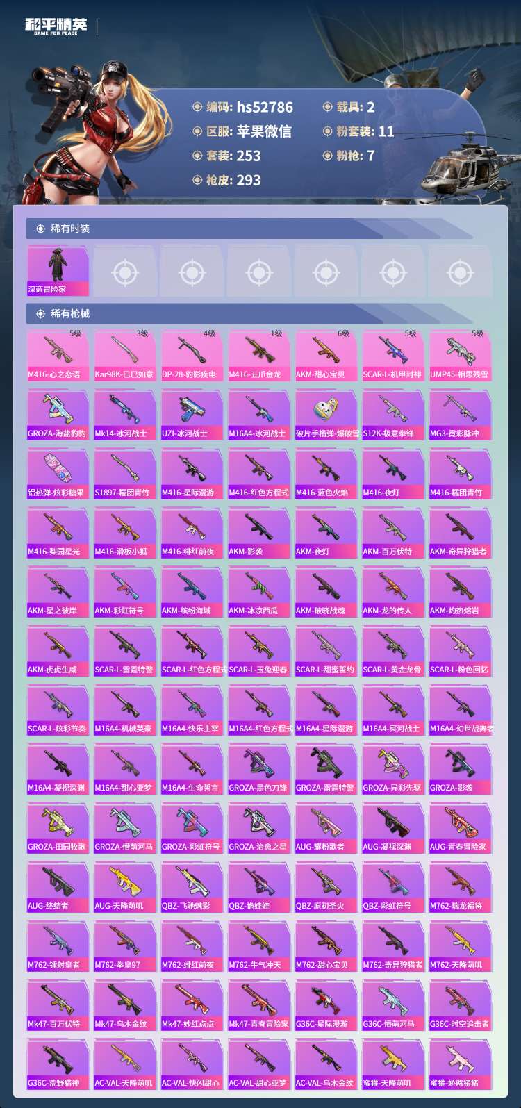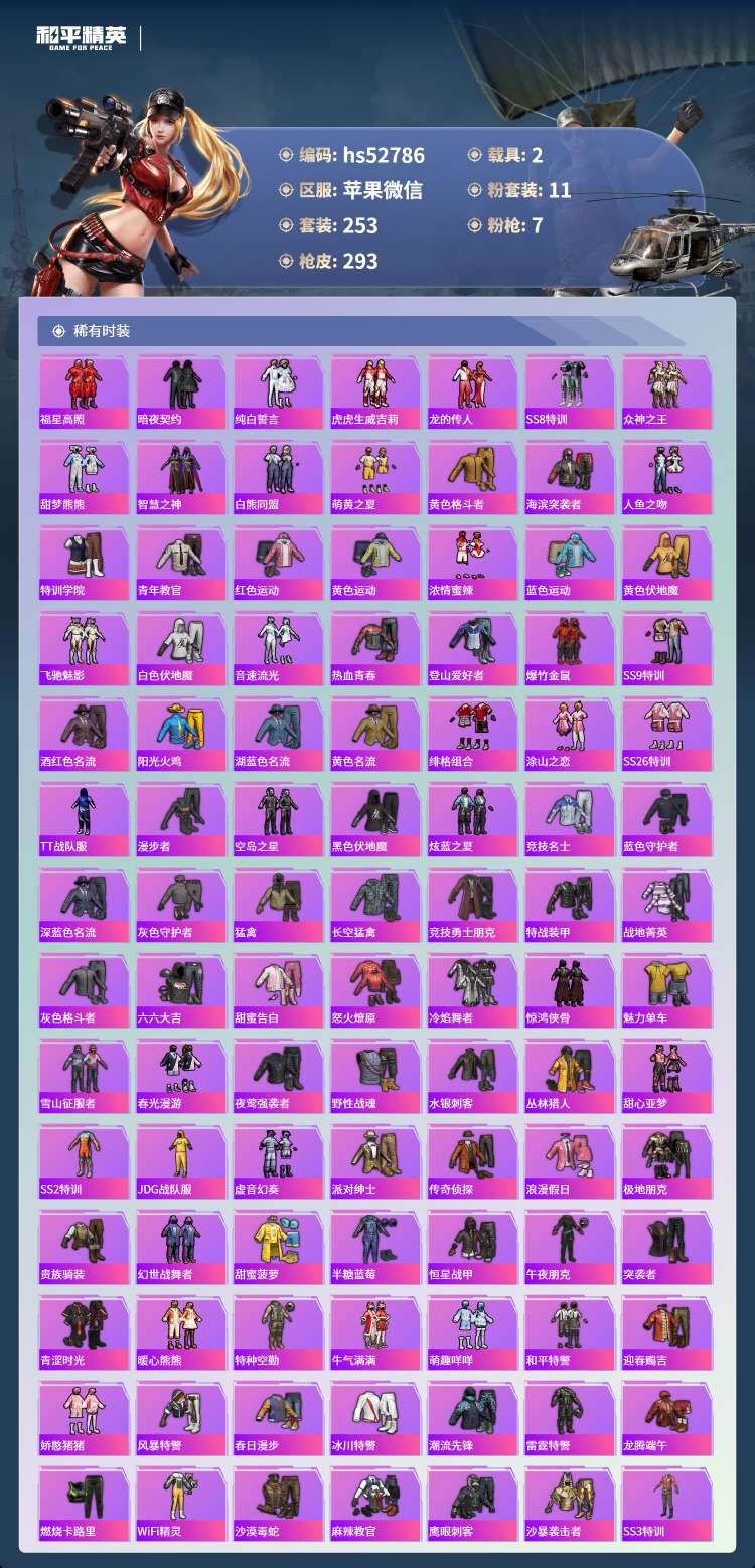 hs52786 苹果微-14王牌印记-11粉装-7特效枪-2载具-98223热力值-253套装-2