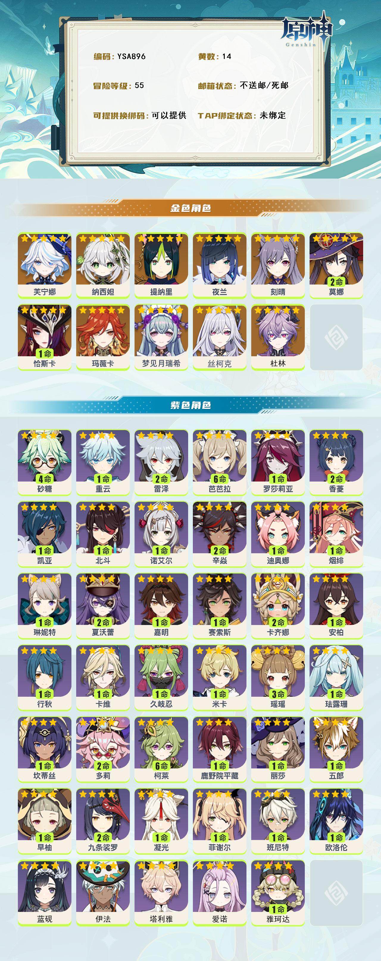 【YSA896】55级/14黄/女主/14个五星角色/0命杜林/0命丝柯克/梦见月瑞希/玛薇卡/1命恰斯卡/芙宁娜/纳西妲/提纳里/夜兰/刻晴/2命莫娜/1命雅珂达/0命爱诺/0命塔利雅/0命伊法/0命蓝砚/0命欧洛伦/2命卡齐娜/1命赛索斯/嘉明/2命夏沃蕾/琳妮特/卡维/1命米卡/3命瑶瑶/1命珐露珊/1命坎蒂丝/2命多莉/满命柯莱/鹿野院平藏/1命久岐忍/0命五郎/2命九条裟罗/0命早柚/1命烟绯/1命罗莎莉亚/2命辛焱/迪奥娜/4命砂糖/2命雷泽/0命菲谢尔/0命丽莎/1命北斗/2命香菱