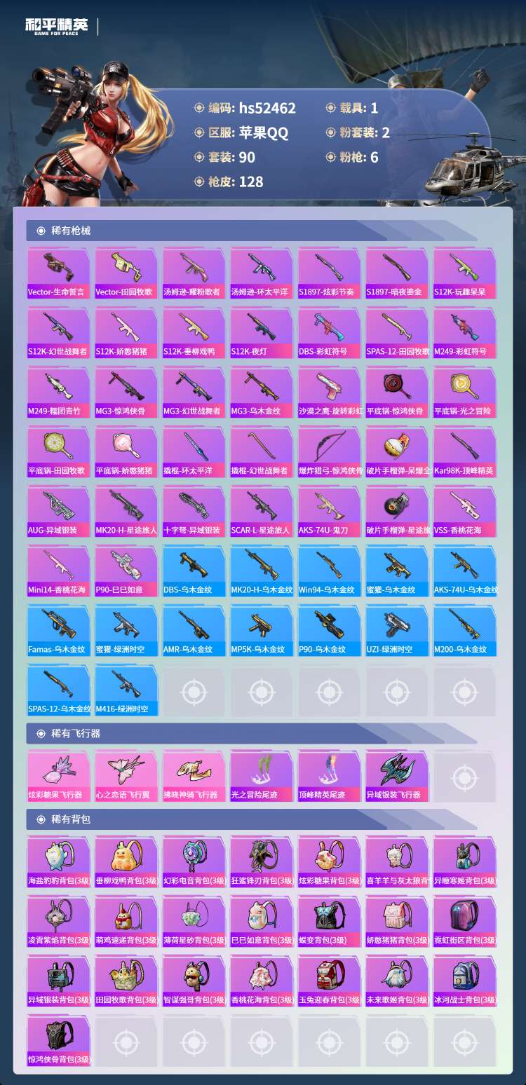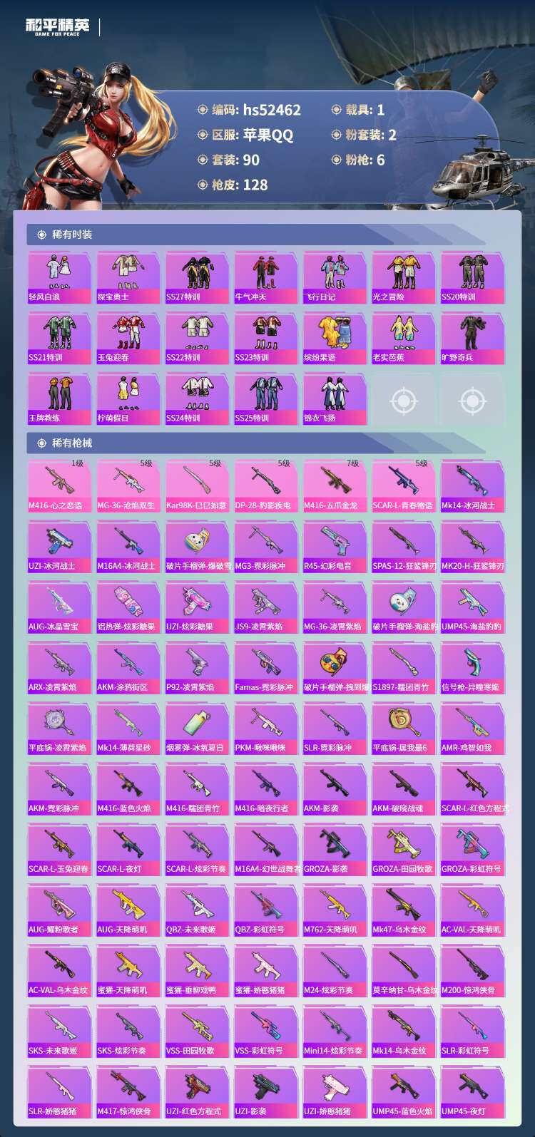 hs52462 苹果手Q-9王牌印记-2粉装-6特效枪-1载具-39892热力值-90套装-128枪