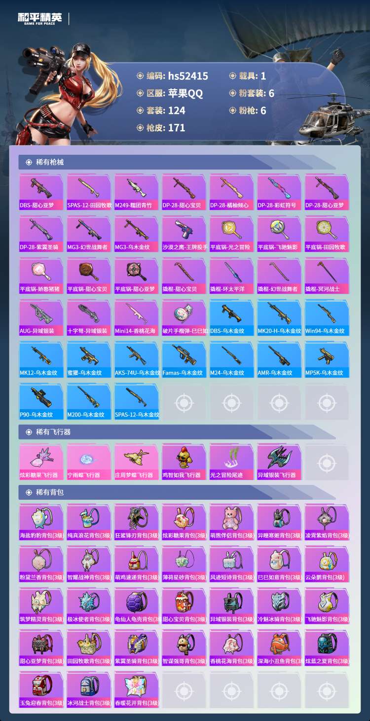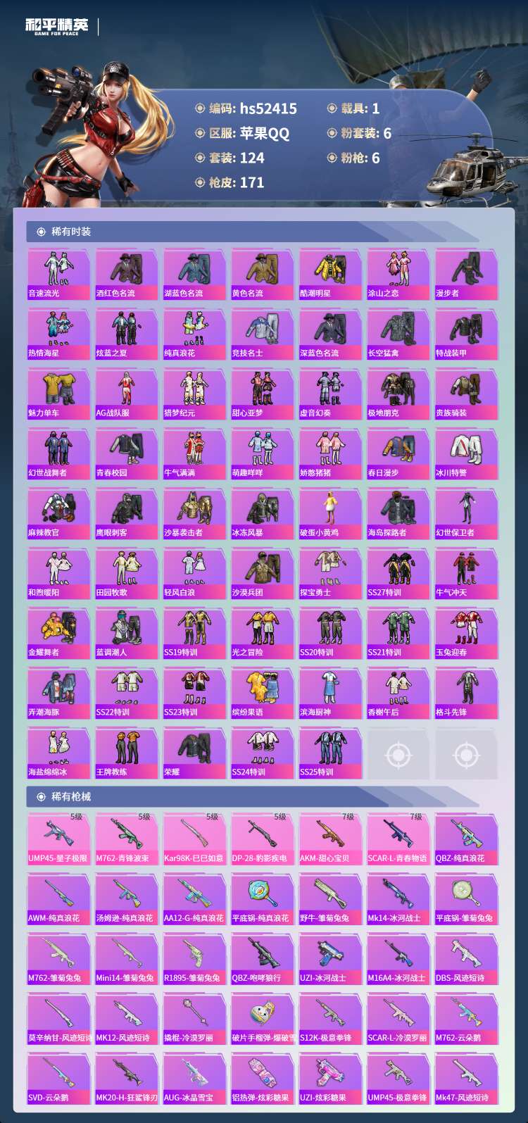 hs52415 苹果手Q-9王牌印记-6粉装-6特效枪-1载具-58653热力值-124套装-171