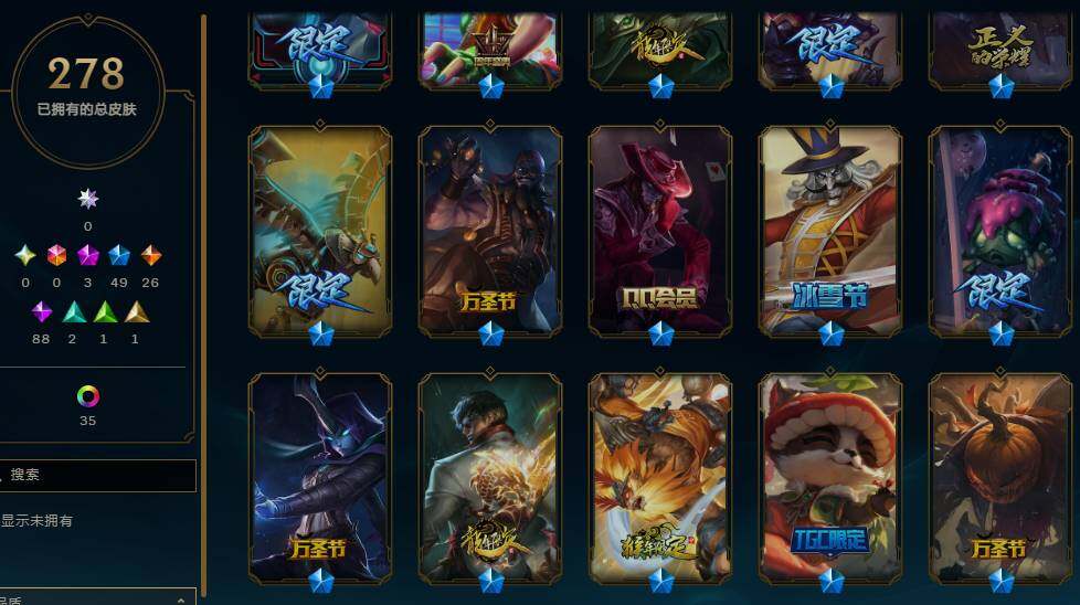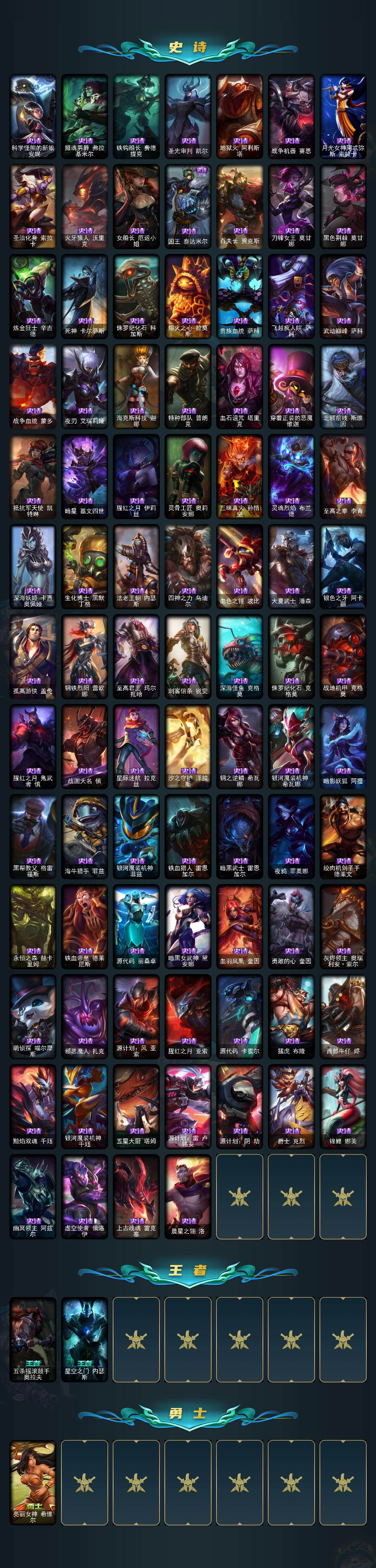 172英雄/278皮肤/3神话/49限定/7臻彩/45炫彩/26传说/88史诗/铂金/