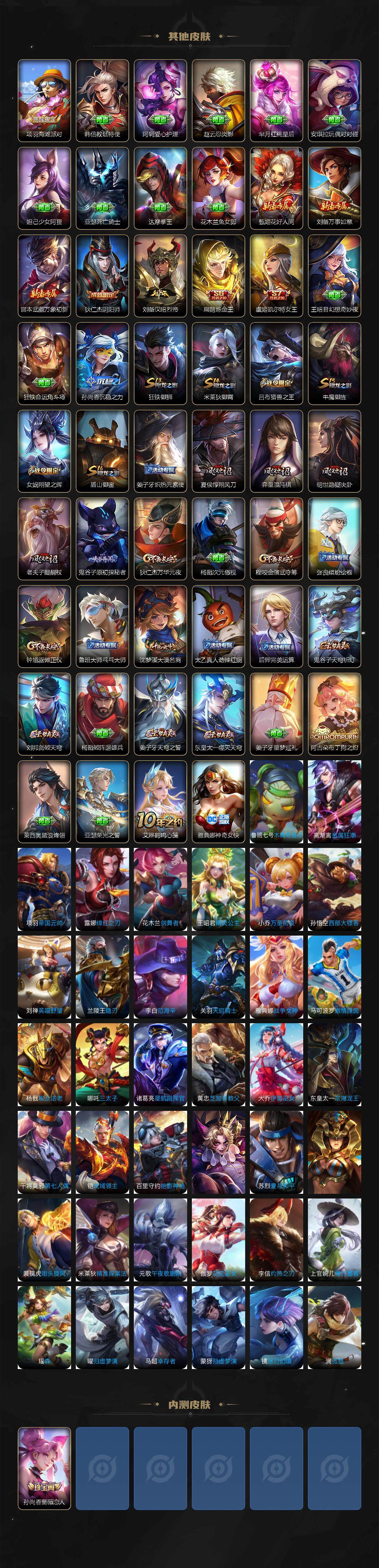 【限定皮肤】:姜子牙天穹之誓,杨戬破阵退雄兵,狄仁杰阴阳师,虞姬凯尔特女王,赵云皇家上将,赵云引擎之心,嬴政白昼王子,孙尚香蔷薇恋人,扁鹊炼金王,吕布猎兽之王,夏侯惇朔风刀,典韦蓝屏警告,狄仁杰魔术师,狄仁杰万华元夜,项羽海滩派对,老夫子醍醐