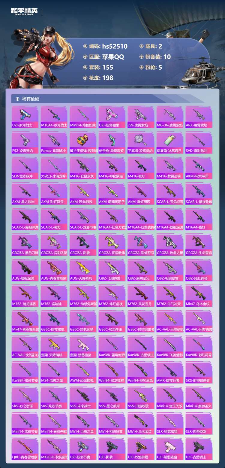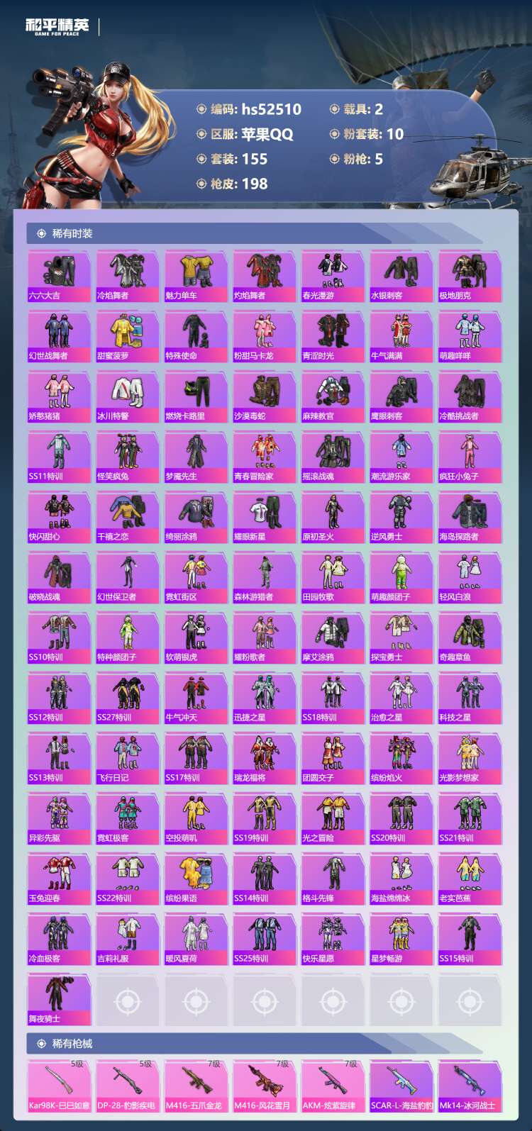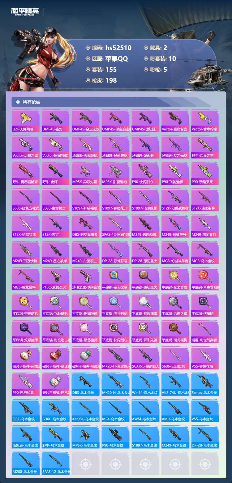 hs52510 安卓手Q-12王牌印记-10粉装-5特效枪-2载具-71206热力值-155套装-1