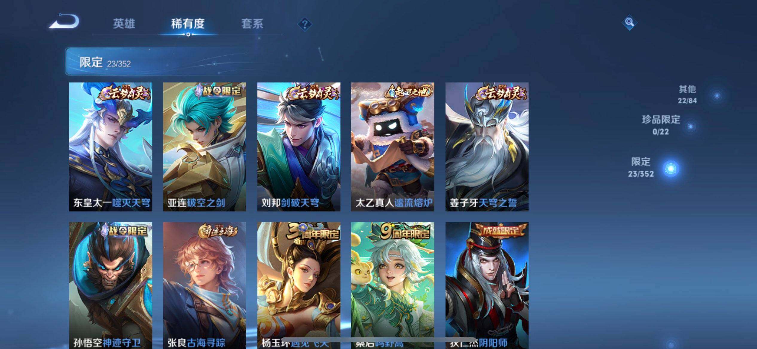 【限定皮肤】:蒙犽顽岩魄,姜子牙天穹之誓,狄仁杰阴阳师,赵云皇家上将,项羽海滩派对,杨玉环遇见飞天,鲁班大师探海日志,阿古朵江河有灵,张良古海寻