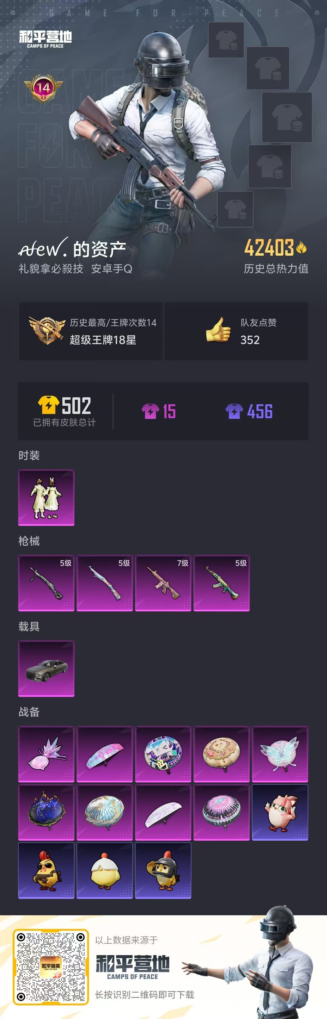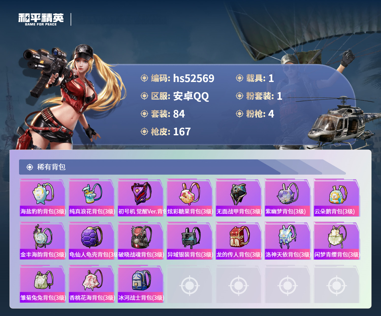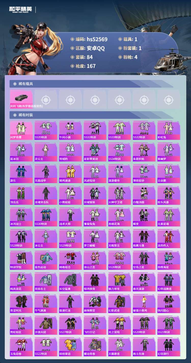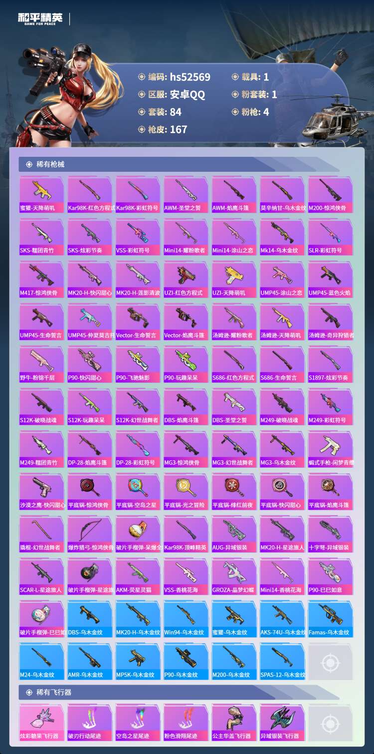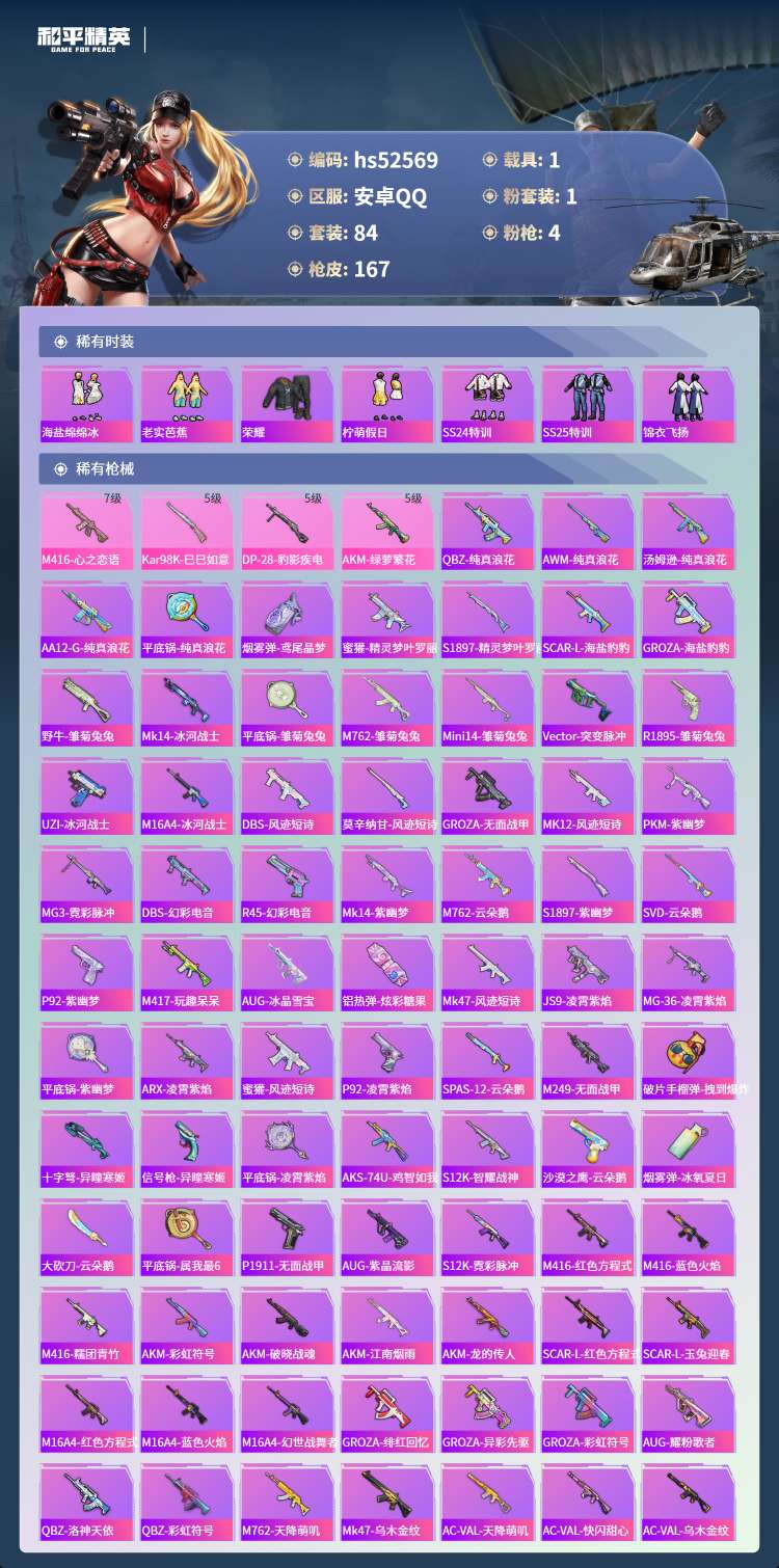 hs52569 安卓手Q-14王牌印记-1粉装-4特效枪-1载具-42403热力值-84套装-167