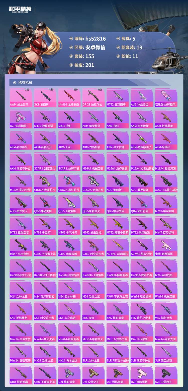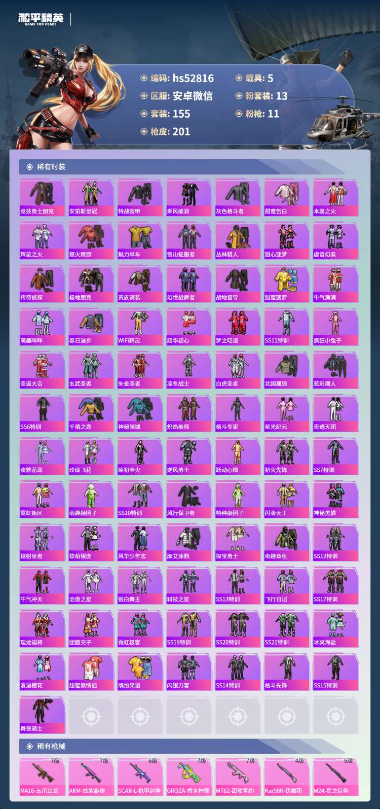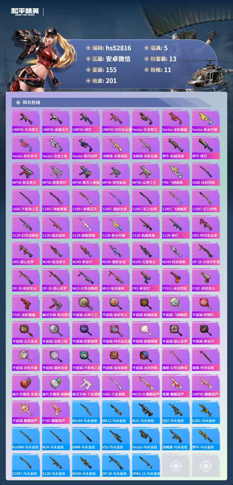hs52816 安卓v-14王牌印记-13粉装-11特效枪-5载具-87967热力值-155套装-