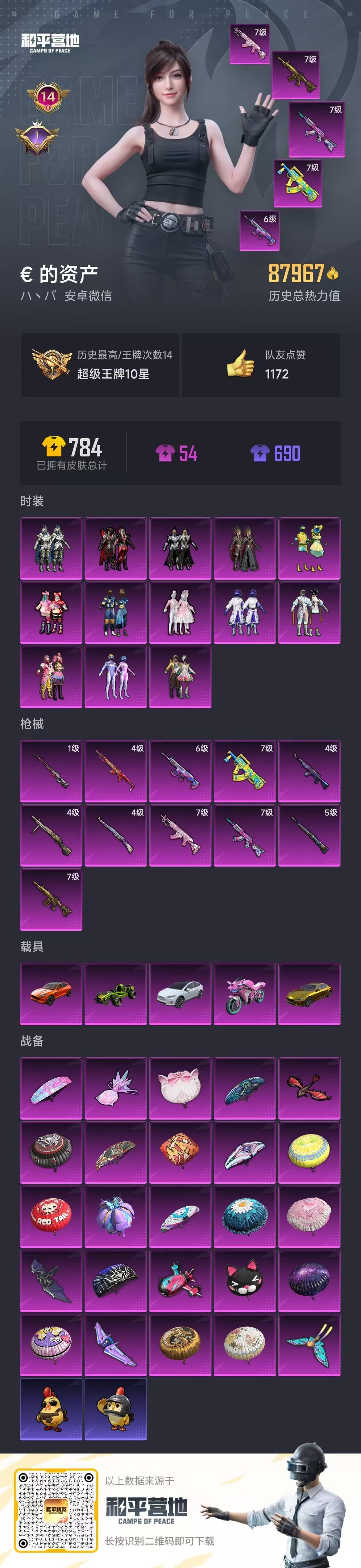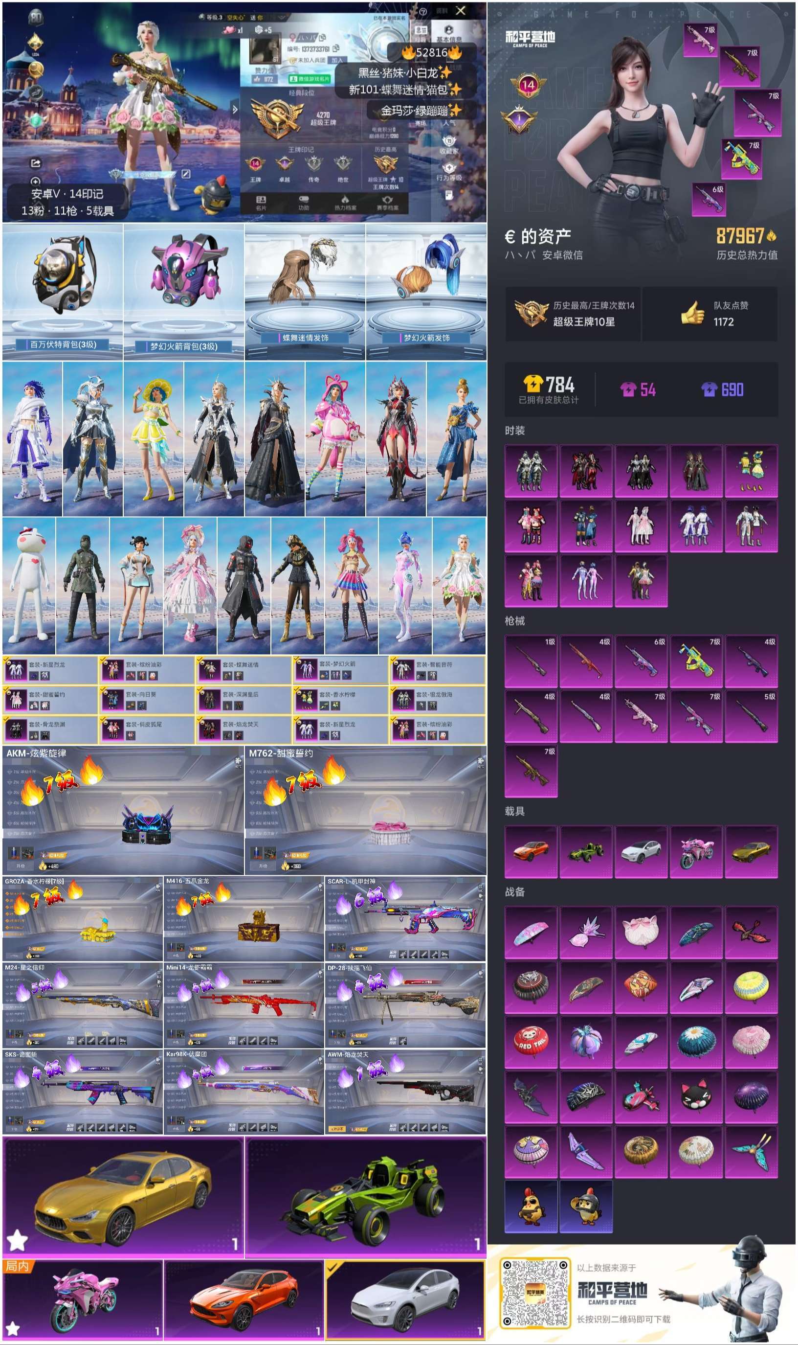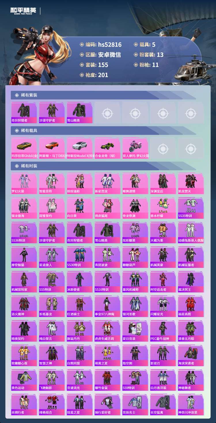 hs52816 安卓v-14王牌印记-13粉装-11特效枪-5载具-87967热力值-155套装-
