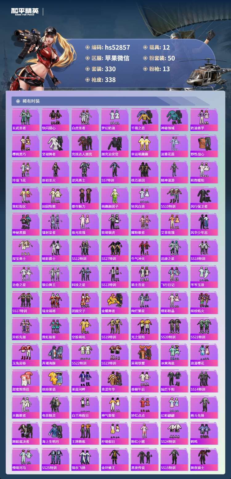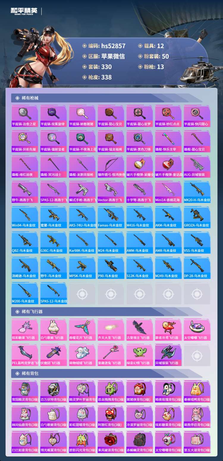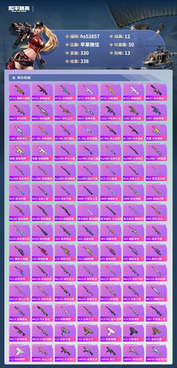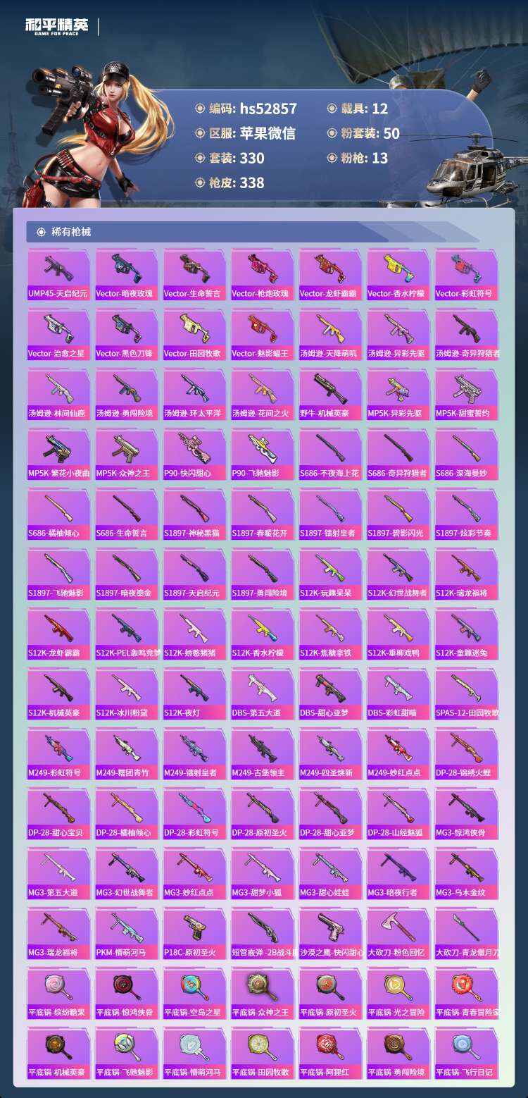 hs52857 苹果微-13王牌印记-50粉装-13特效枪-12载具-165604热力值-330套