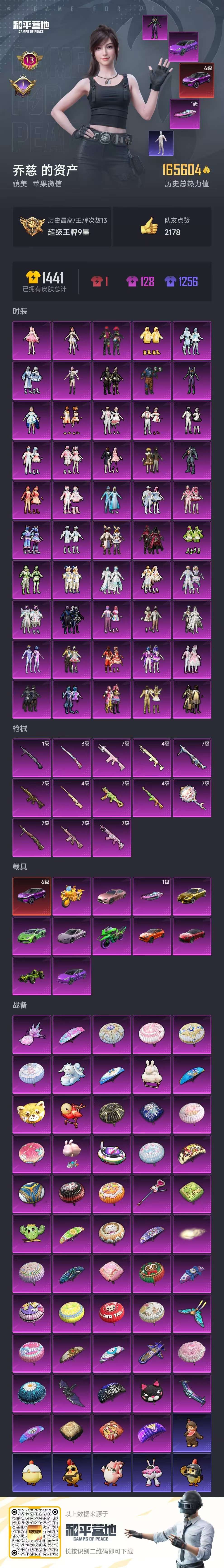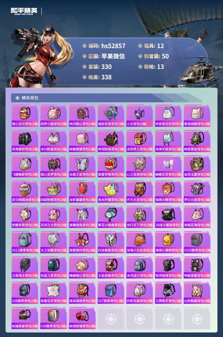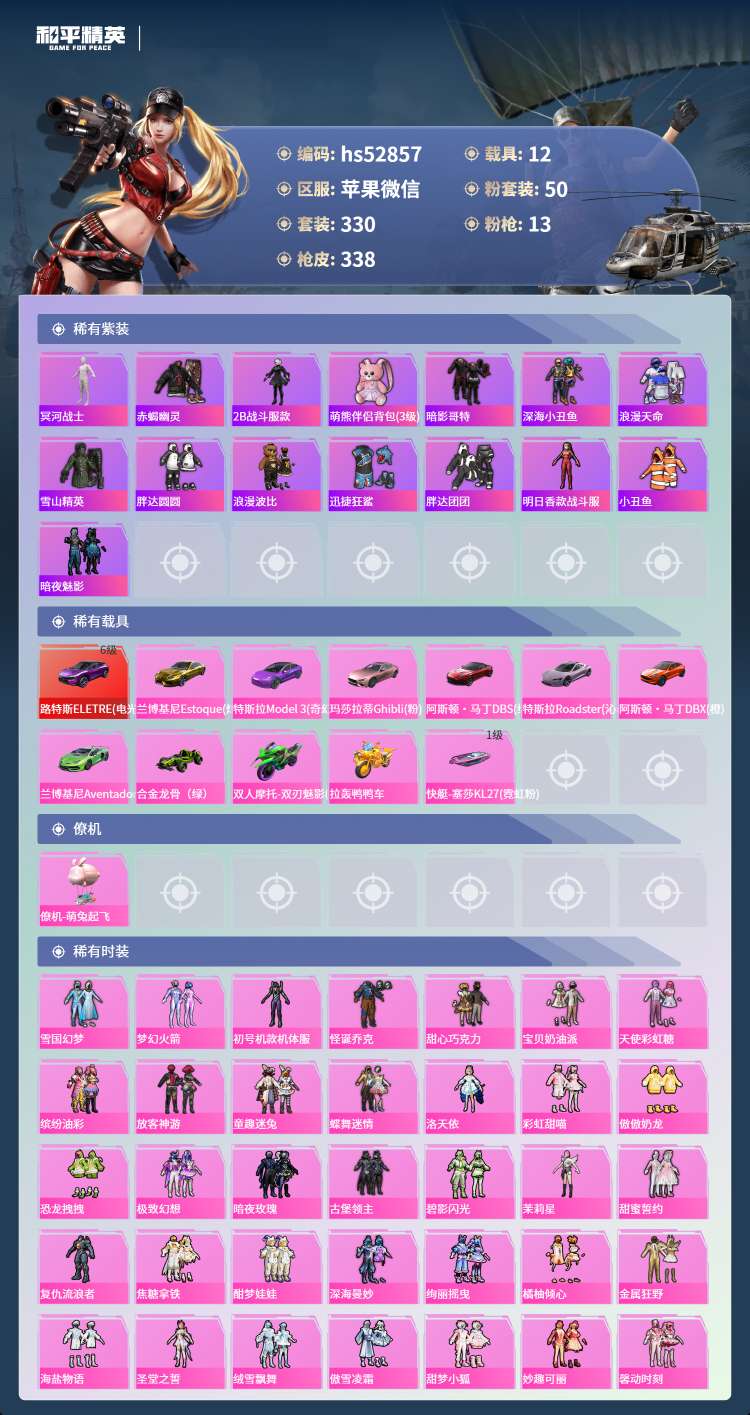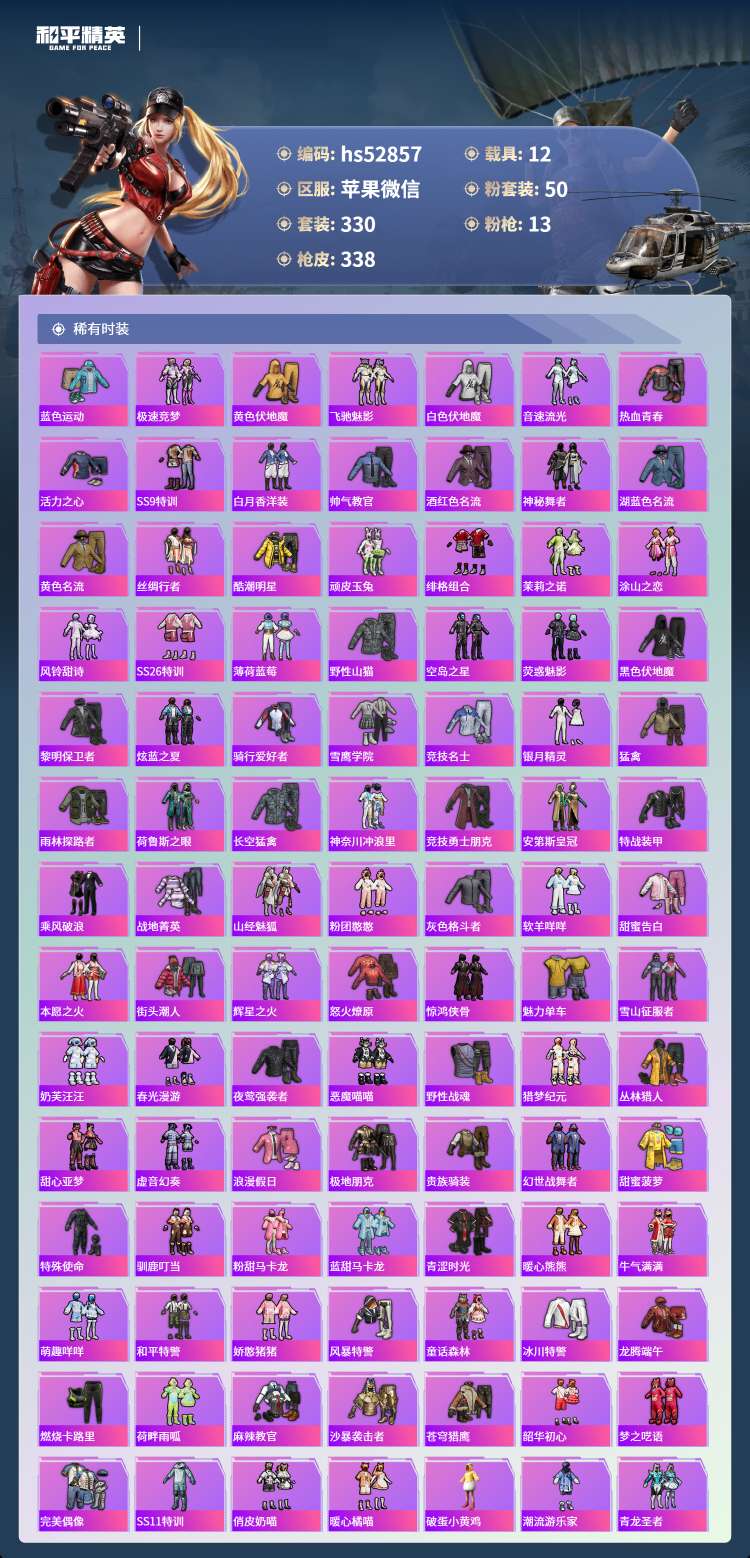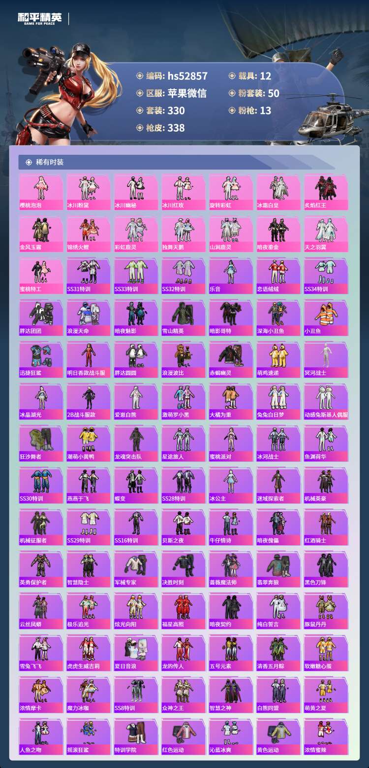 hs52857 苹果微-13王牌印记-50粉装-13特效枪-12载具-165604热力值-330套