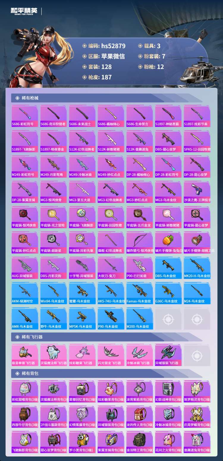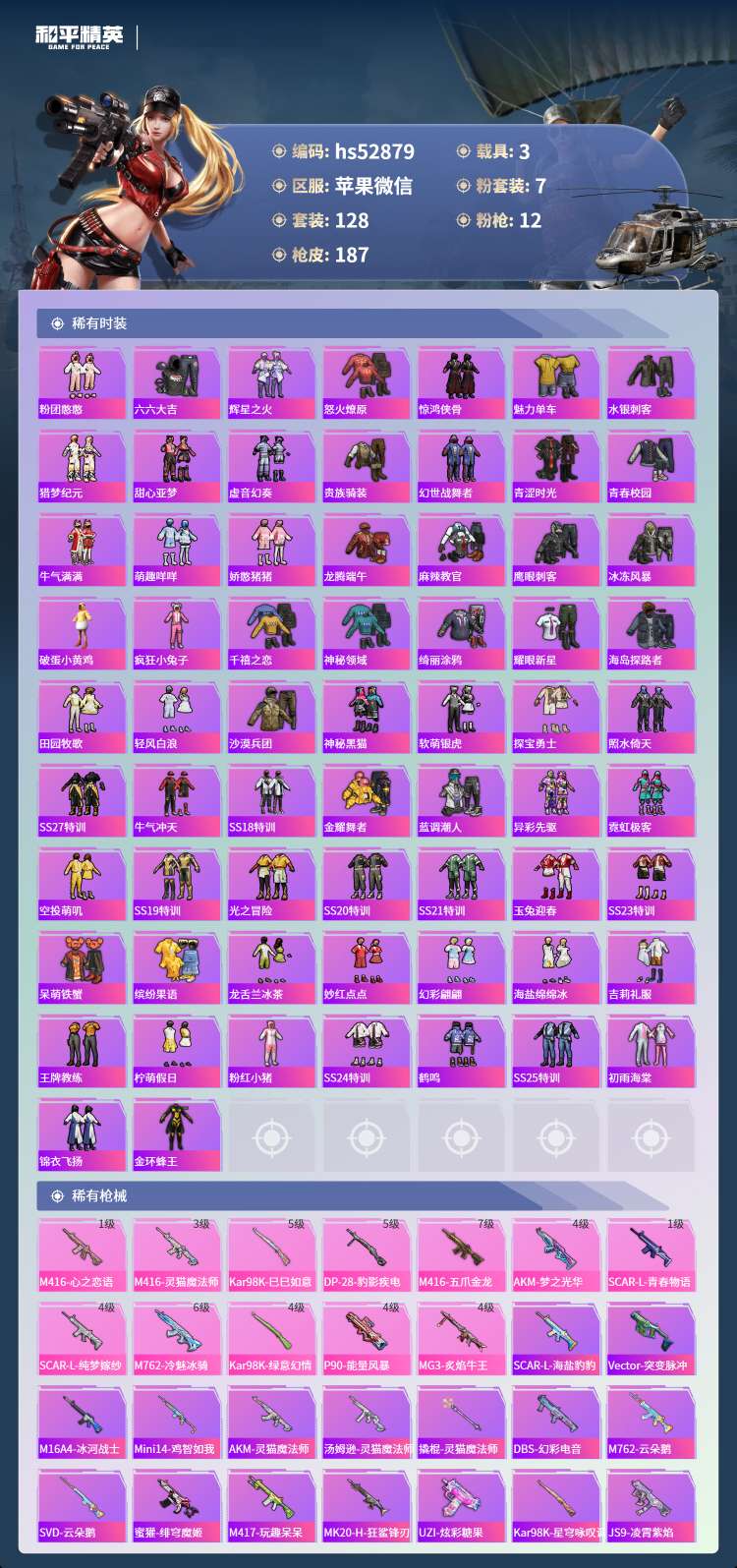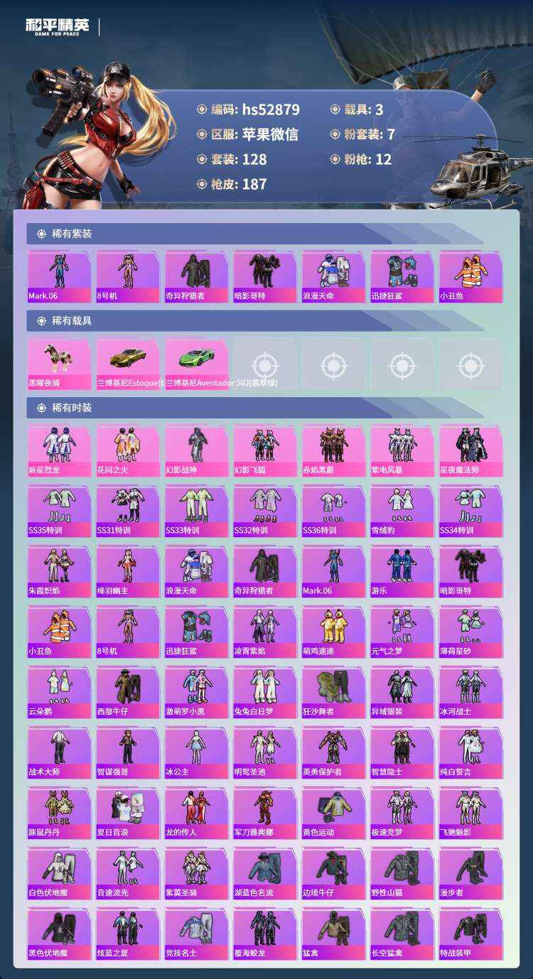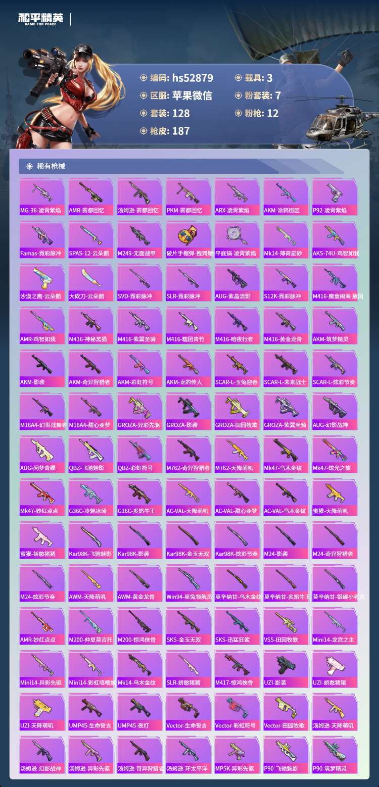 hs52879 苹果微-8王牌印记-7粉装-12特效枪-3载具-66572热力值-128套装-18