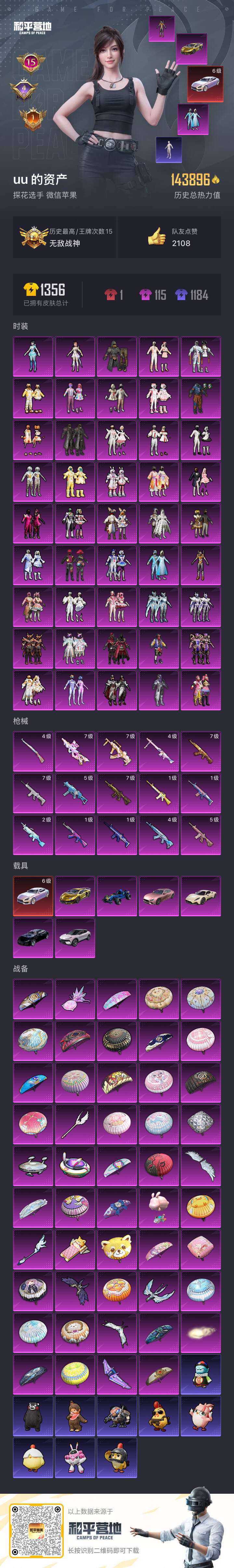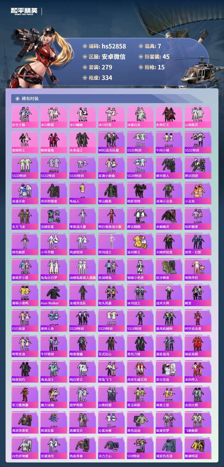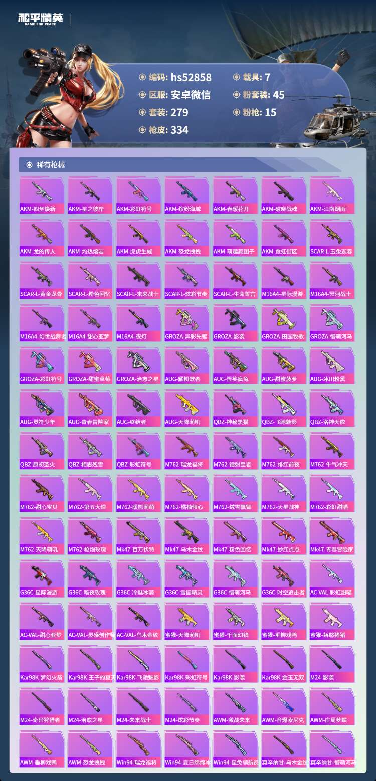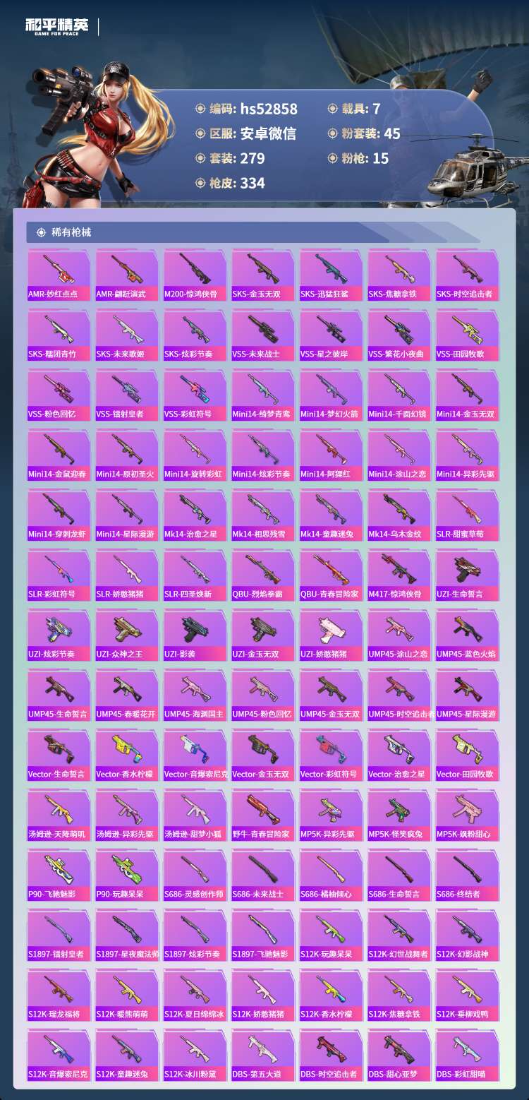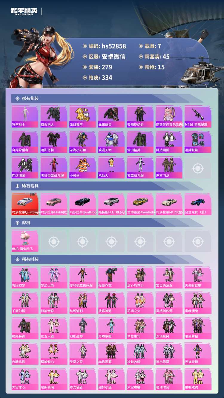 hs52858 苹果微-15王牌印记-有战神框-45粉装-15特效枪-7载具-143896热力值-