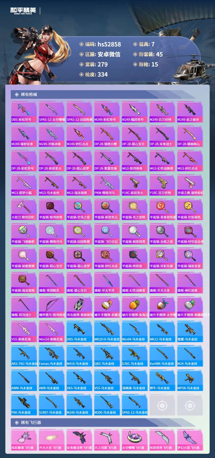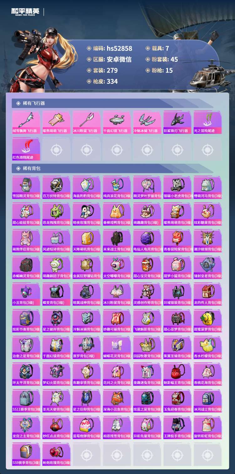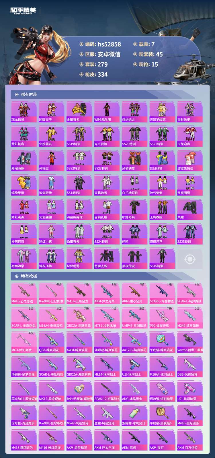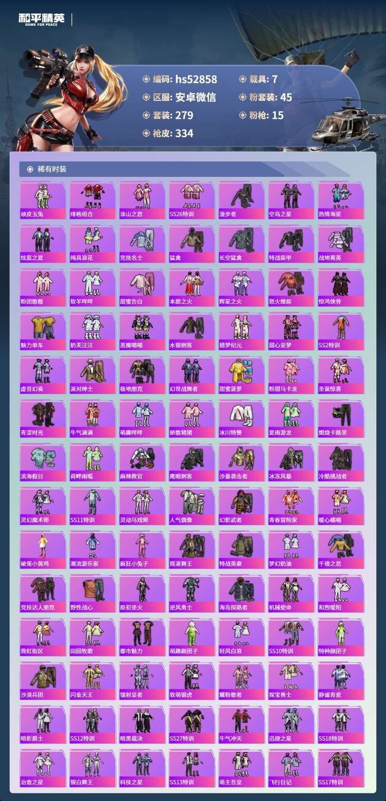 hs52858 苹果微-15王牌印记-有战神框-45粉装-15特效枪-7载具-143896热力值-