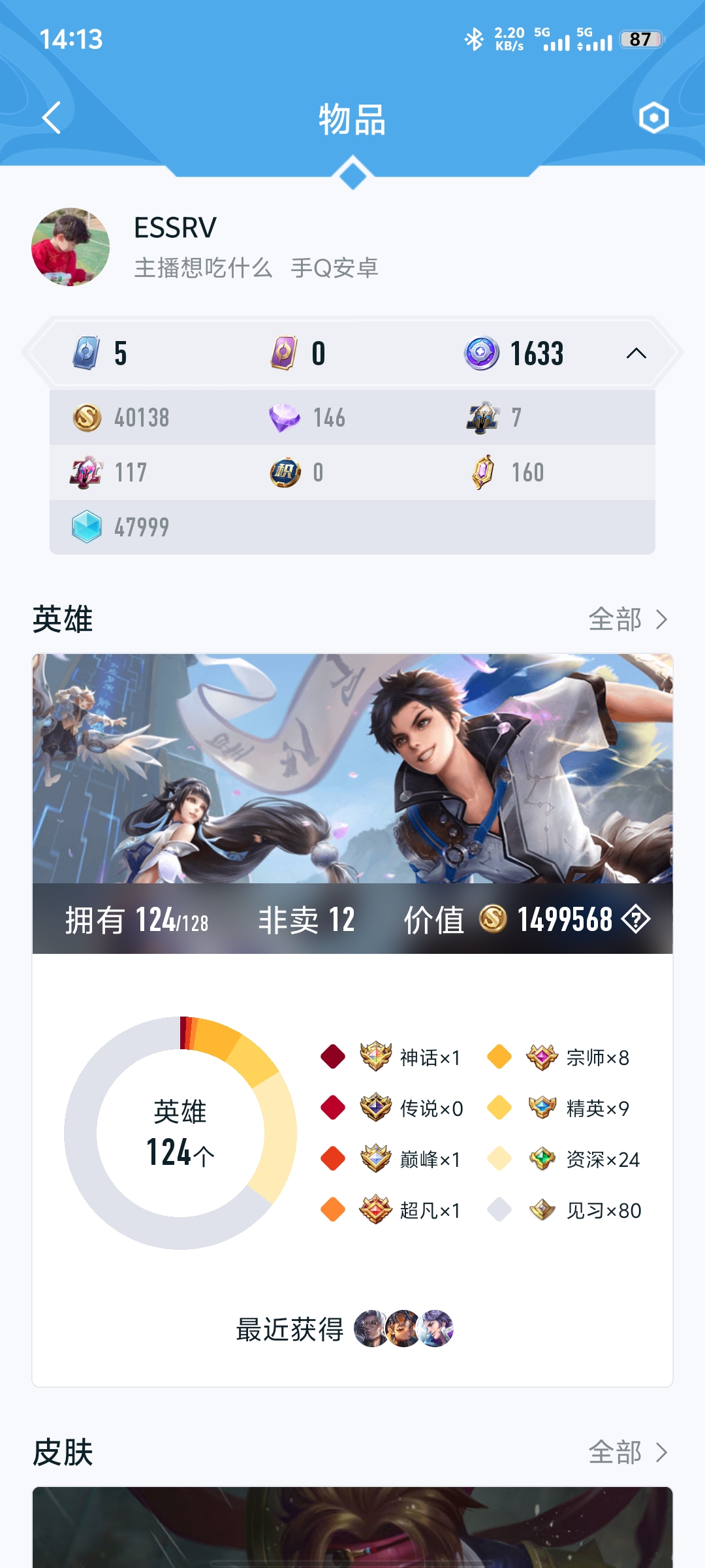 安卓QQ-4传说-116皮肤-124英雄-至尊星耀-退游了,来个好心人,还有和平连体号对了,地铁国际服还有1套手册,衣服白色的,那套衣服很火