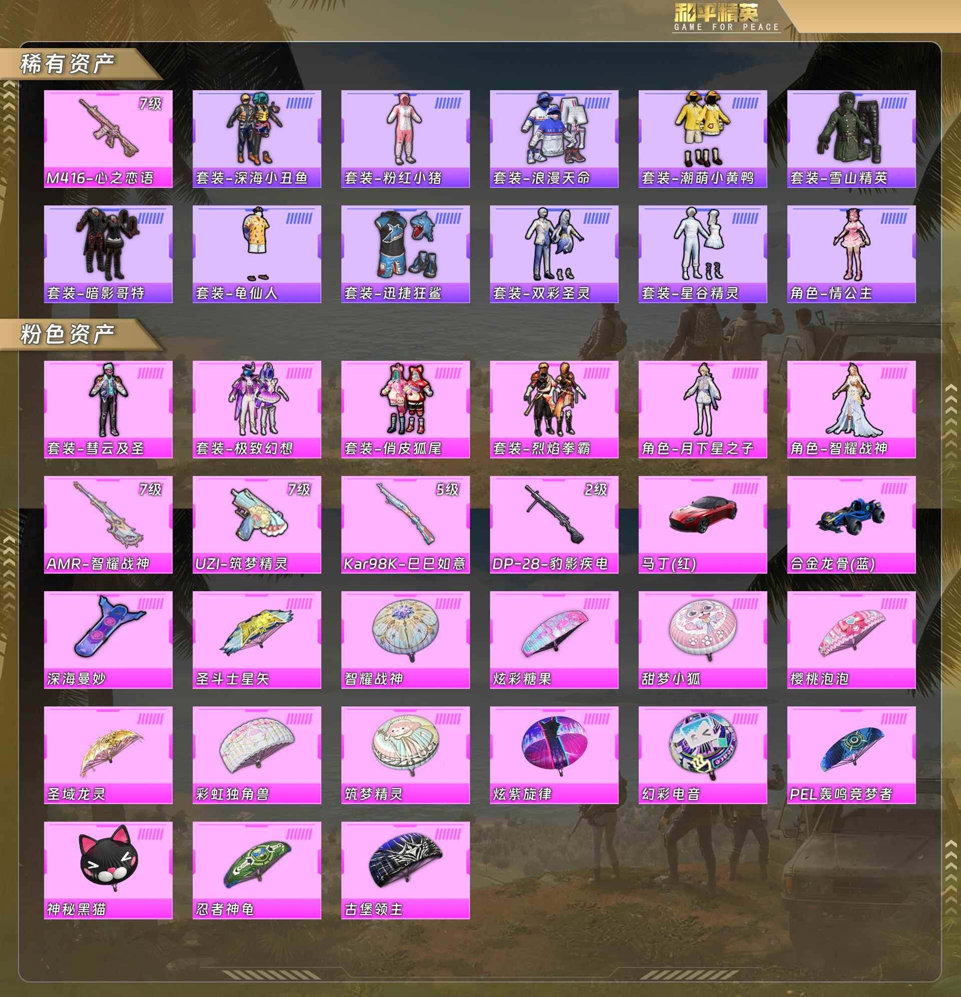 身法号-红眼罩/浪漫天命/深海小丑鱼/粉红小猪/老六服/迅捷狂鲨/双彩圣灵/星谷精灵/彗云及圣/极致幻想/俏皮狐尾/烈焰拳霸/月下星之子/智耀战神【枪皮】M4心之恋语7级/AMR智耀战神7级/UZI筑梦精灵7级/98K巳巳如意5级/DP28豹影疾电2级【载具】阿斯顿·马丁DBS(红)/合金龙骨(蓝) 没战神框(6粉套5粉枪2载具)HP4177-1粉色飞行器-82008热力值-18王牌印记-201